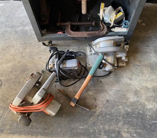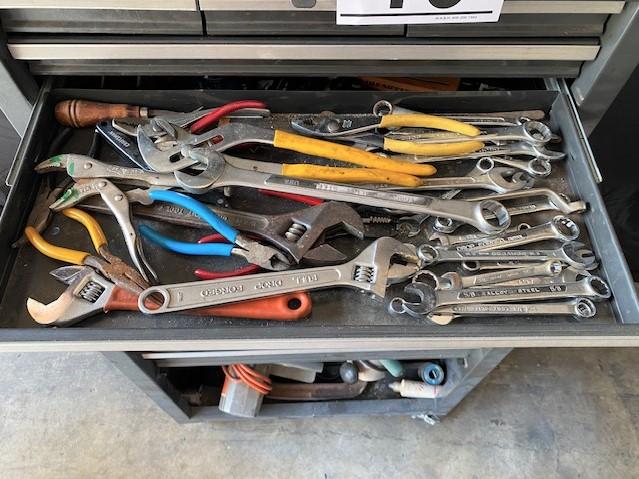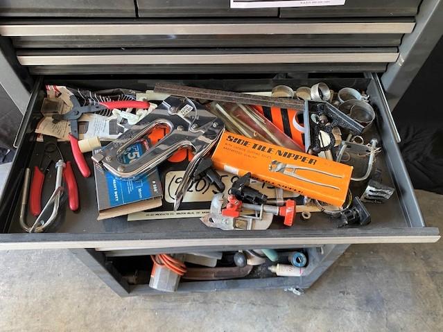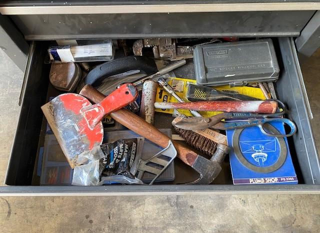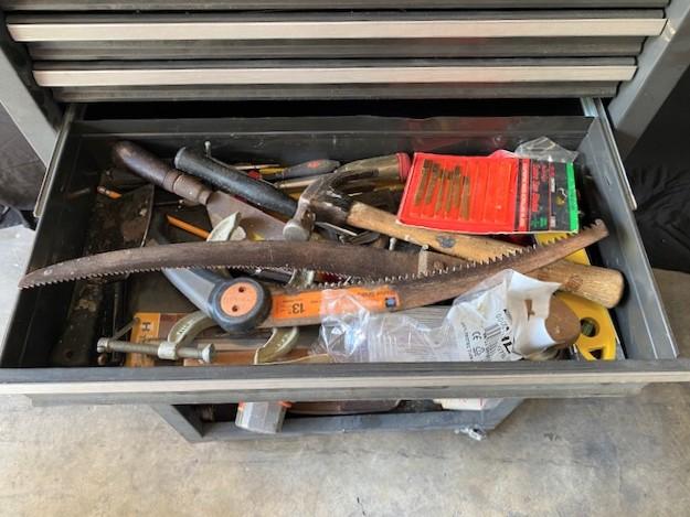 10 drawer. On casters. Front door for bulk storage is missing. Includes: circular saw, clamps, scroll saw & more. Estimated weight of lot: 200lbs. Measurement: 48"H x 27"W x 18"D