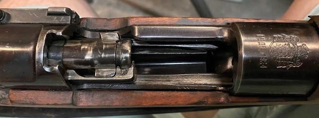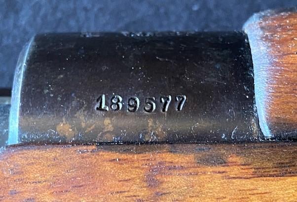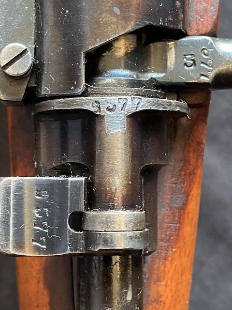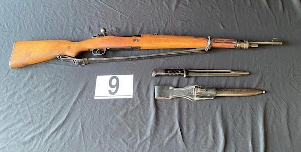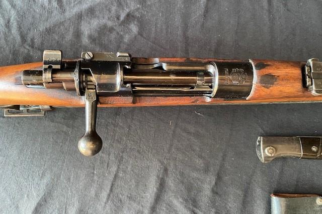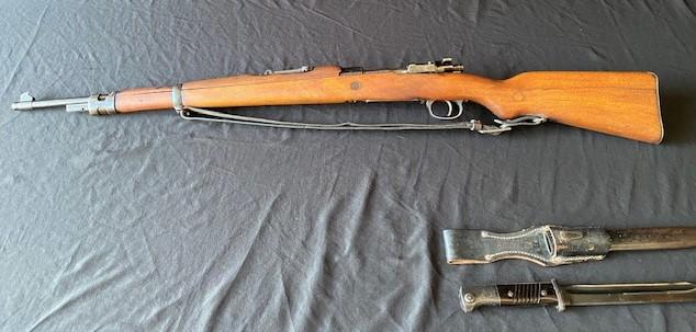 Bolt action rifle with iron sight. SN# 189377. Appears that all numbers match. Bayonet is a K98. Measurement: 43"L x 5" (Firearm). Bore light used on barrel and it appears to be clean straight through