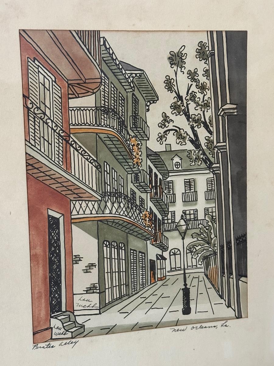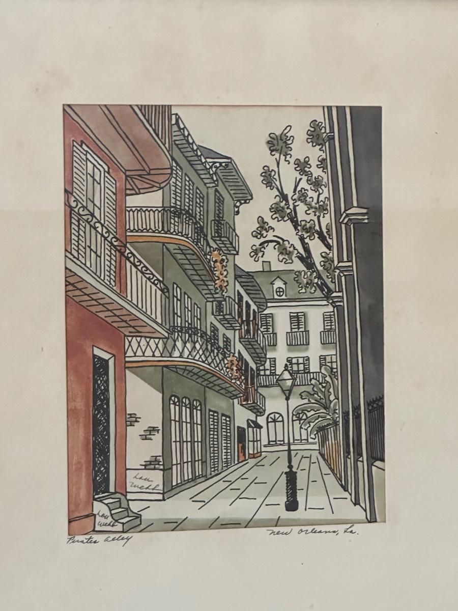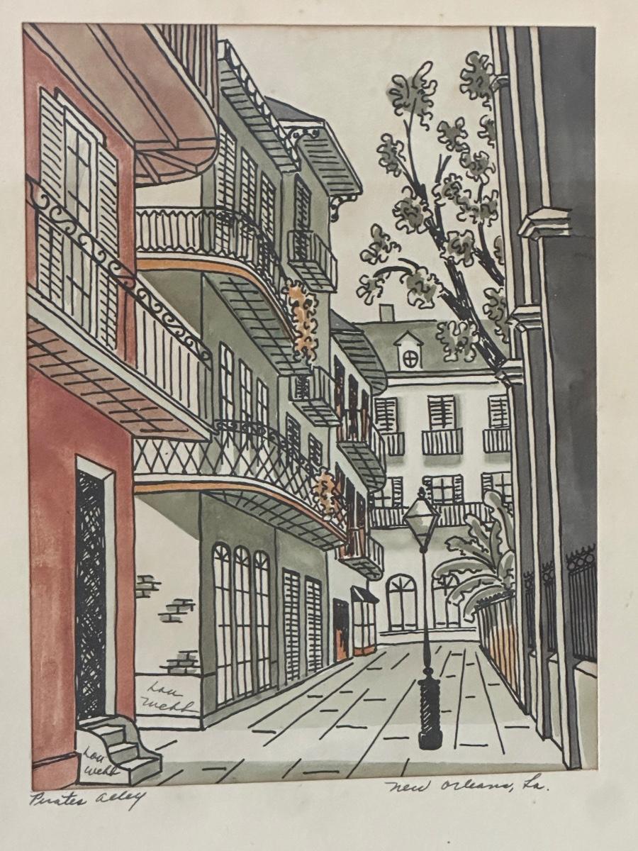 New Orleans scene by artist Lou Webb, depicting the historic Pirates Alley in the French Quarter. Signed and titled in pencil along the lower margin.