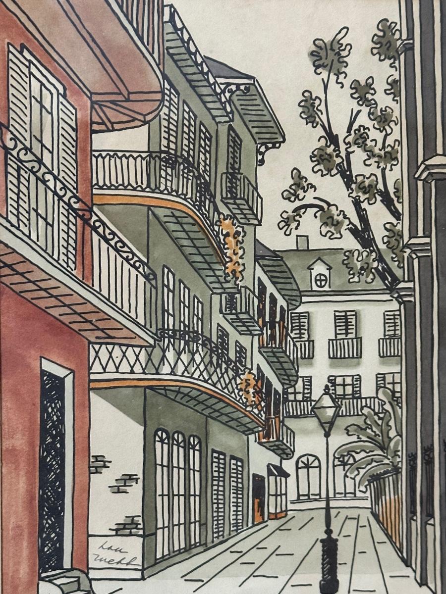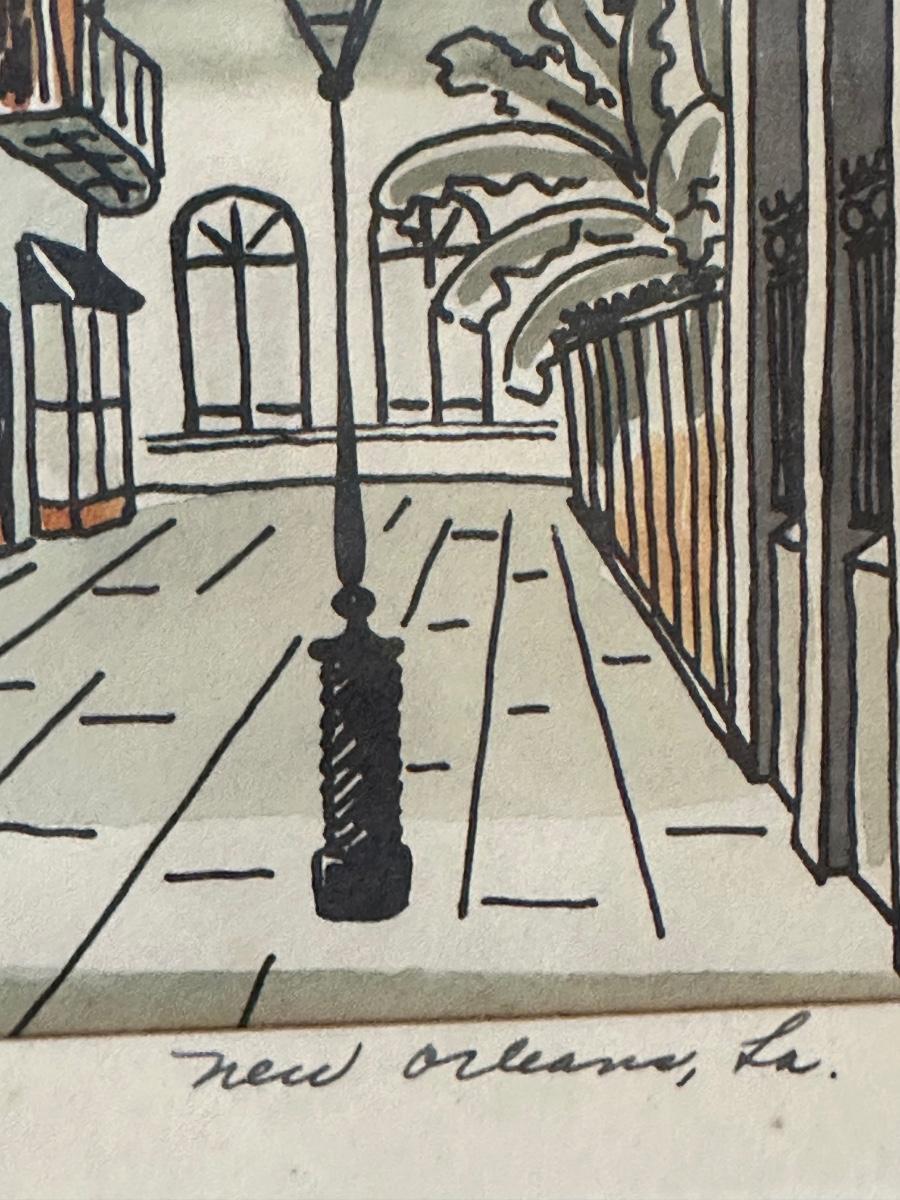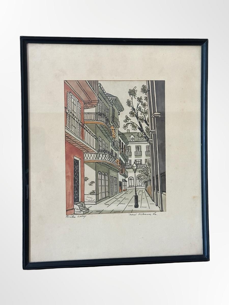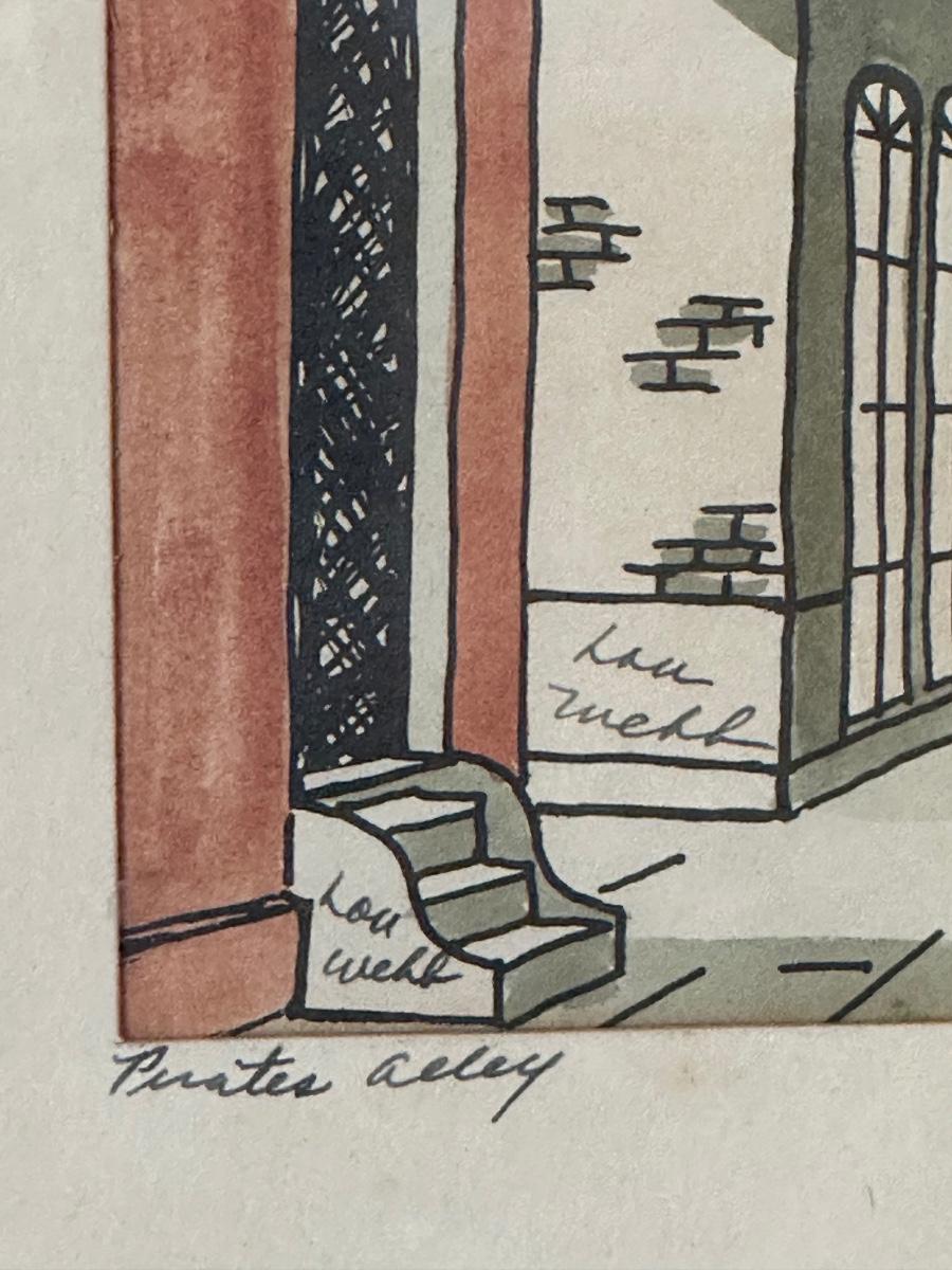 New Orleans scene by artist Lou Webb, depicting the historic Pirates Alley in the French Quarter. Signed and titled in pencil along the lower margin.
