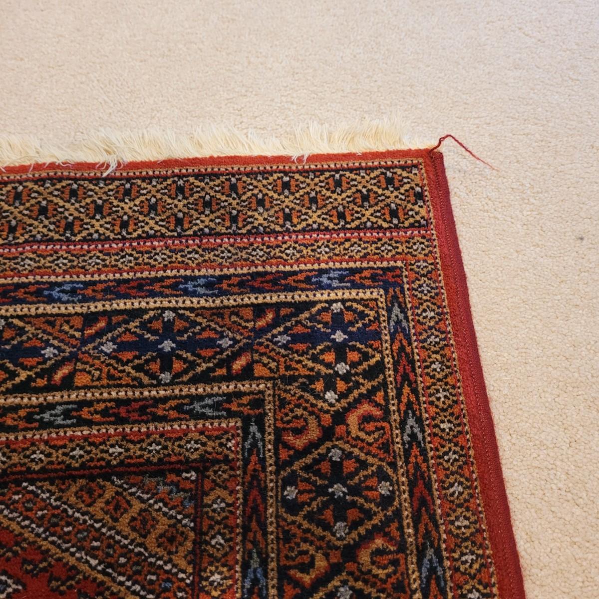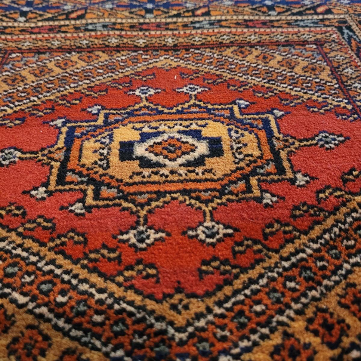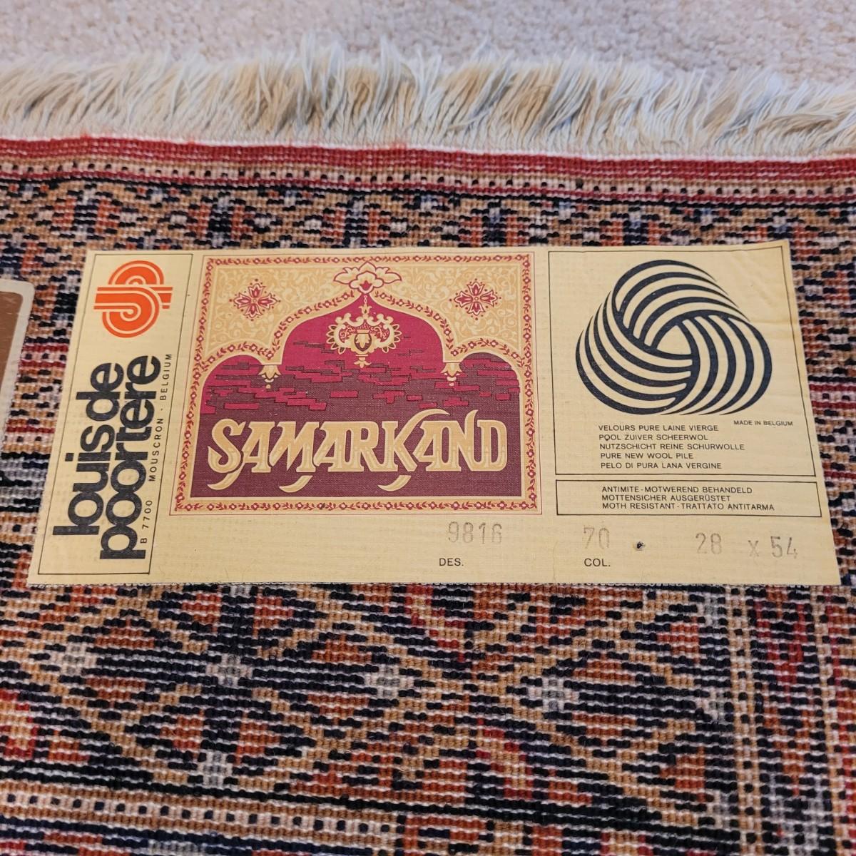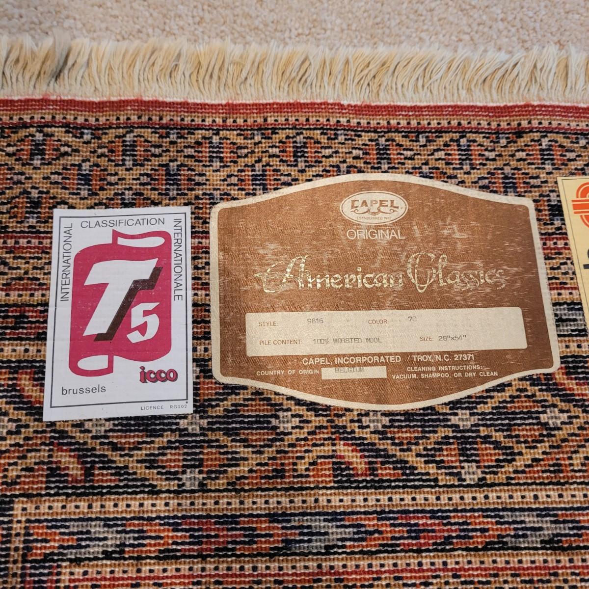 This Belgian made, 100% worsted wool area rug by Louis De Poortere has rich, deep reds, blues and golds. Measures approximately 28” x 54.” Shipping available.