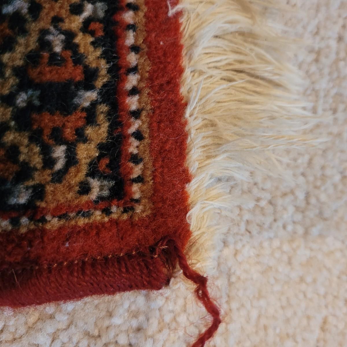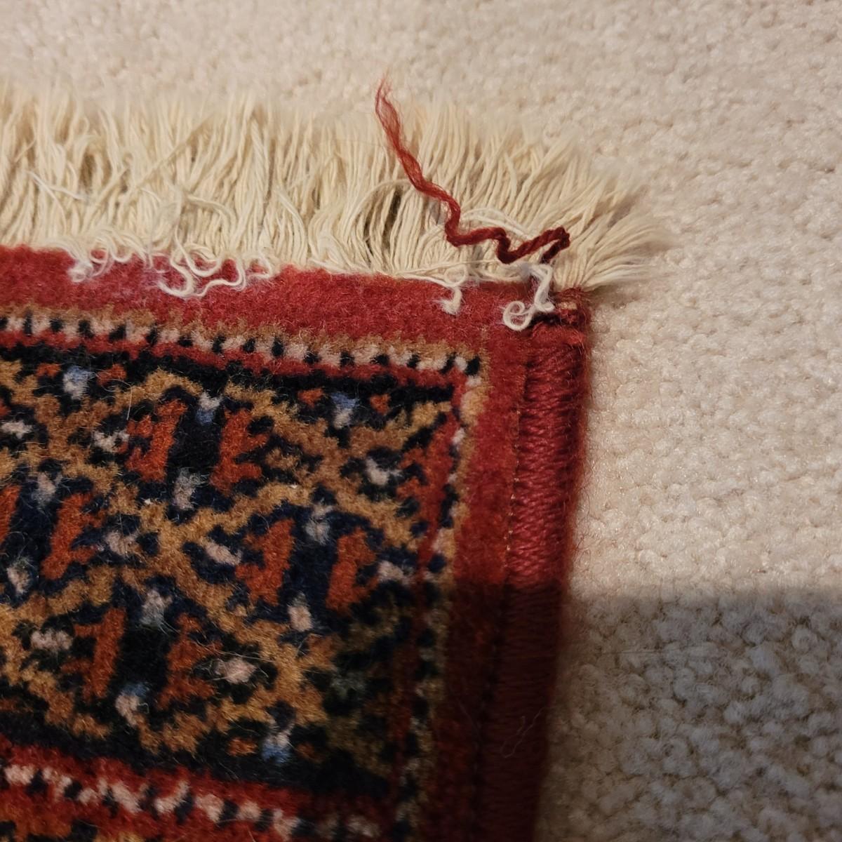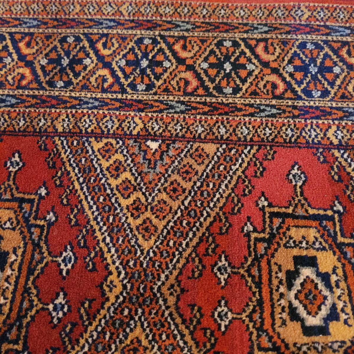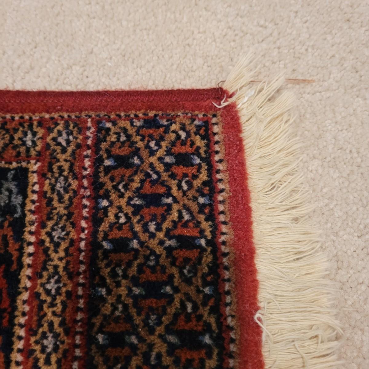This Belgian made, 100% worsted wool area rug by Louis De Poortere has rich, deep reds, blues and golds. Measures approximately 28” x 54.” Shipping available.