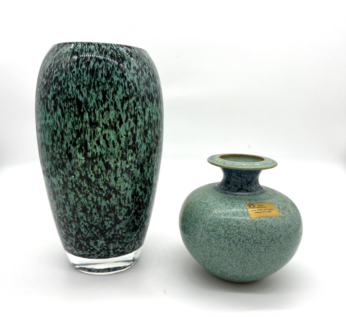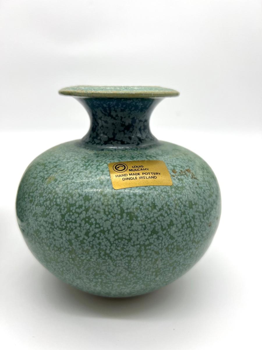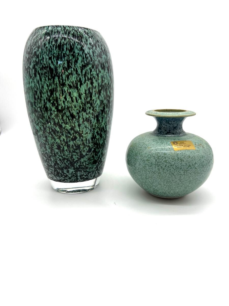 Louis Mulcahy pottery in Ireland measures 5 inches tall, 5 inches wide. Glass vase measures 9 1/2 inches tall 4 1/2 inches wide.