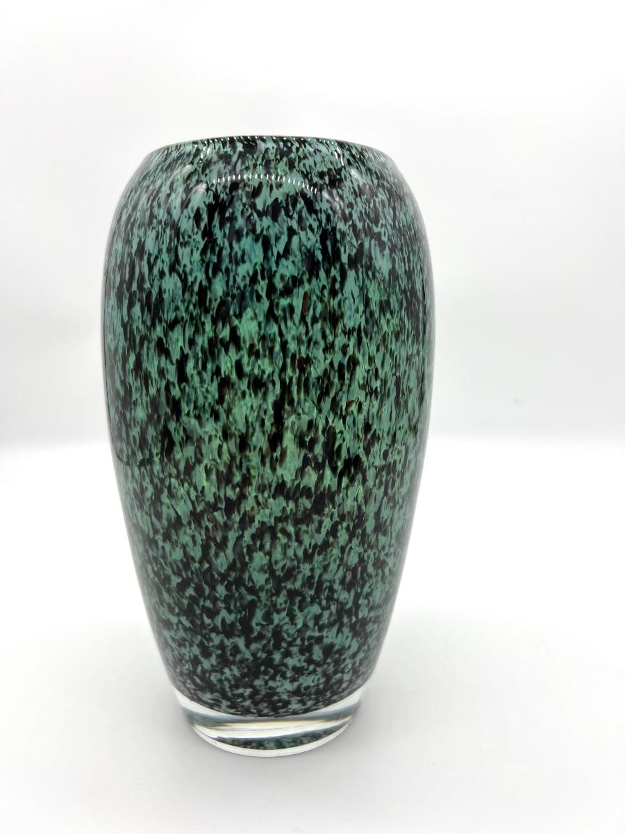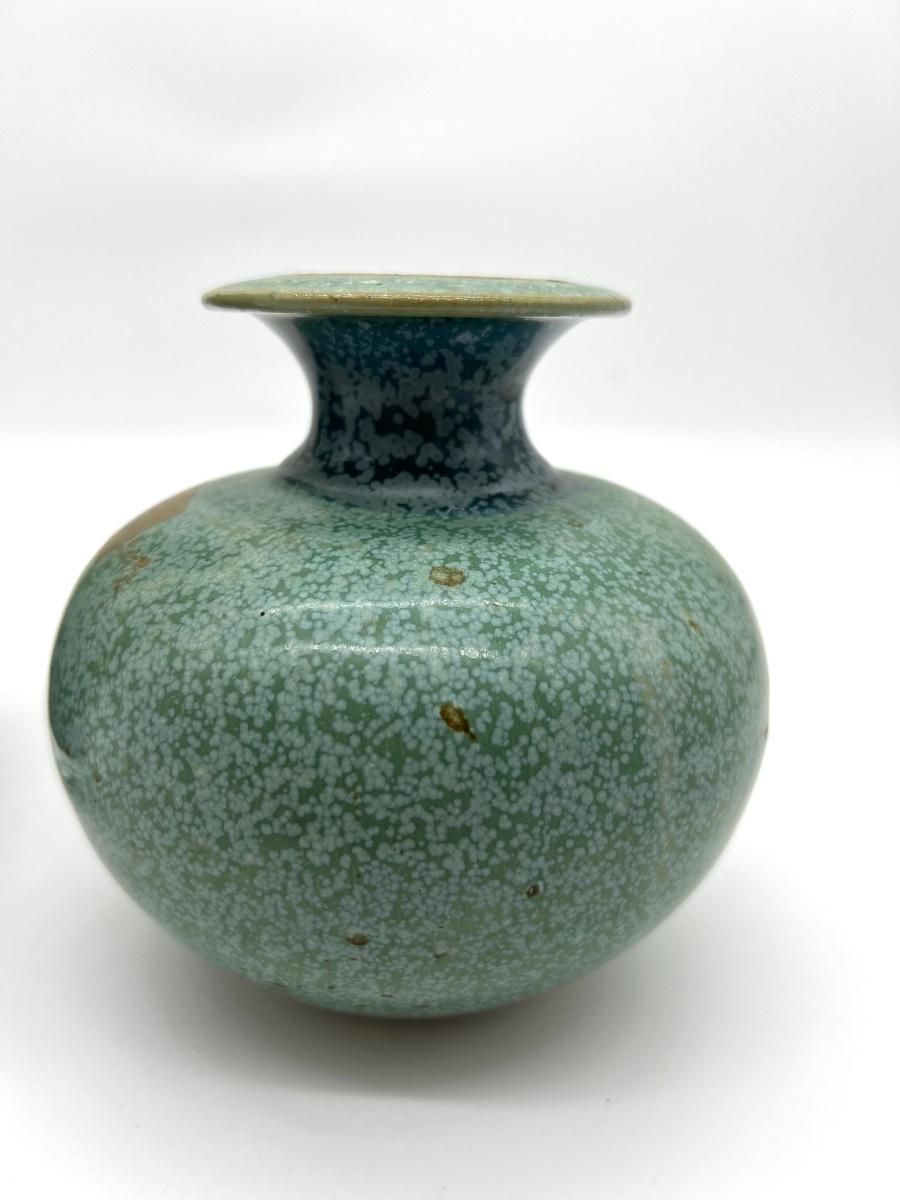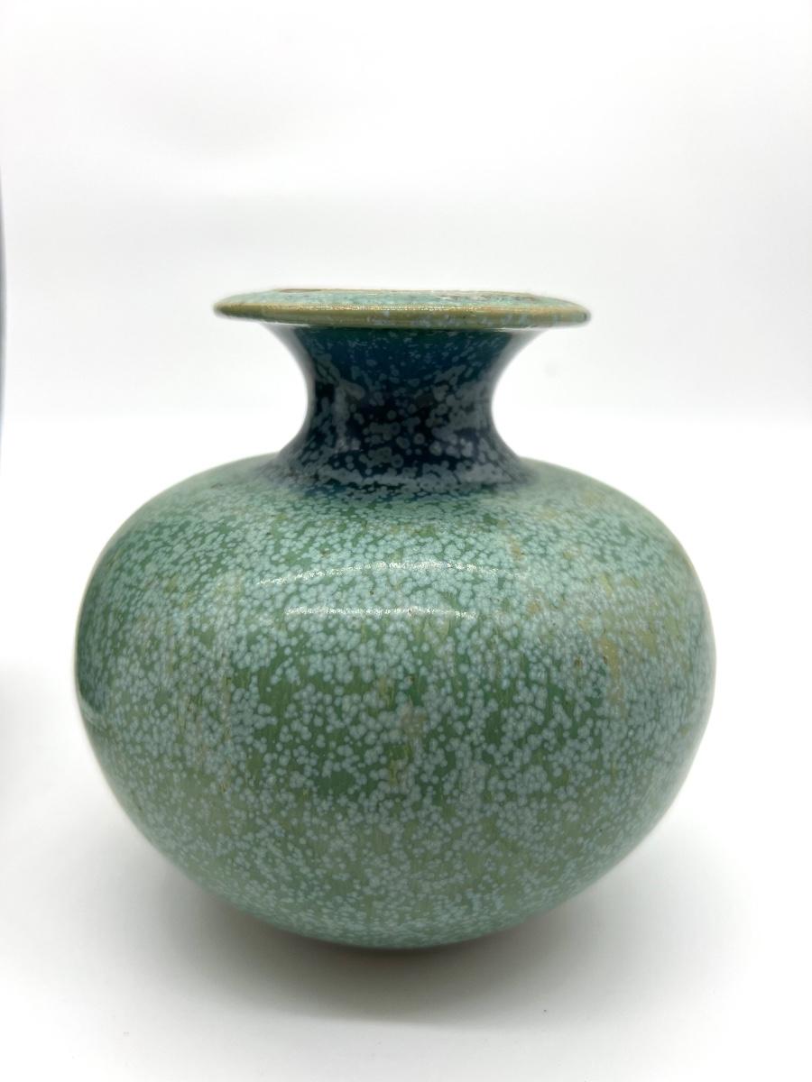 Louis Mulcahy pottery in Ireland measures 5 inches tall, 5 inches wide. Glass vase measures 9 1/2 inches tall 4 1/2 inches wide.