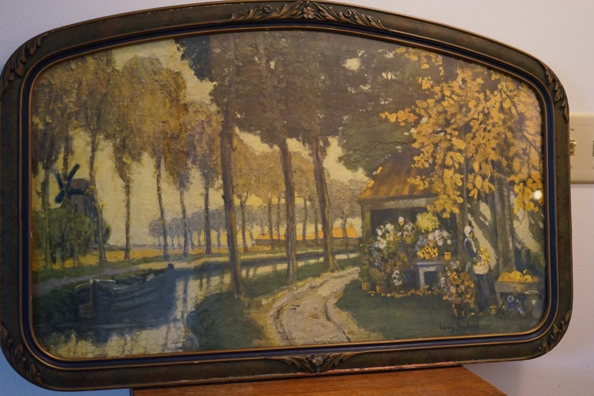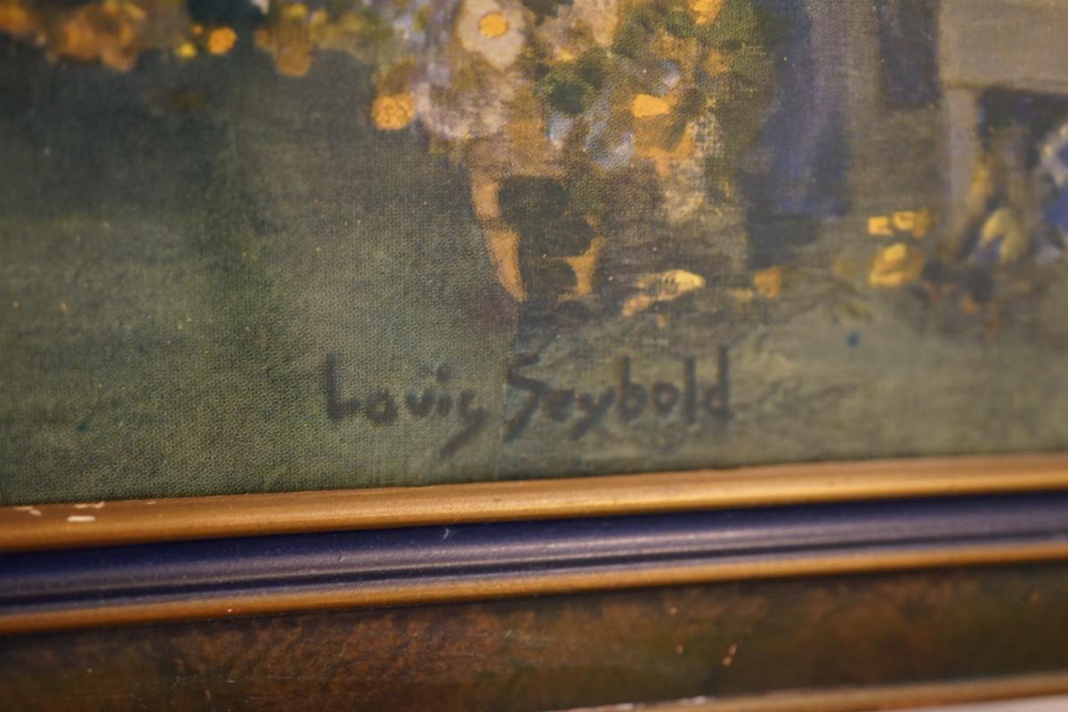 LOUIS SEYBOLD FRAMED LITHOGRAPH IN 1920'S FRAME ROADSIDE BY WATERWAY FLOWER CART