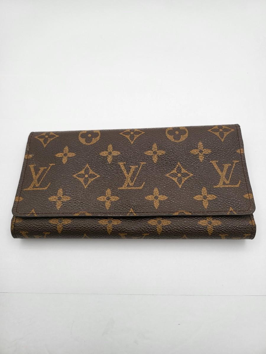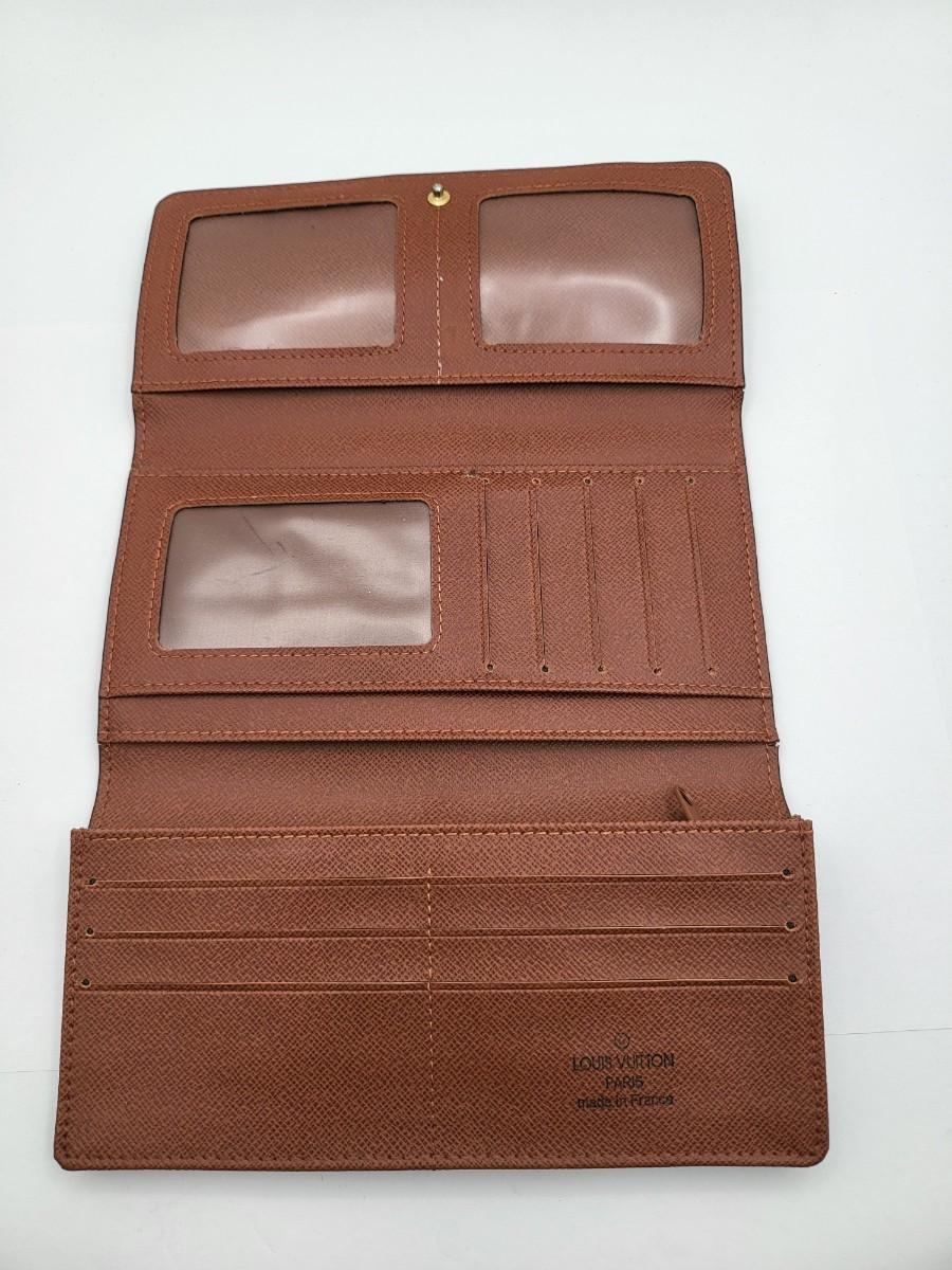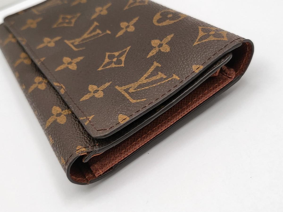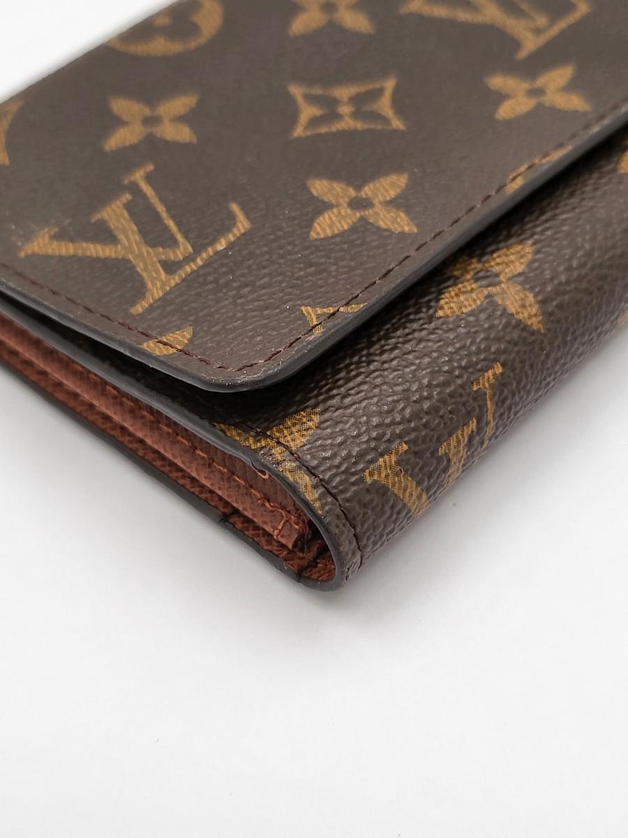 Brown signature LV trifold wallet with snap closure. Measures 7.25" long x 4" tall when folded. Good condition.