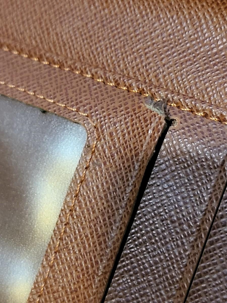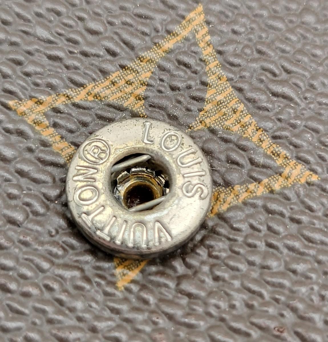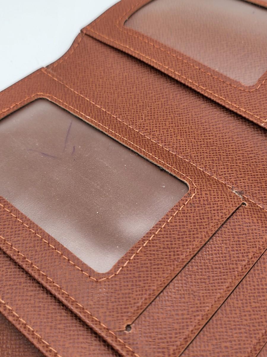 Brown signature LV trifold wallet with snap closure. Measures 7.25" long x 4" tall when folded. Good condition.