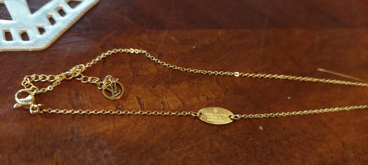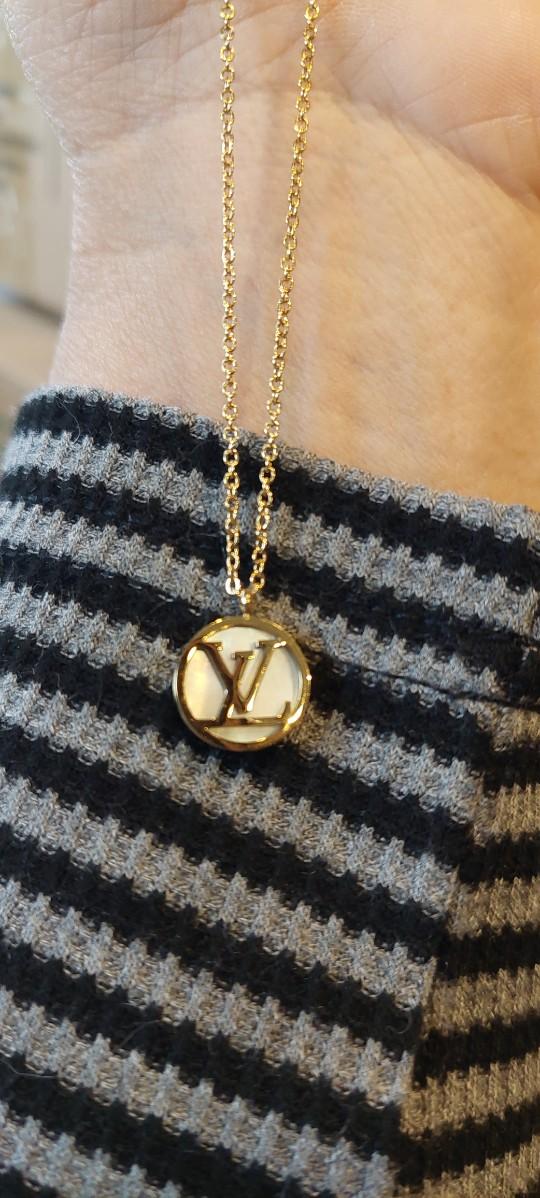 Features: The necklace includes a V-shaped pendant and an adjustable chain, often featuring an additional small LV circle signature on the adjuster chain/clasp.