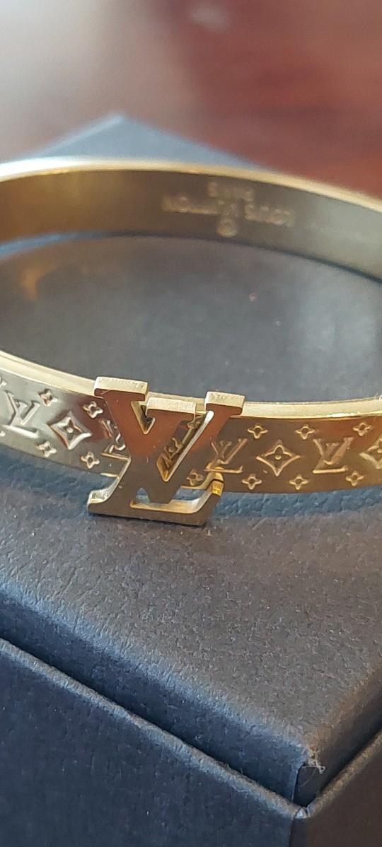 Louis Vuitton Nanogram Cuff bracelet. This popular piece of fashion jewelry features the iconic Monogram pattern painstakingly engraved on gold-tone brass.