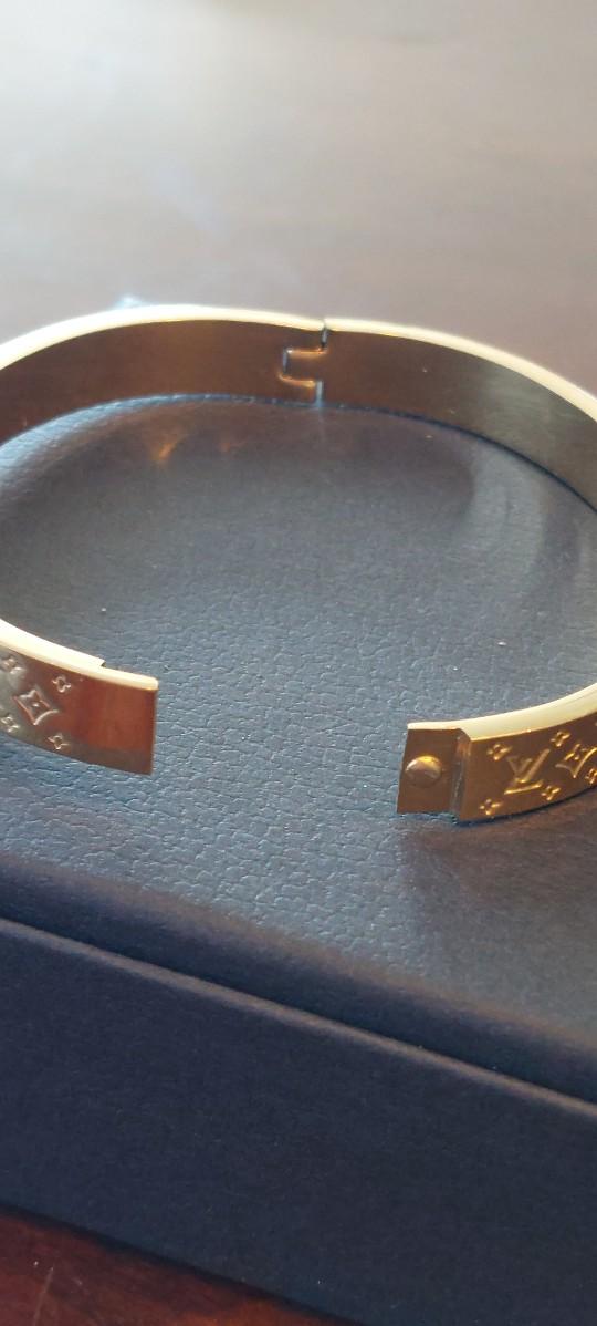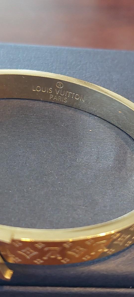 Louis Vuitton Nanogram Cuff bracelet. This popular piece of fashion jewelry features the iconic Monogram pattern painstakingly engraved on gold-tone brass.