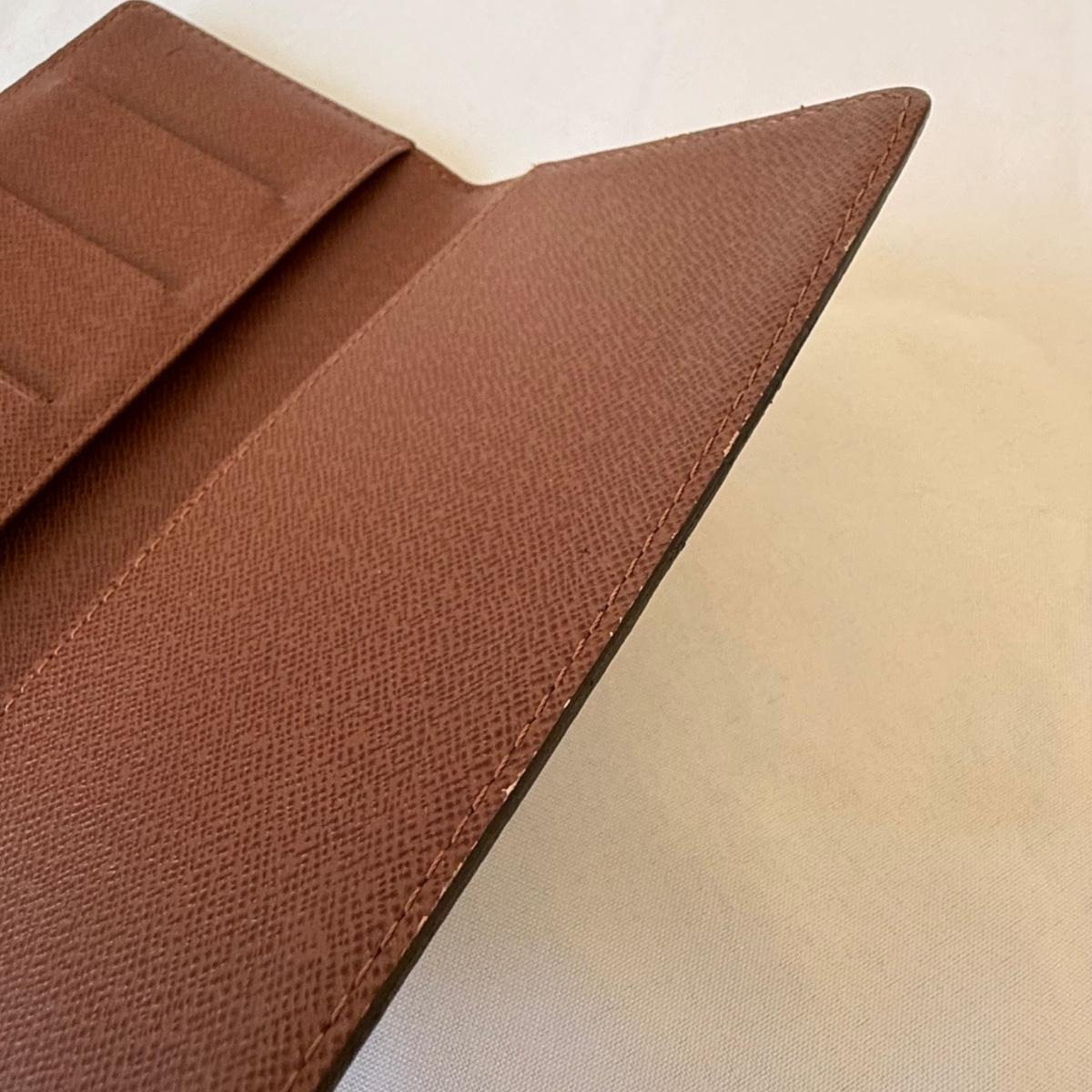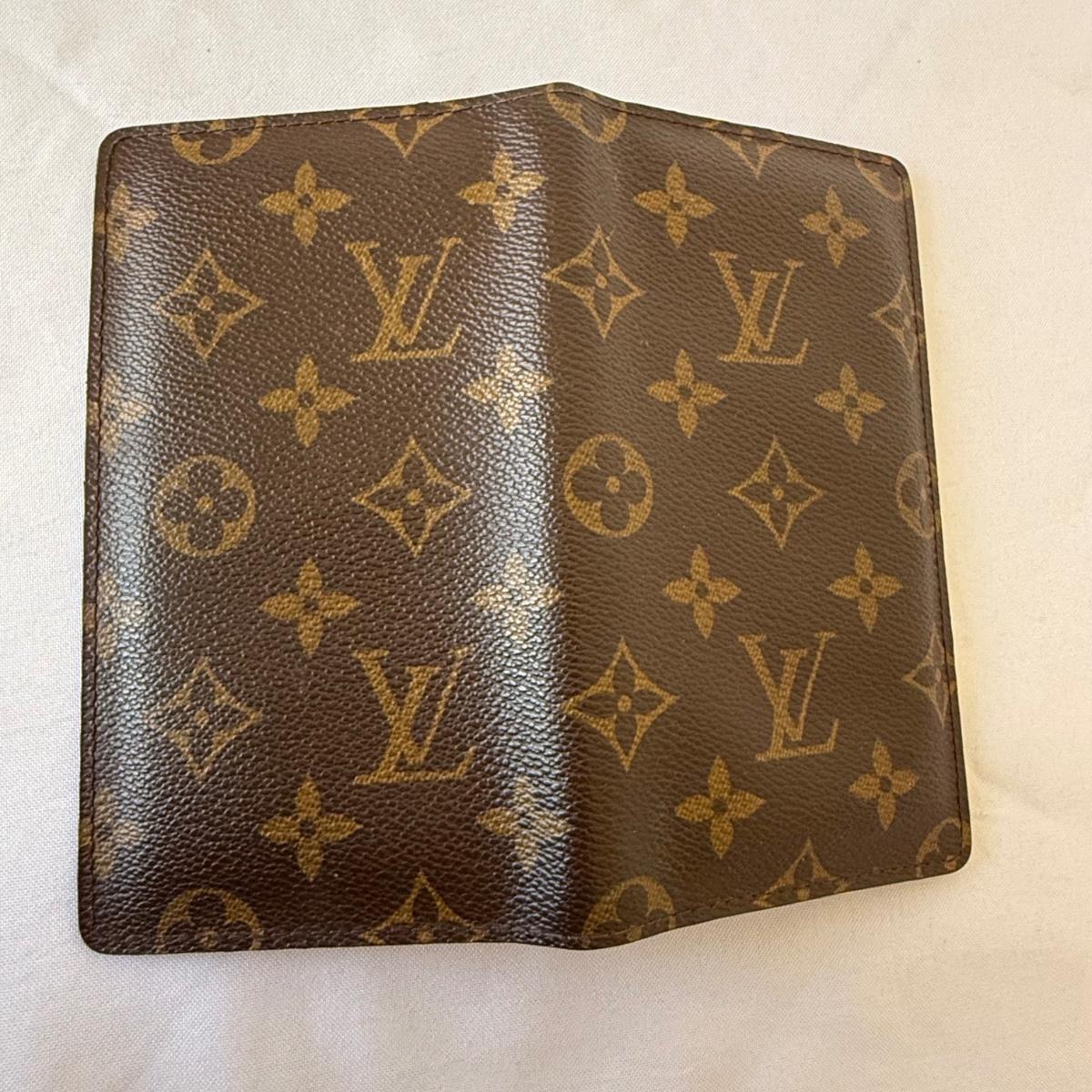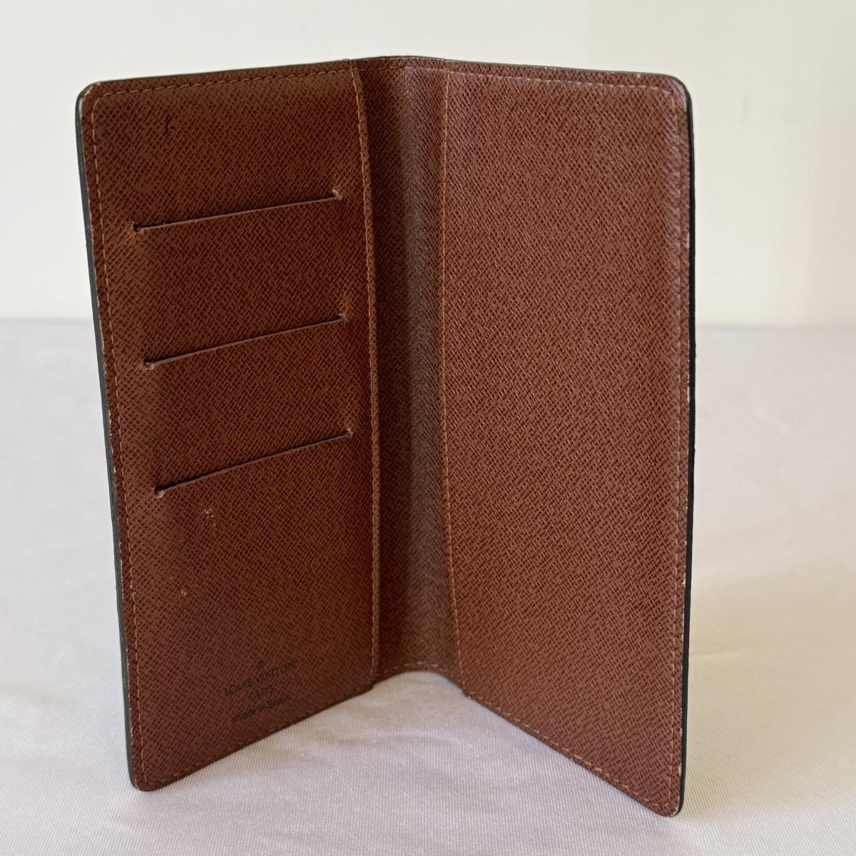 This Louis Vuitton pocket agenda cover measures 6.5” x 3.75” and features three slots for licenses or credit cards and two larger pockets. There is a very tiny worn area on the inside.