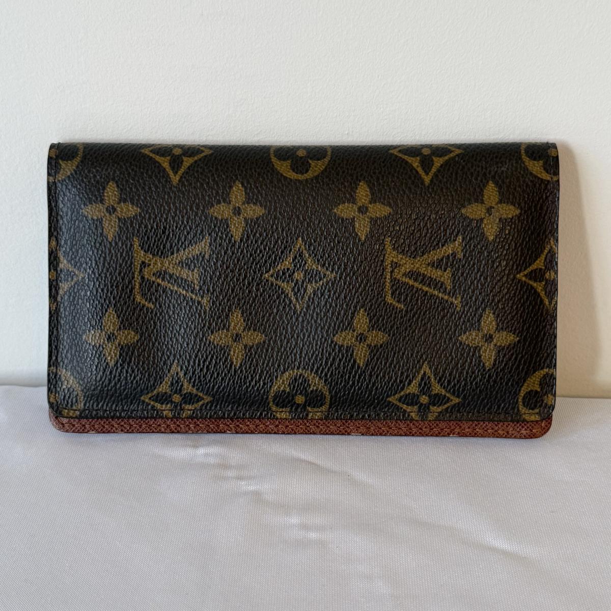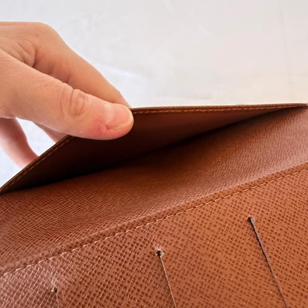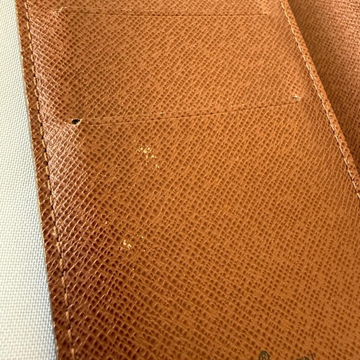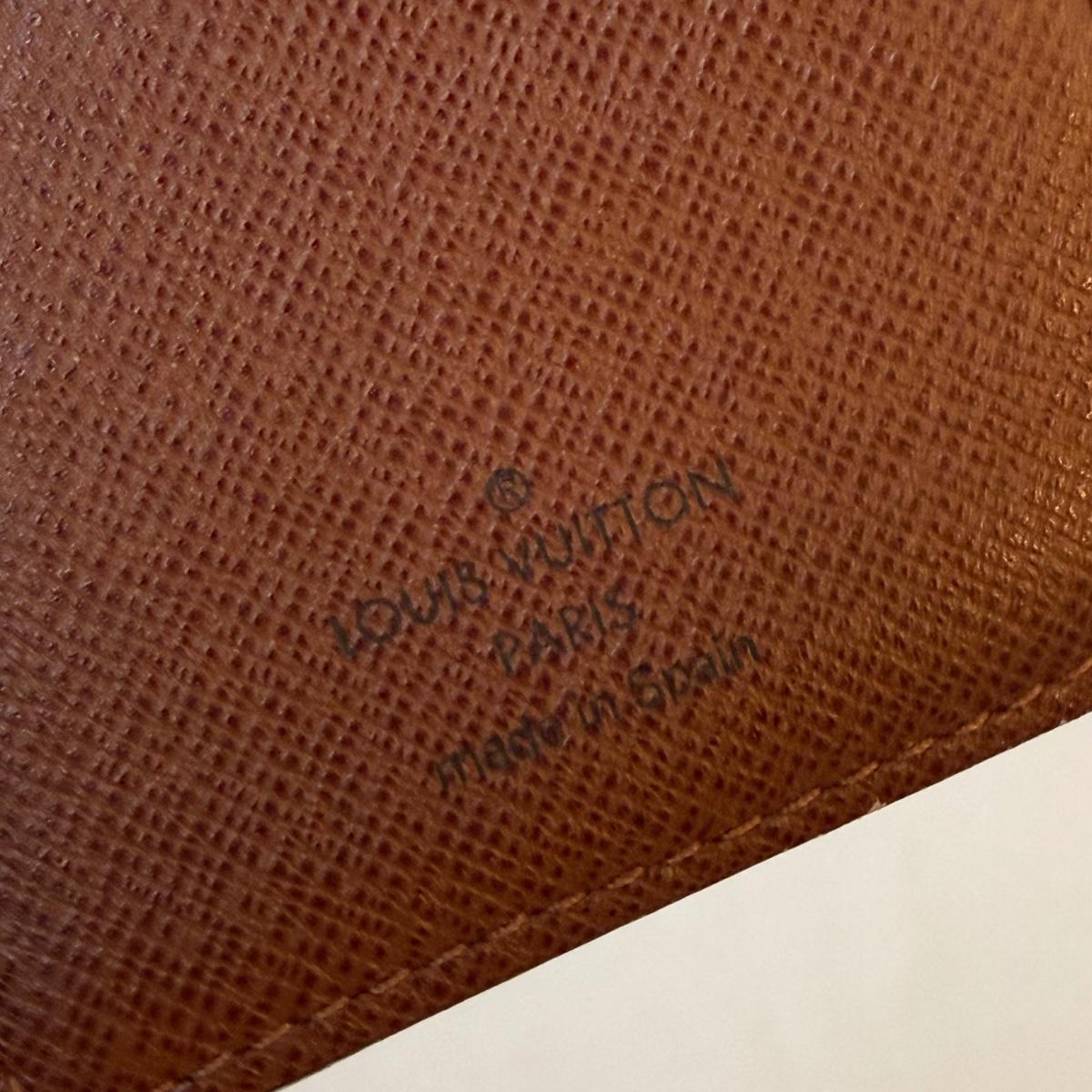 This Louis Vuitton pocket agenda cover measures 6.5” x 3.75” and features three slots for licenses or credit cards and two larger pockets. There is a very tiny worn area on the inside.