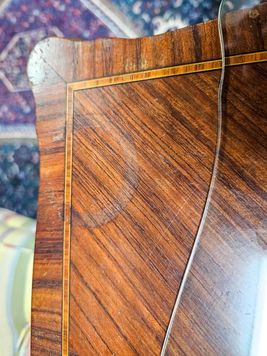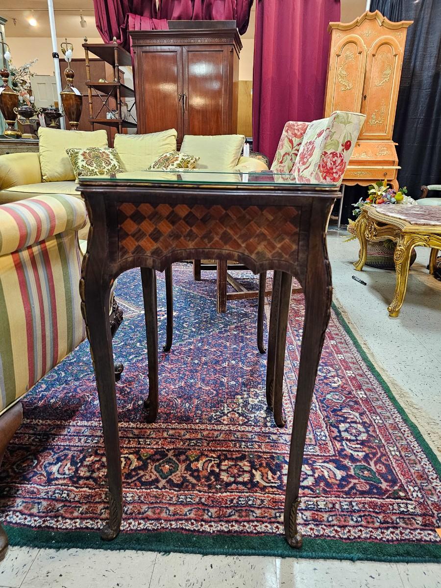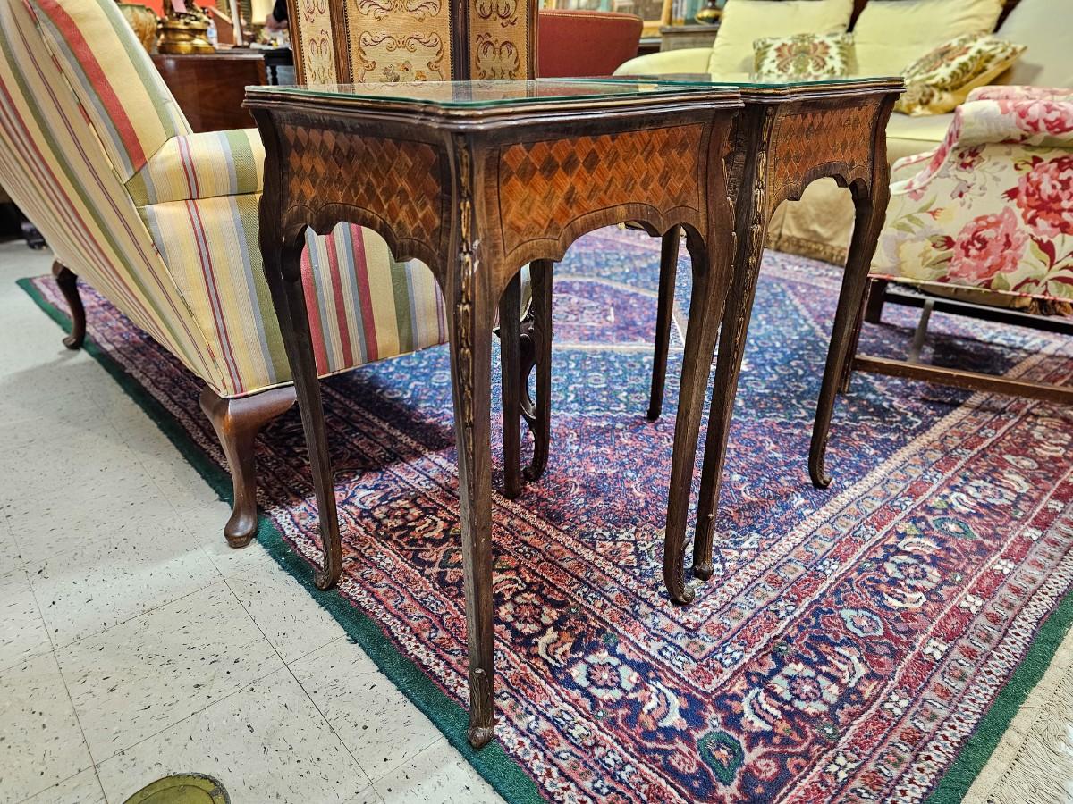 A fair amount of wear, glass tops, 16" W x 16" D x 28" H