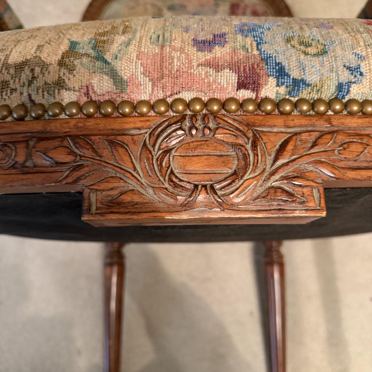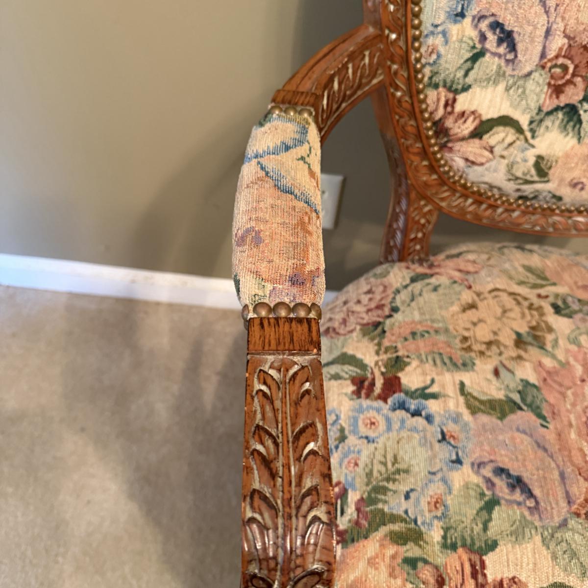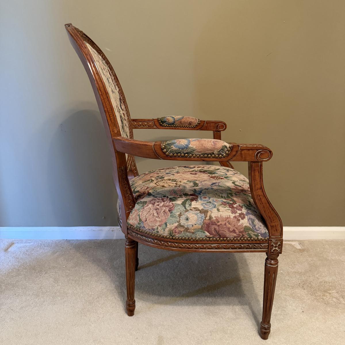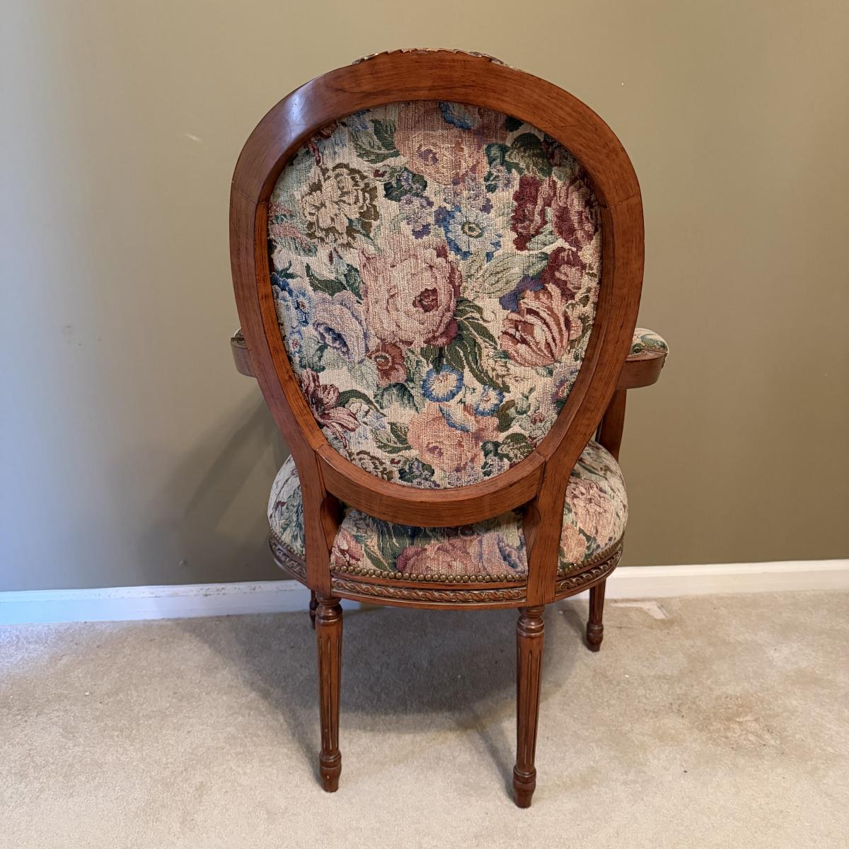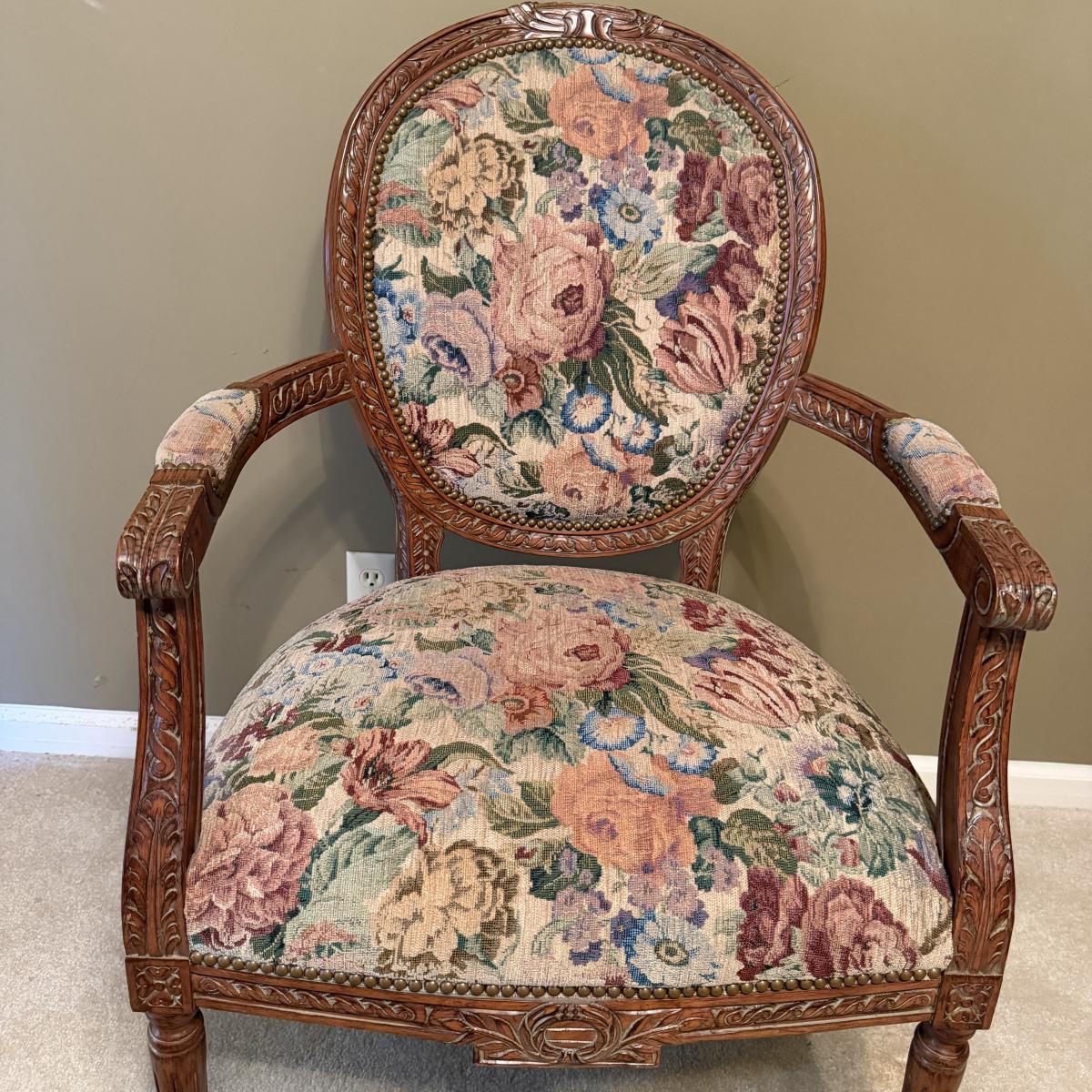 Lot includes a Louis XV style chair with a floral design padded and upholstered seat and back. Chair measures 24” x 25” x 40”H with a 19” seat height.