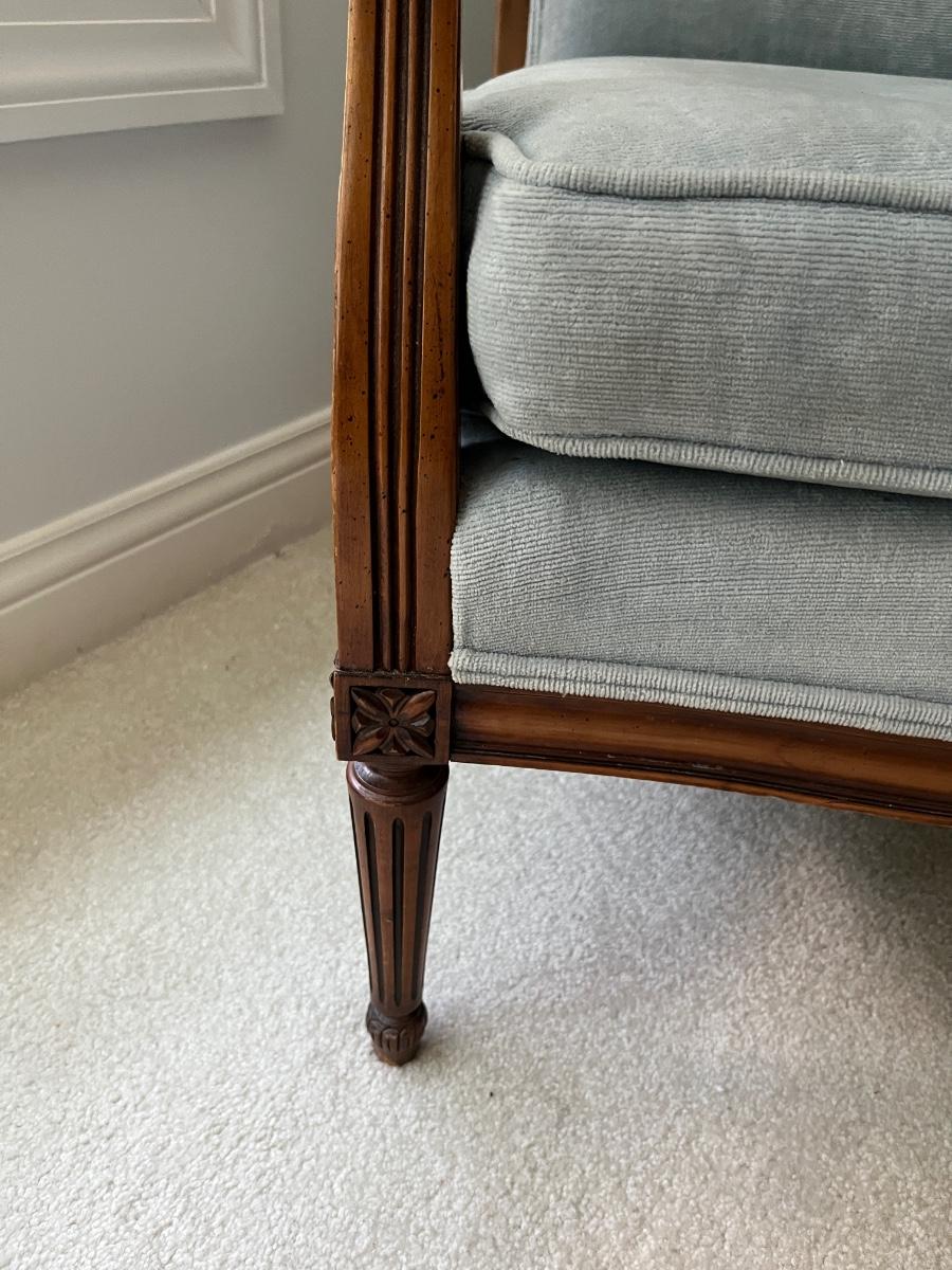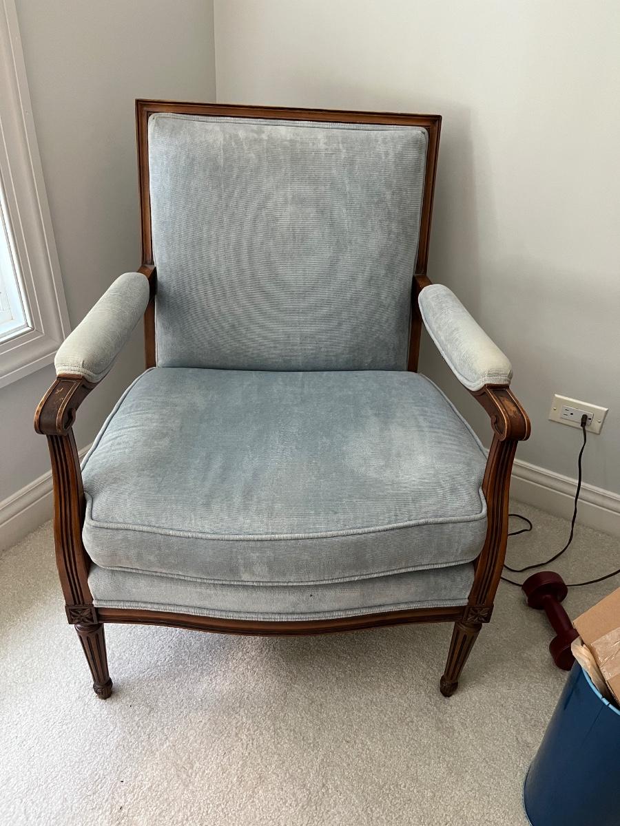 34"h x 25.5"w x 21"d x 18"h (seat height)--lovely mid-century, French provincial, Louis XVI style armchair, covered in blue velvet fabric. Very good condition.