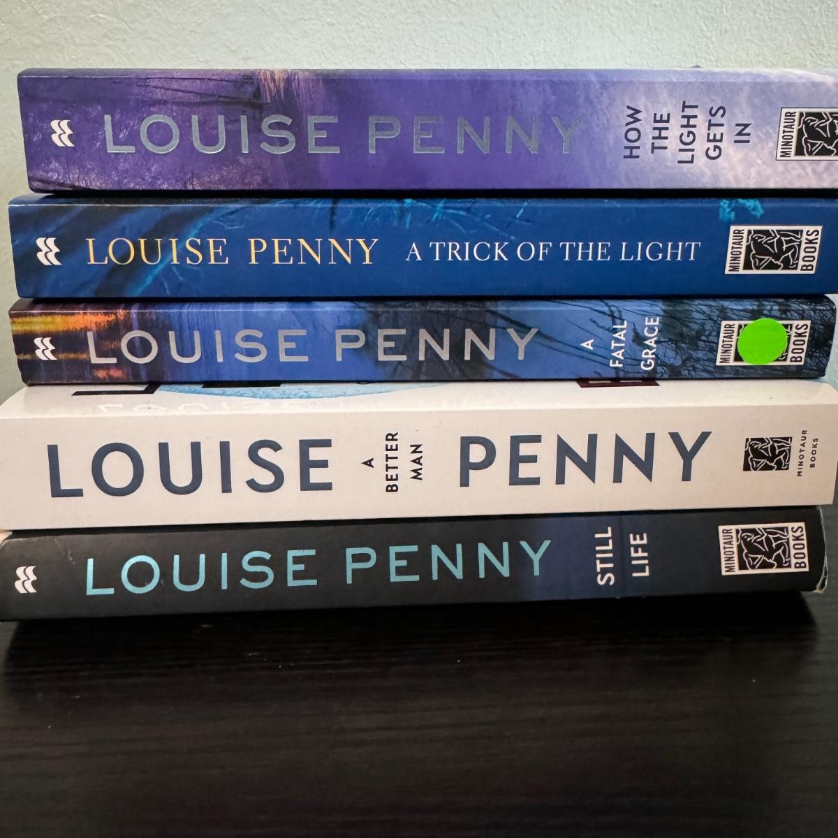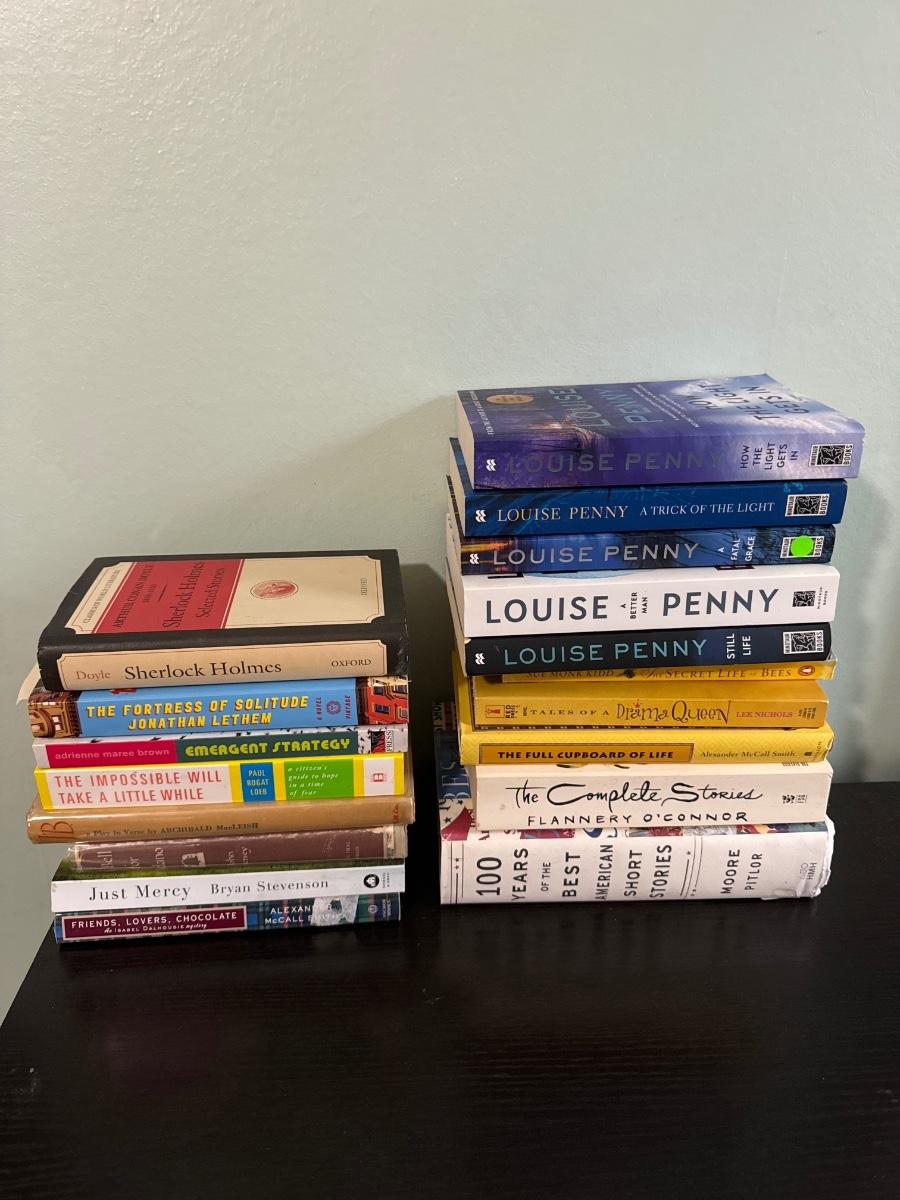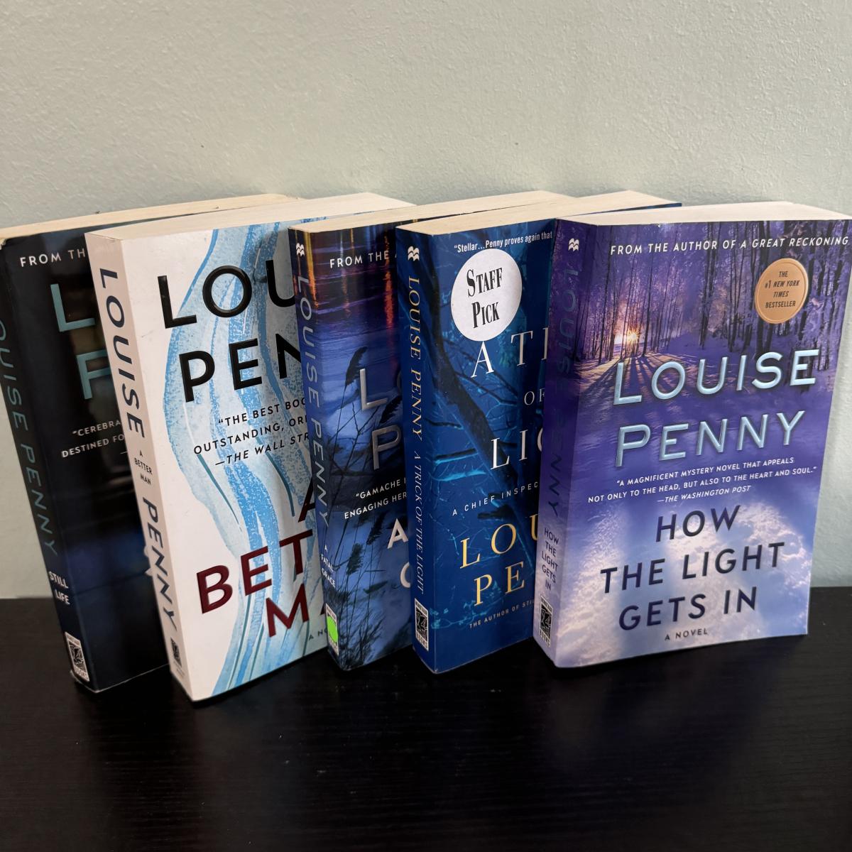 Five books by Louise Penny and 13 more books by various authors. Titles include The Secret Life of Bees, Complete Stories of Flannery O’Connor, and Sherlock Holmes. Shipping available