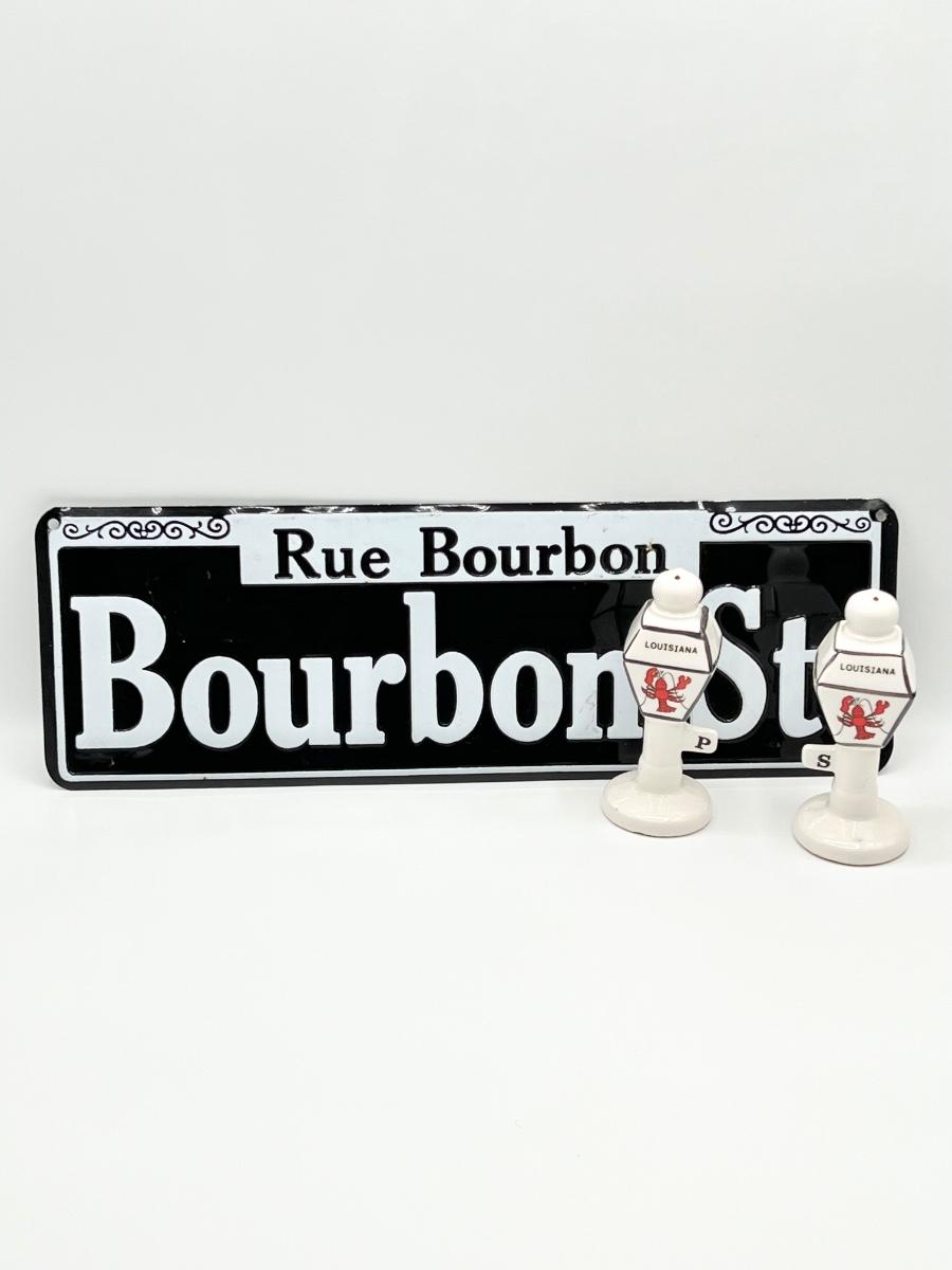 Bourbon St sign = 5” H x 15” W ~ Ceramic salt pepper shakers = 5” H