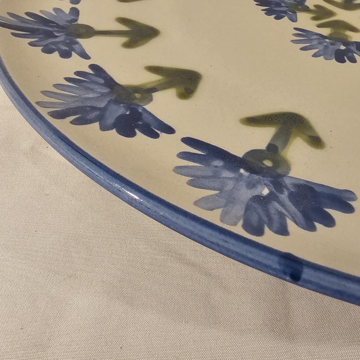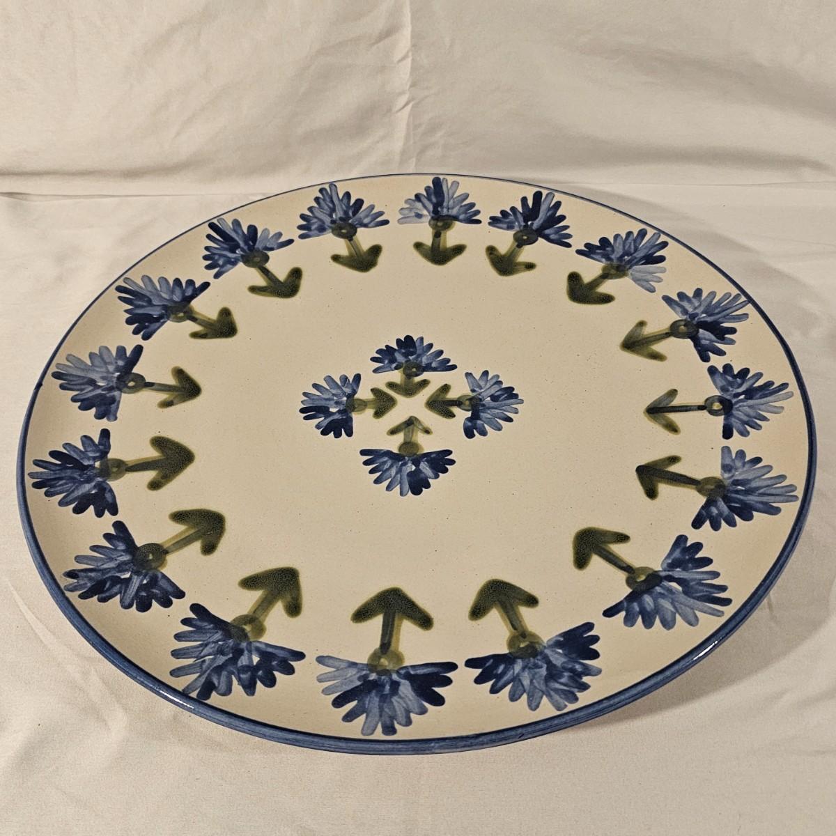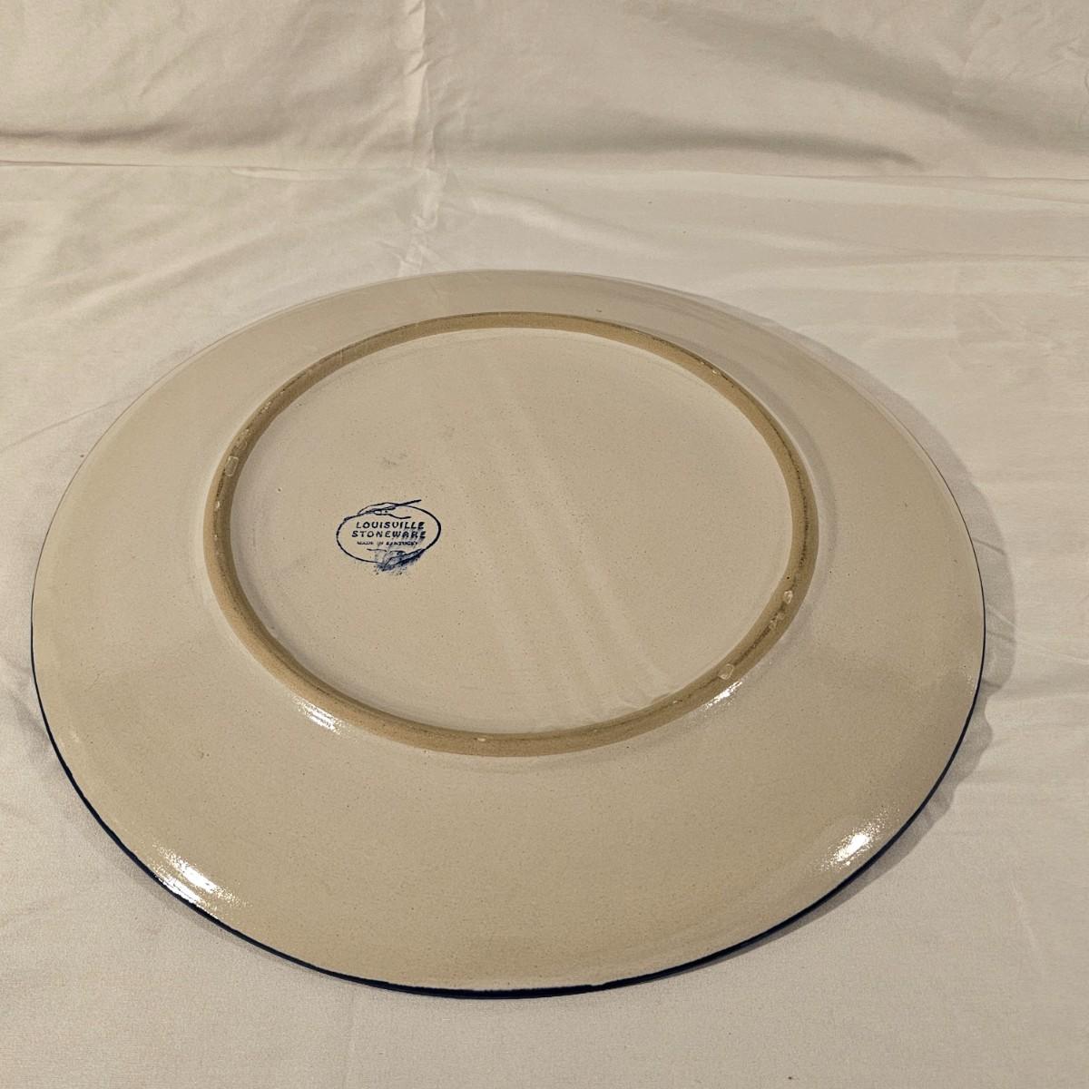 Large round serving platter stamped Louisville Stoneware of Kentucky. Stylized blue and green symmetrical design around edge and in middle. Item measures 16"D. See photos for details. Shipping available.