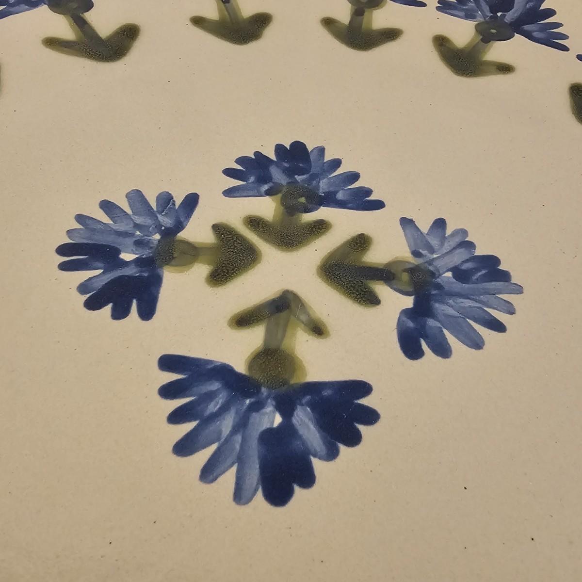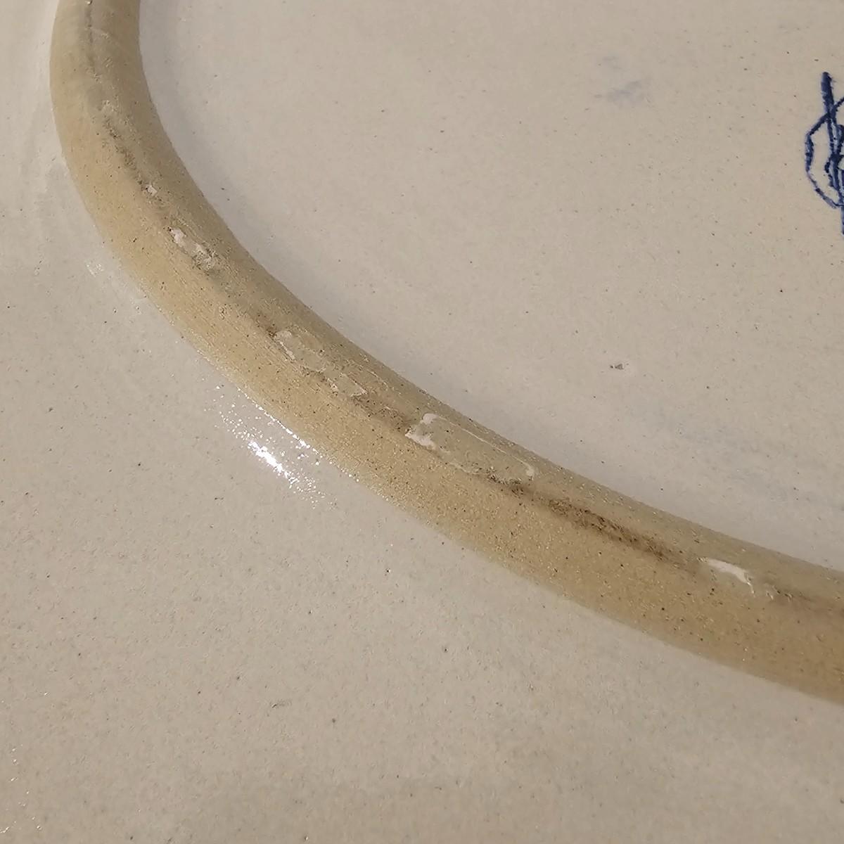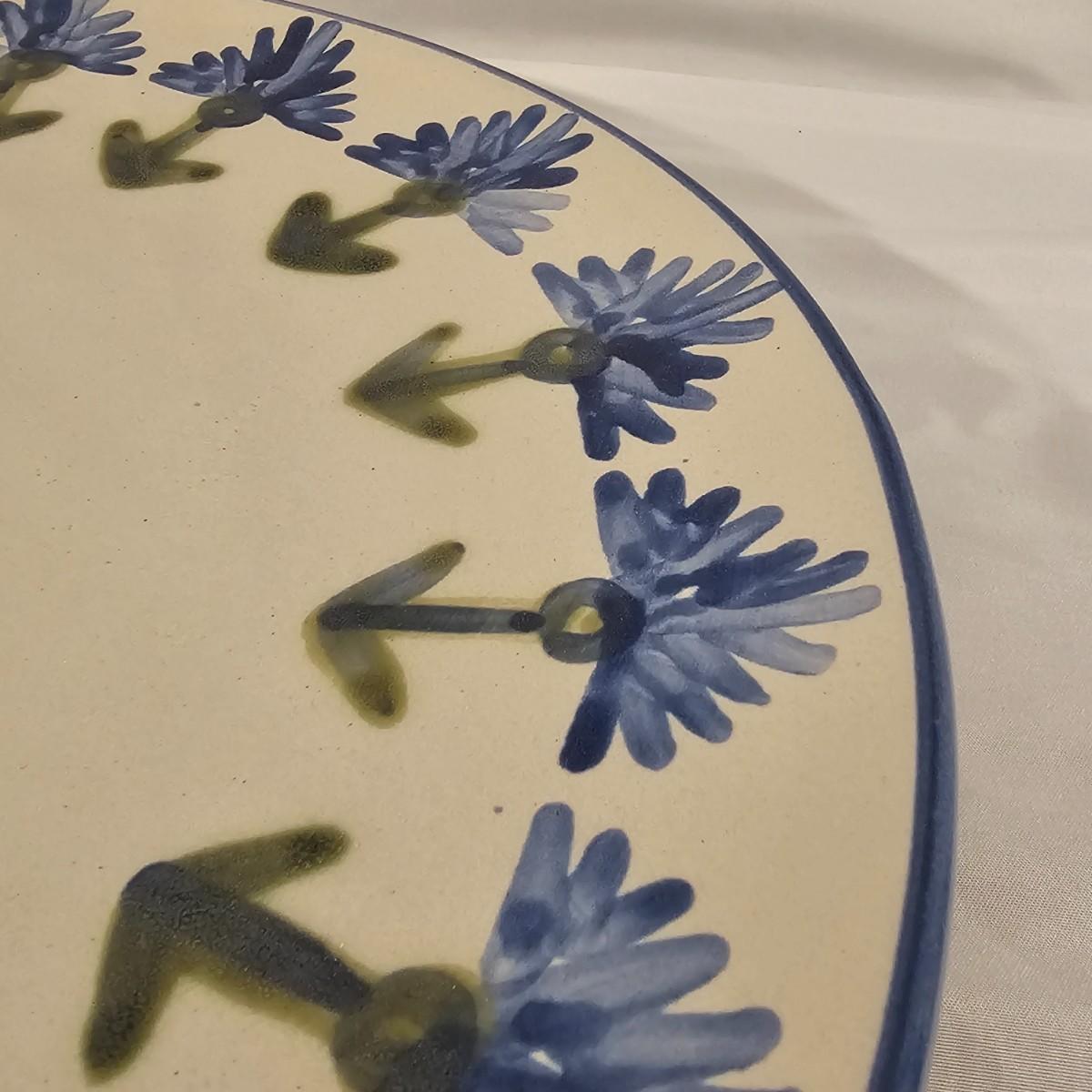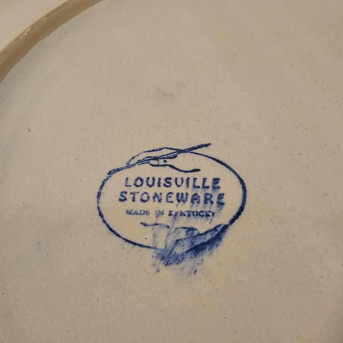 Large round serving platter stamped Louisville Stoneware of Kentucky. Stylized blue and green symmetrical design around edge and in middle. Item measures 16"D. See photos for details. Shipping available.