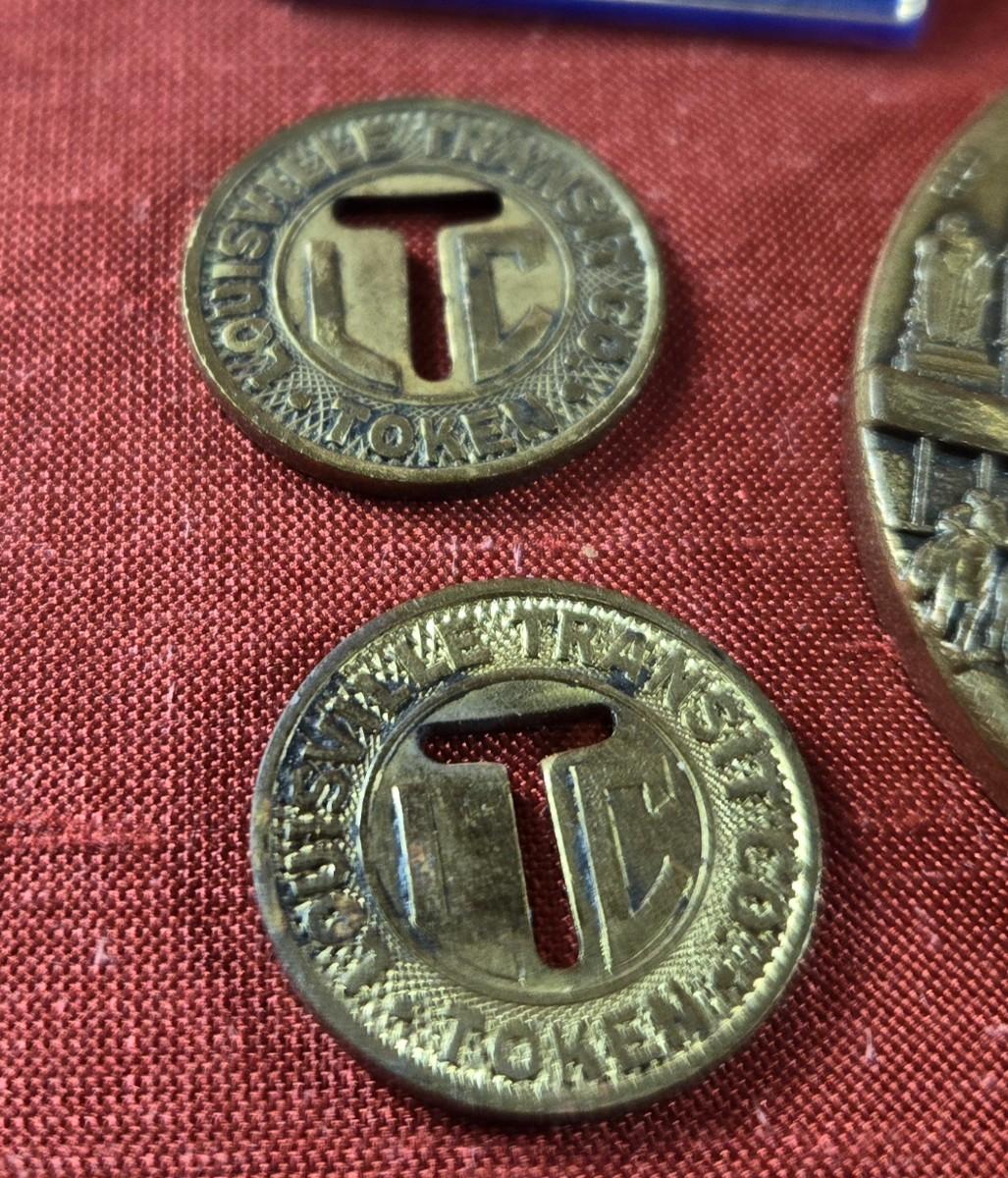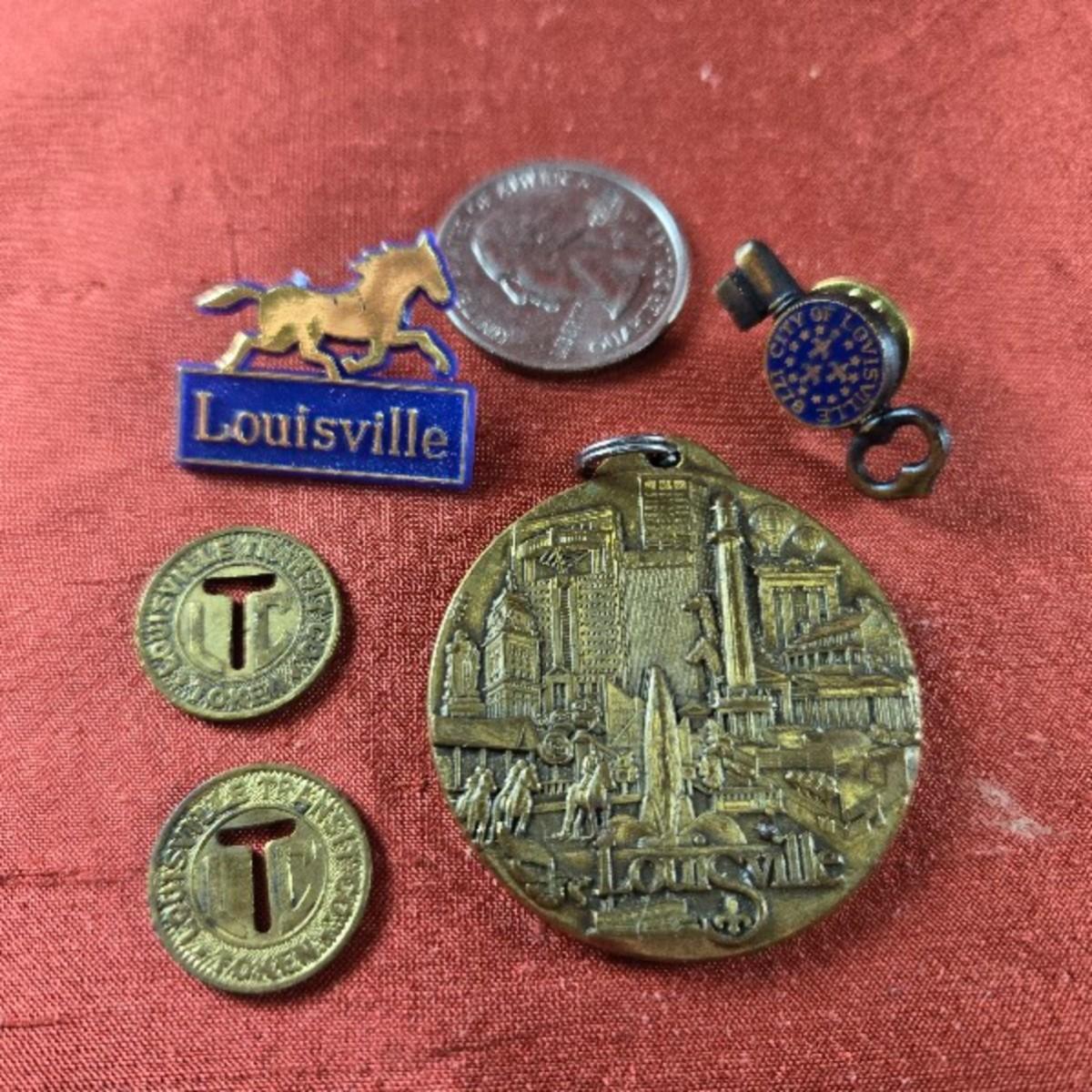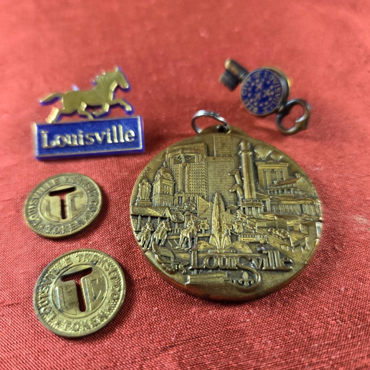 This auction lot is for a gathering of Louisville Collectibles. This is a collection of 2 old transit tokens, a Louisville Medallion high-relief pendant that was given as a key fob to celebrate the opening of the LG&E building on Main Street, a plastic horse pin and z brass Key To The City lapel pin. Nice memorabilia collectibles for Louisville,