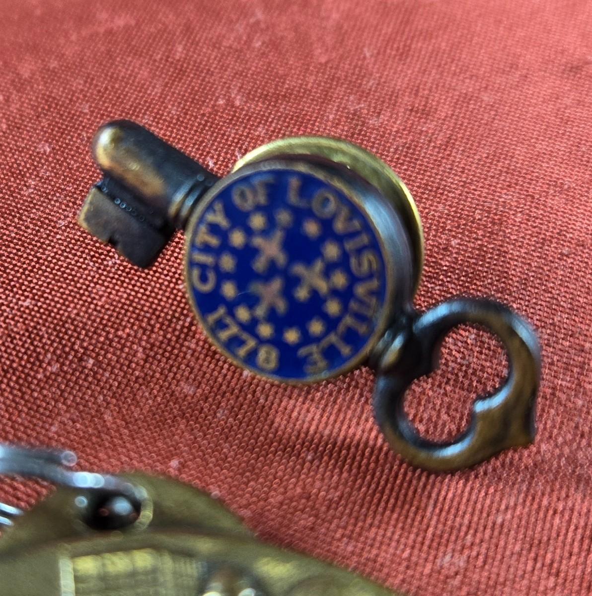 This auction lot is for a gathering of Louisville Collectibles. This is a collection of 2 old transit tokens, a Louisville Medallion high-relief pendant that was given as a key fob to celebrate the opening of the LG&E building on Main Street, a plastic horse pin and a brass Key To The City lapel pin. Nice memorabilia collectibles for Louisville, KY.