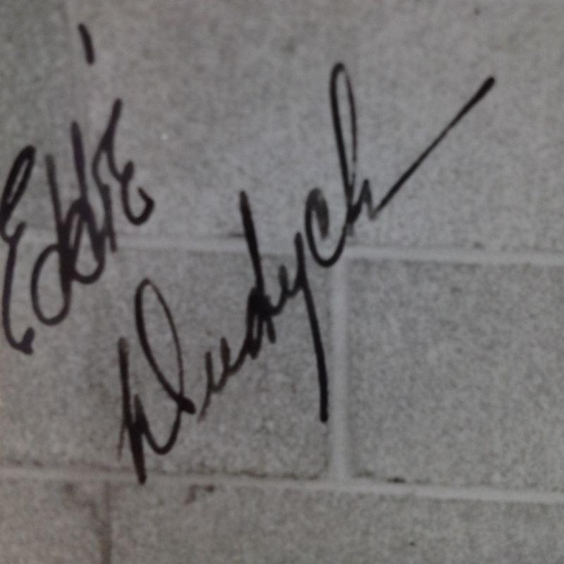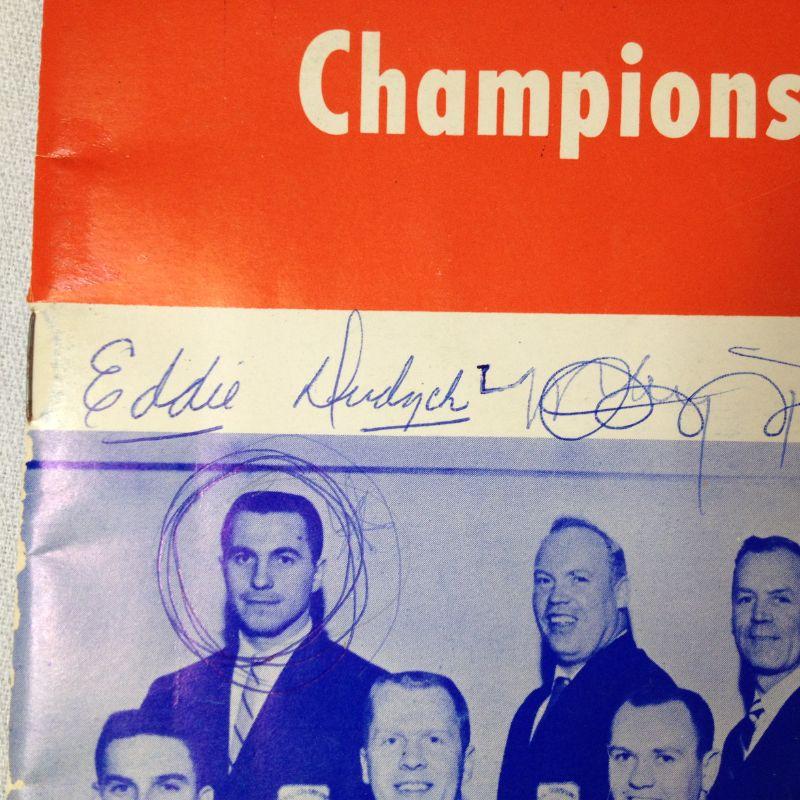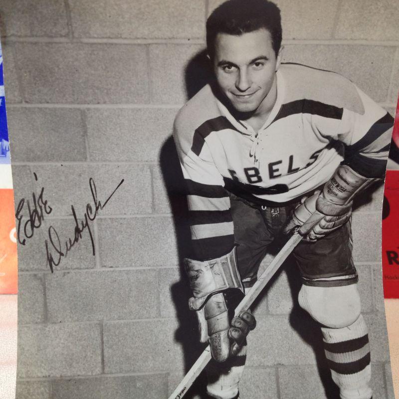 This fun lot has two booklets/programs from Louisville's Hockey Team - The Rebels. 1950's. We didn't even know Louisville had a hockey team. The lot also offers an autographed photo of Eddie Dudych. The booklets were well read and are worn and show age on the outsides. Insides look good and have some very interesting ads. The photo is in good condition.