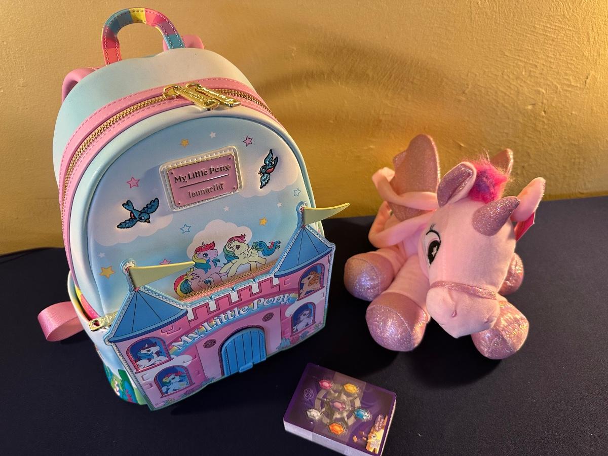 LOUNGEFLY MY LITTLE PONY BACKPACK(NEW) & RAINBOW UNICORN CARRIED AWAY BAGS LOT AS PICTURED