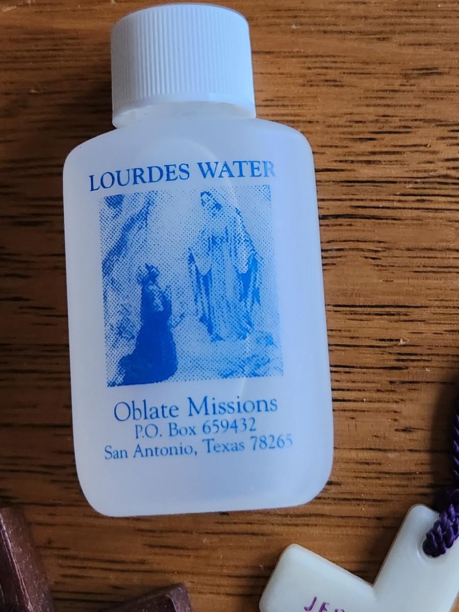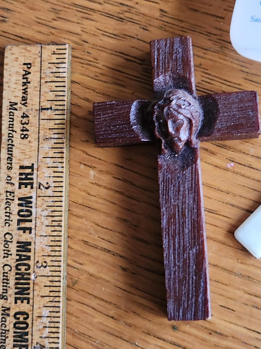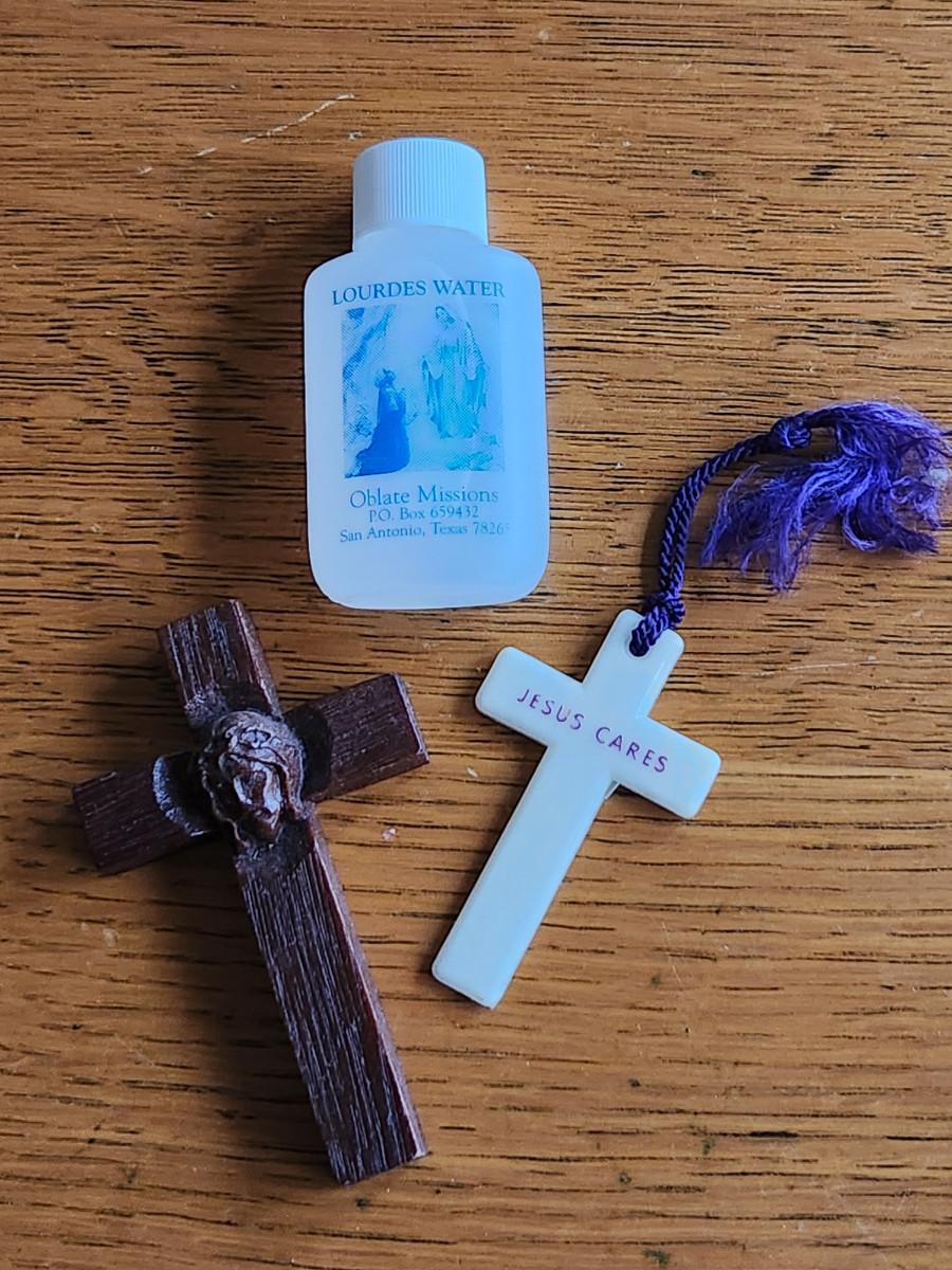 This auction lot is for Lourdes Water and Two Crosses. The Blessed water is in a small plastic bottle. One small plastic cross is imprinted with the words - Jesus Cares and has a purple fringe. The remaining cross is carved wood featuring the head of Christ. See photo for size.
