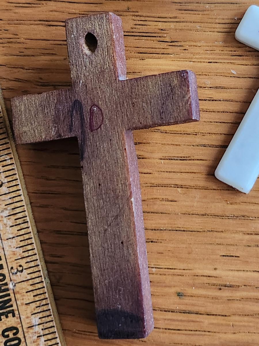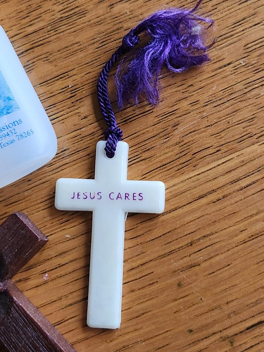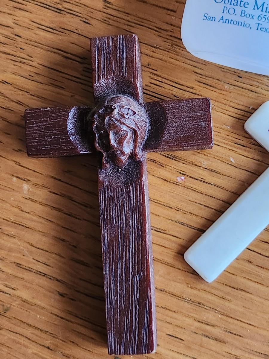 This auction lot is for Lourdes Water and Two Crosses. The Blessed water is in a small plastic bottle. One small plastic cross is imprinted with the words - Jesus Cares and has a purple fringe. The remaining cross is carved wood featuring the head of Christ. See photo for size.