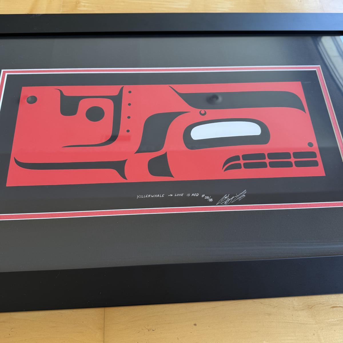 This lot contains a signed print that appears to be by native artist Carl Stromquist. This vibrant piece depicts an abstract killer whale in red, black and white. The art is framed and behind glass. The frame measures 27.5” x 17” and does have hardware to be hung. Shipping available.