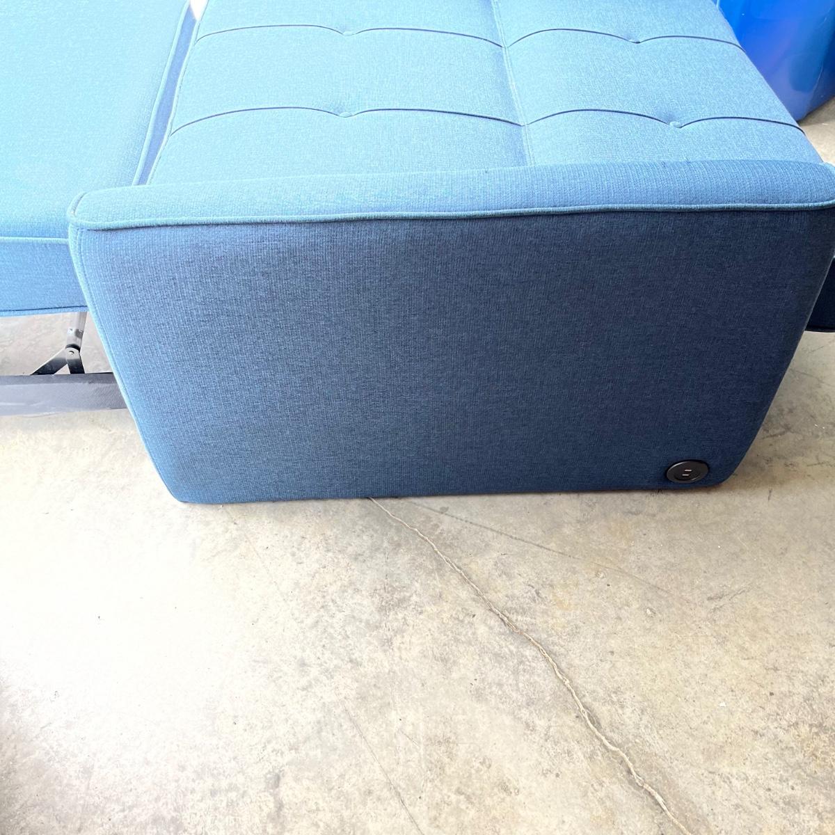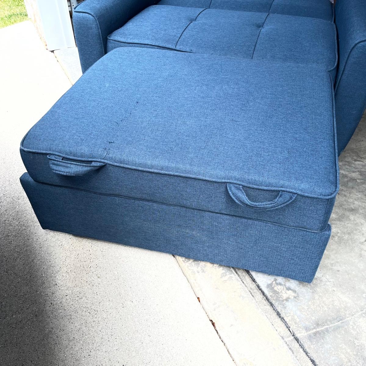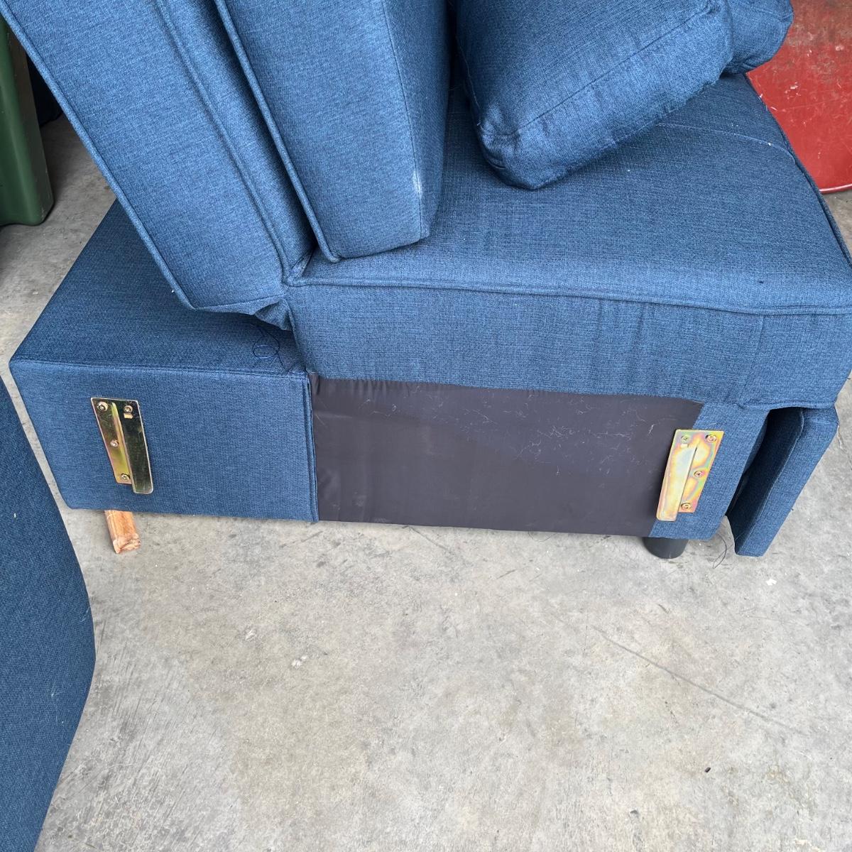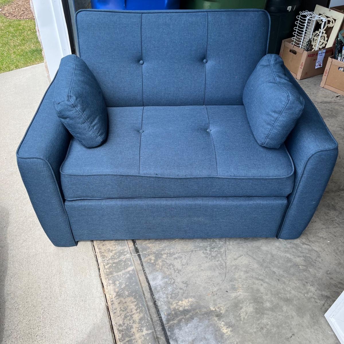 This love seat has a sliding cushion that comes out from underneath to make a bed and the back folds down. Sleeper measures 51” x 72” when folded down and 37” x 51” x 33” when it is a love seat. Sides slide off. Pull out cushion has some wear, see pictures.