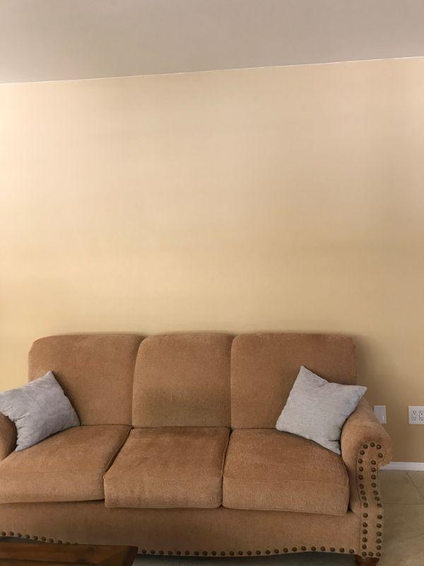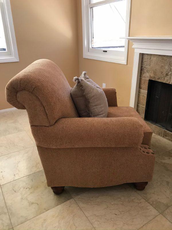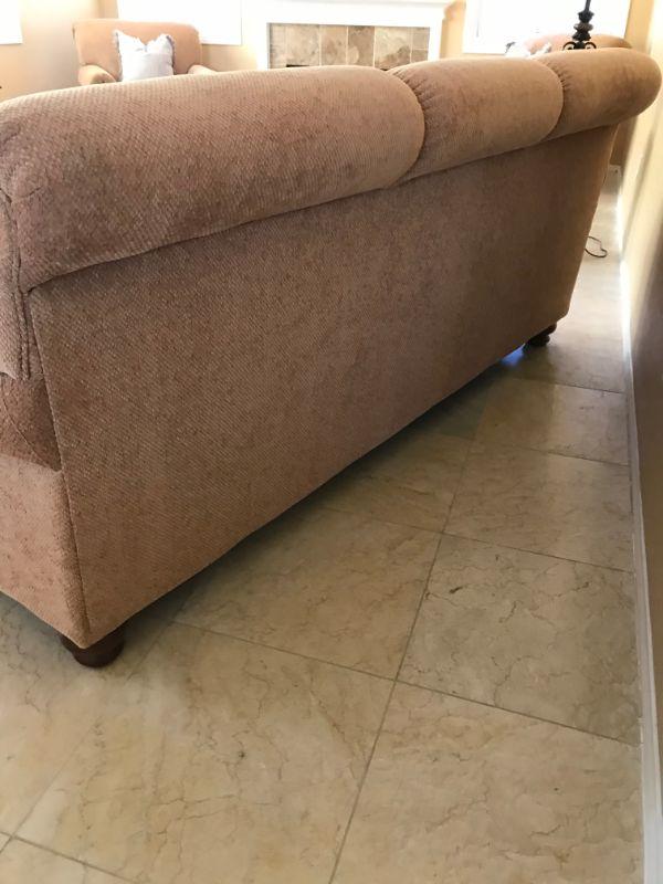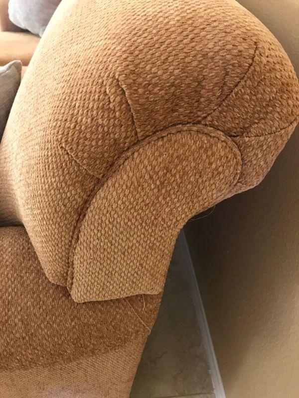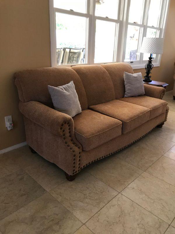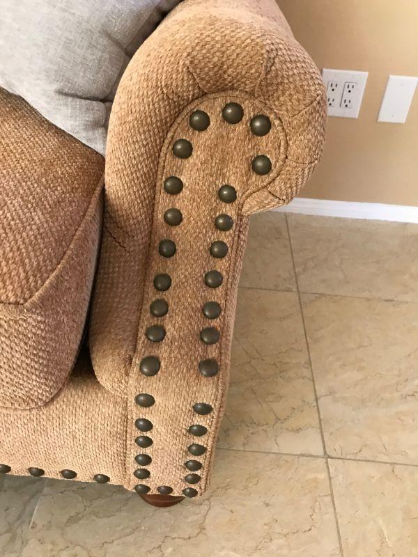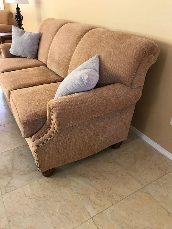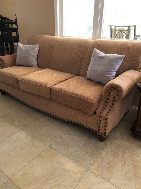 Two caramel colored loveseats with textured polyester fabric each with 3 cushions. Made by American Furniture. 81" L x 25" H at arm rest. Gray accent cushions included 14" x 14". $150 per loveseat.
