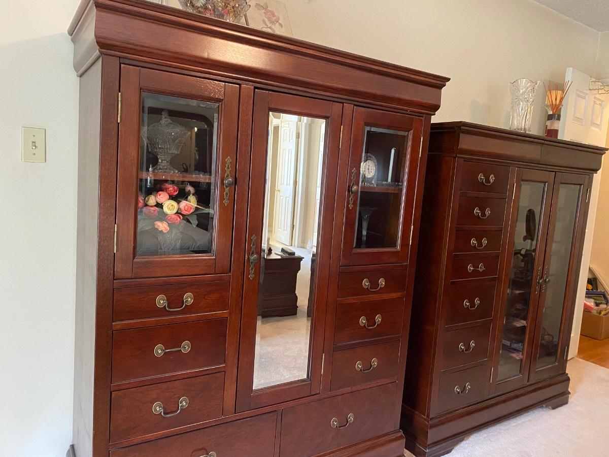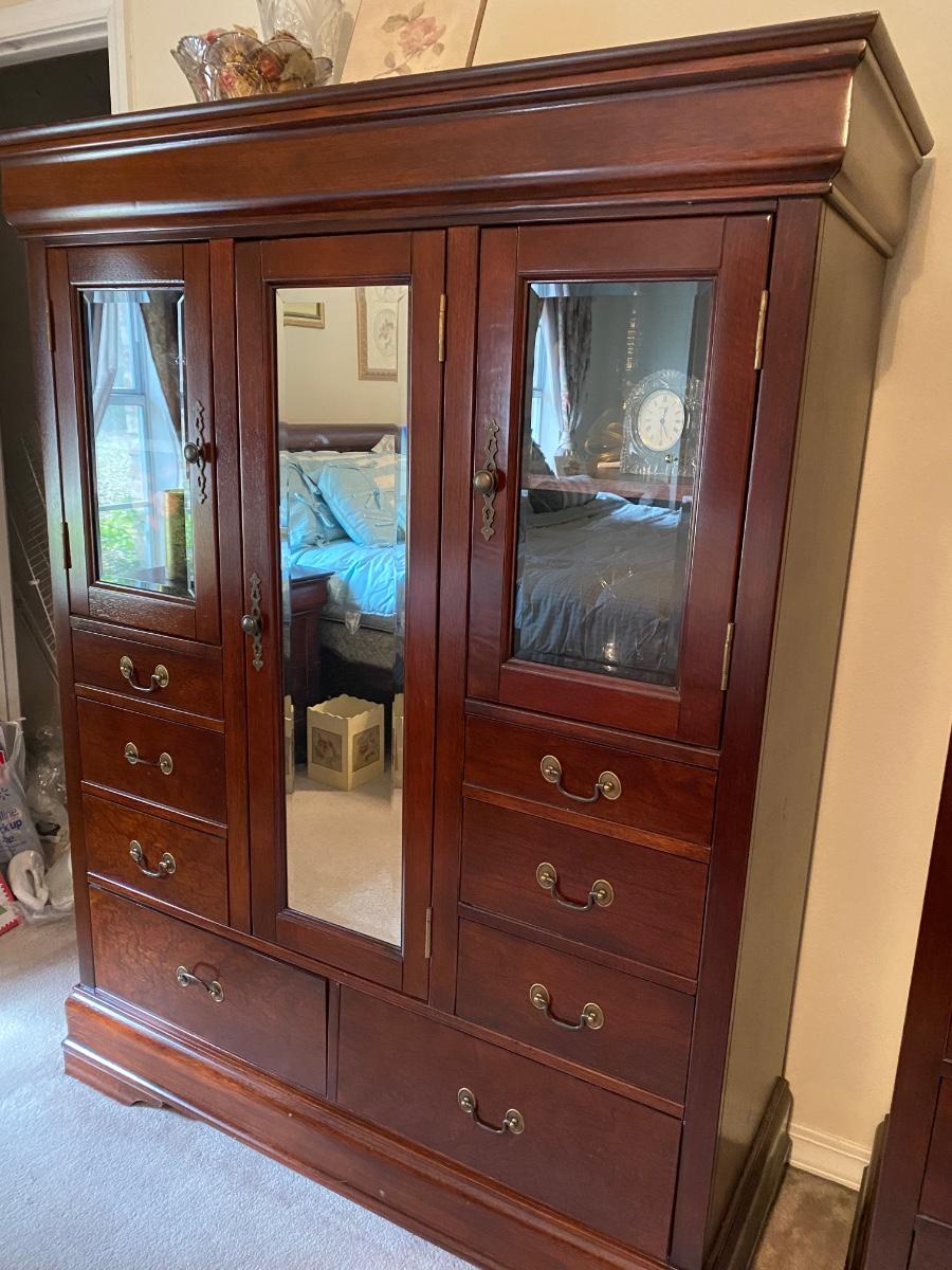 Lovely all-wood wardrobe with mirror and glass upper doors. Classic styling. There are shelves behind the doors, and 8 dovetail drawers. The track on the bottom right drawer is broken. Otherwise in very good condition.