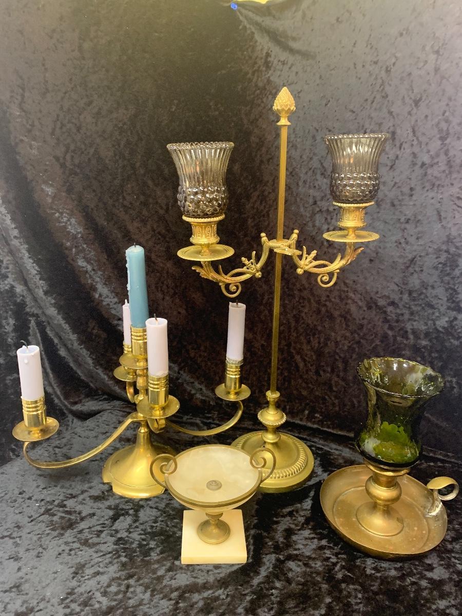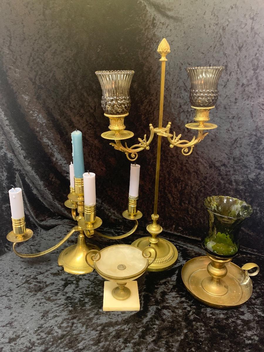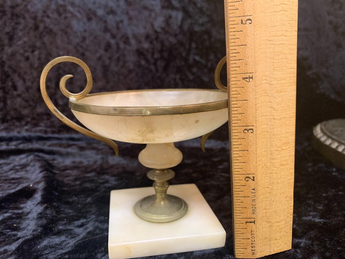 Be sure to zoom in on these exquisite brass candelabras. These are very old a quite elegant. This lot includes a small alabaster trophy dish.