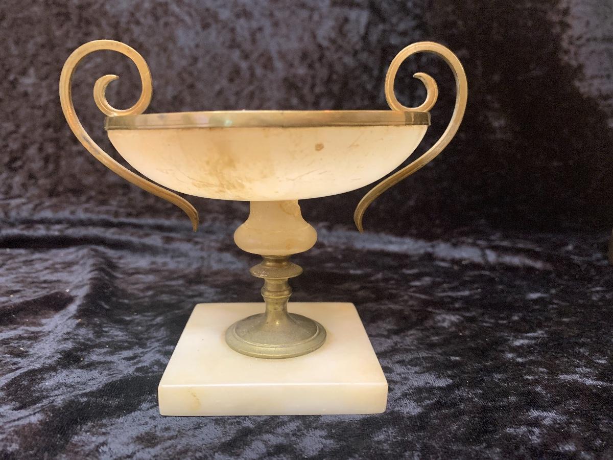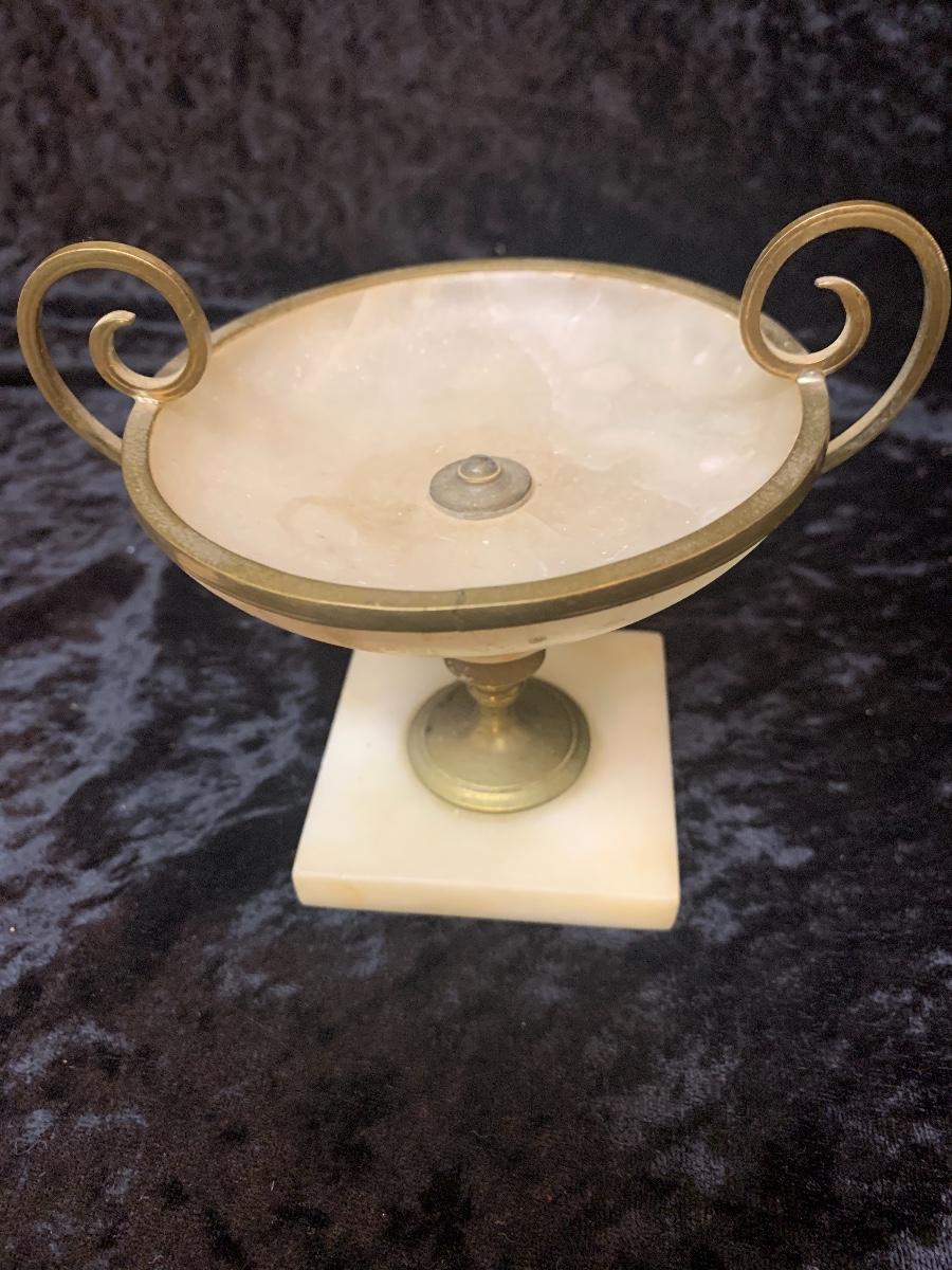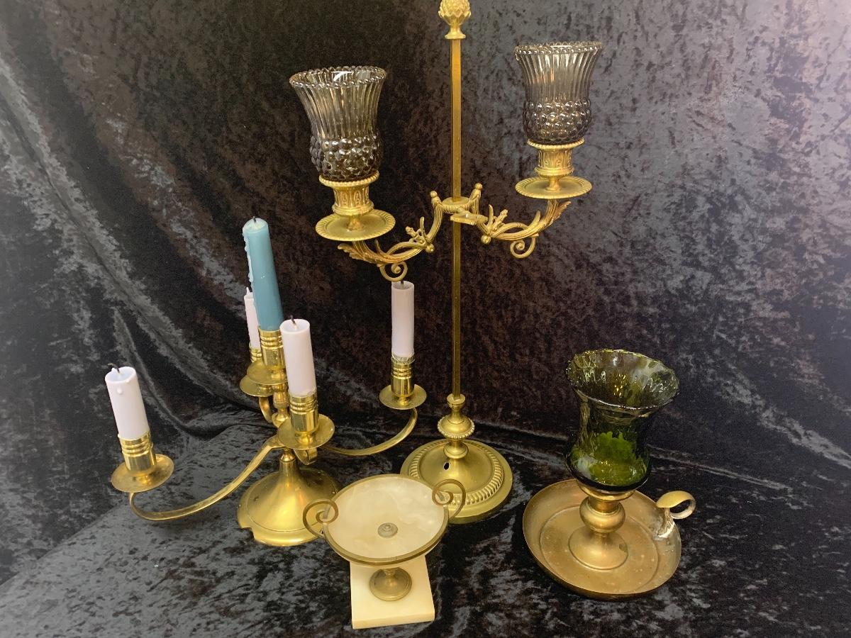 Be sure to zoom in on these exquisite brass candelabras. These are very old a quite elegant. This lot includes a small alabaster trophy dish.
