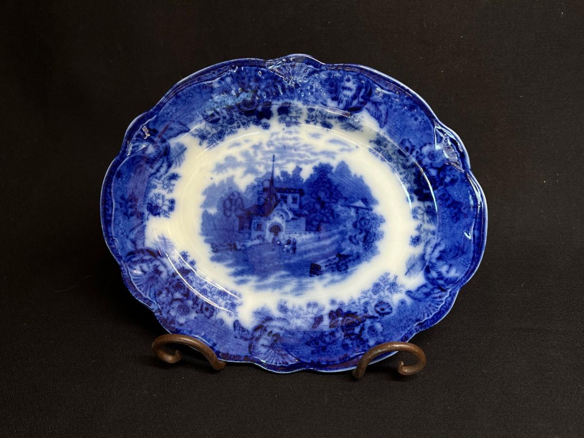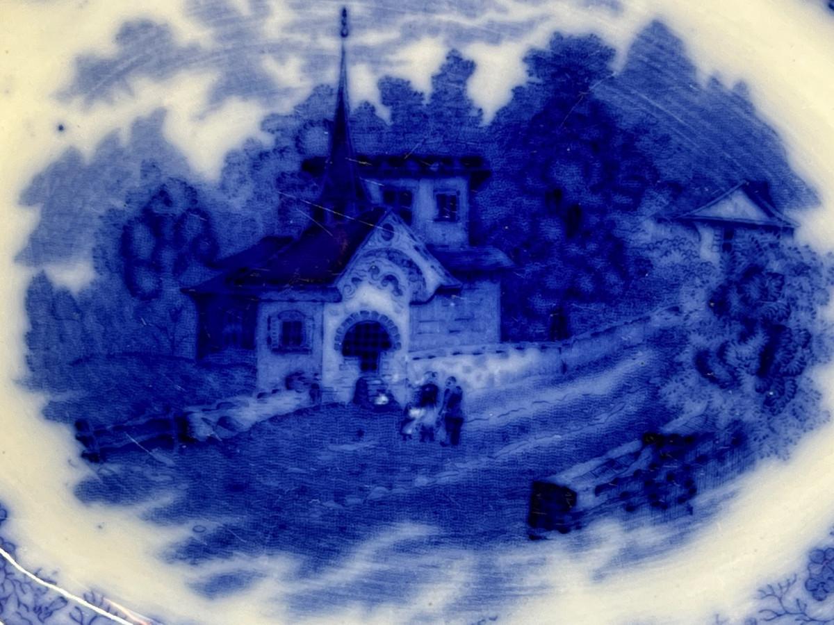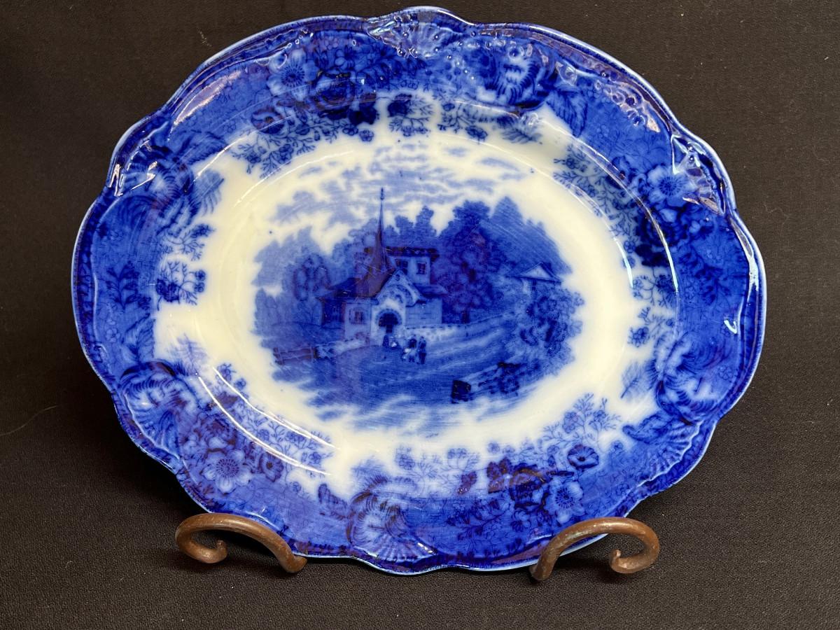 Lovely Antique Flo / Flow Blue Platter Plate Dish Deep Blue Village Country Scene