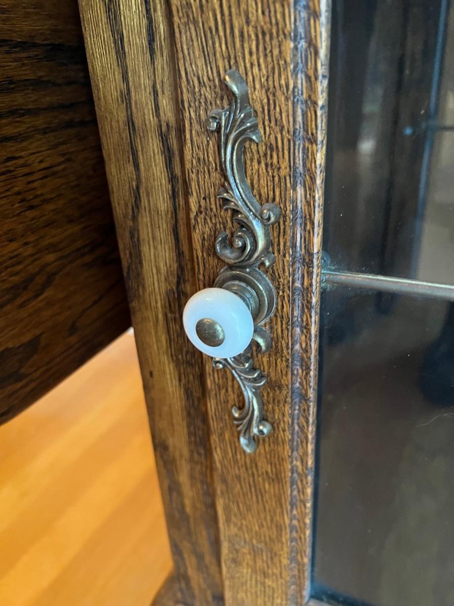 Lovely Antique Rolling Expandable Collapsible Wood Table with Glass Doors Cabinet. One glass door has a crack (shown in images), otherwise good condition.