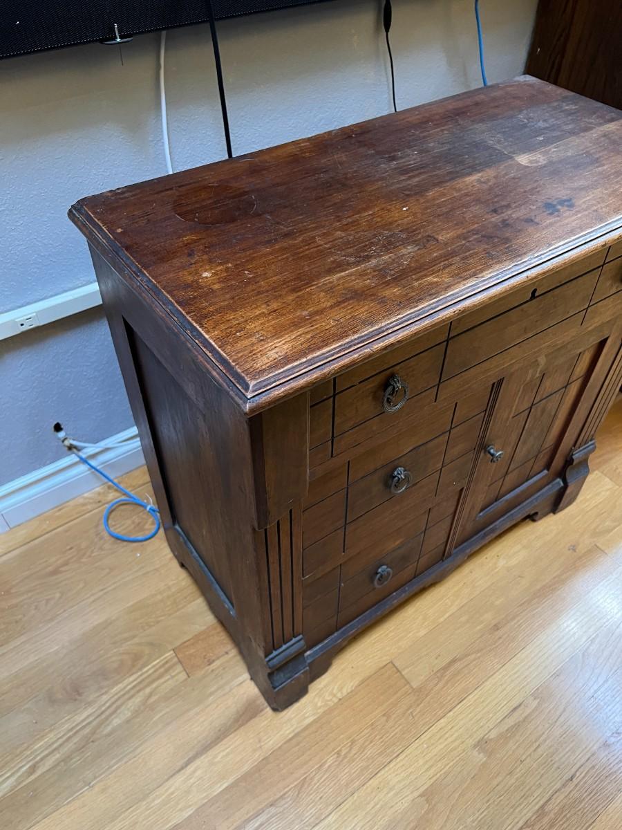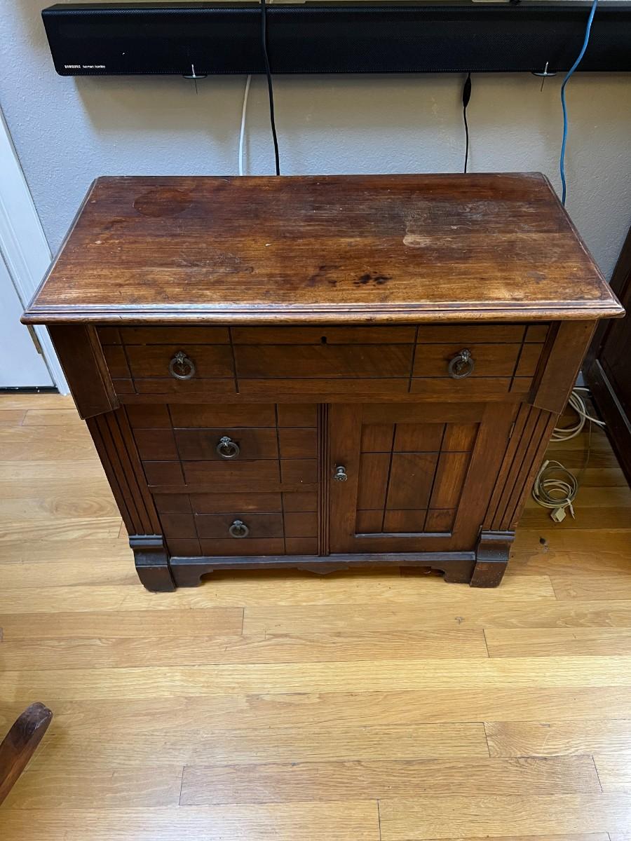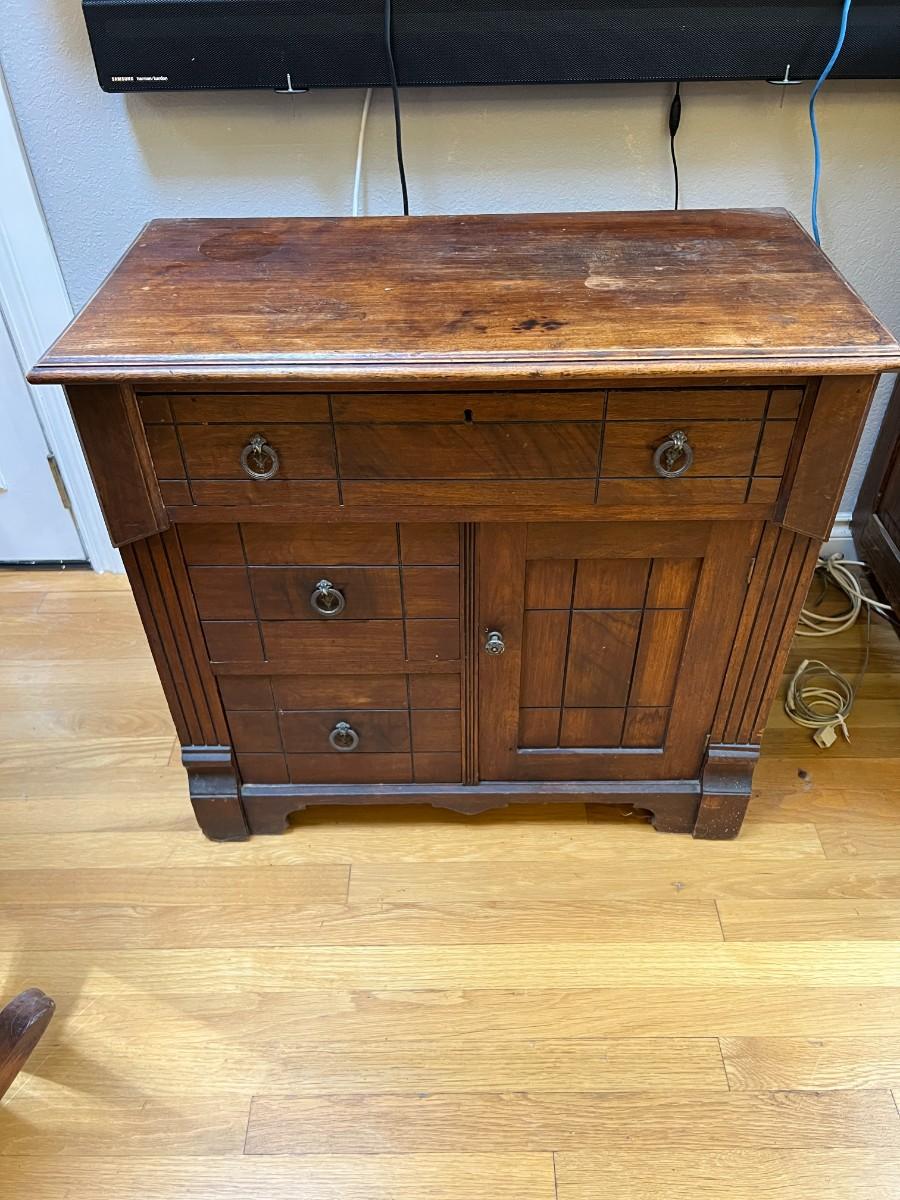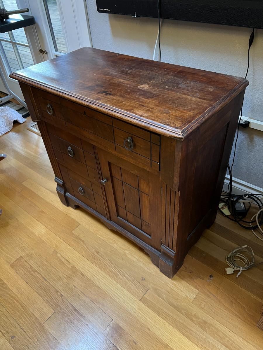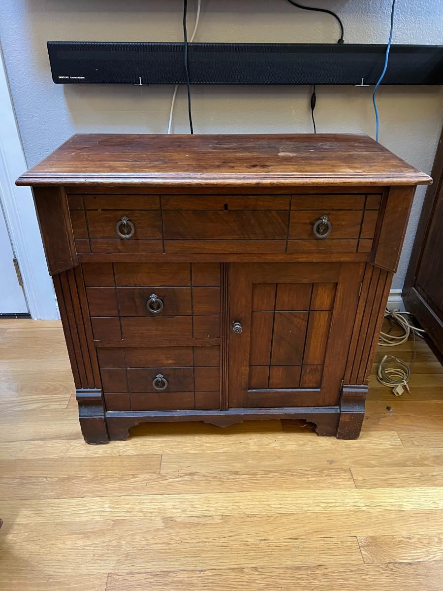 Lovely Antique Wood Cabinet with 3 Drawers and Cabinet
