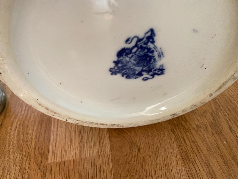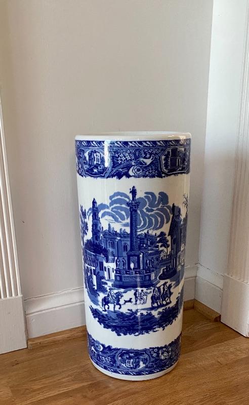 A lovely piece for a porch or a foyer. 18” tall. Is made of heavy ceramic with glaze over blue and white print.