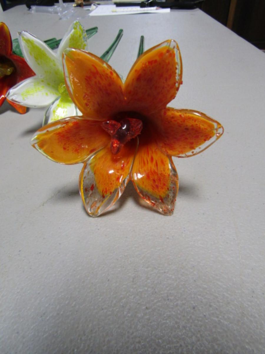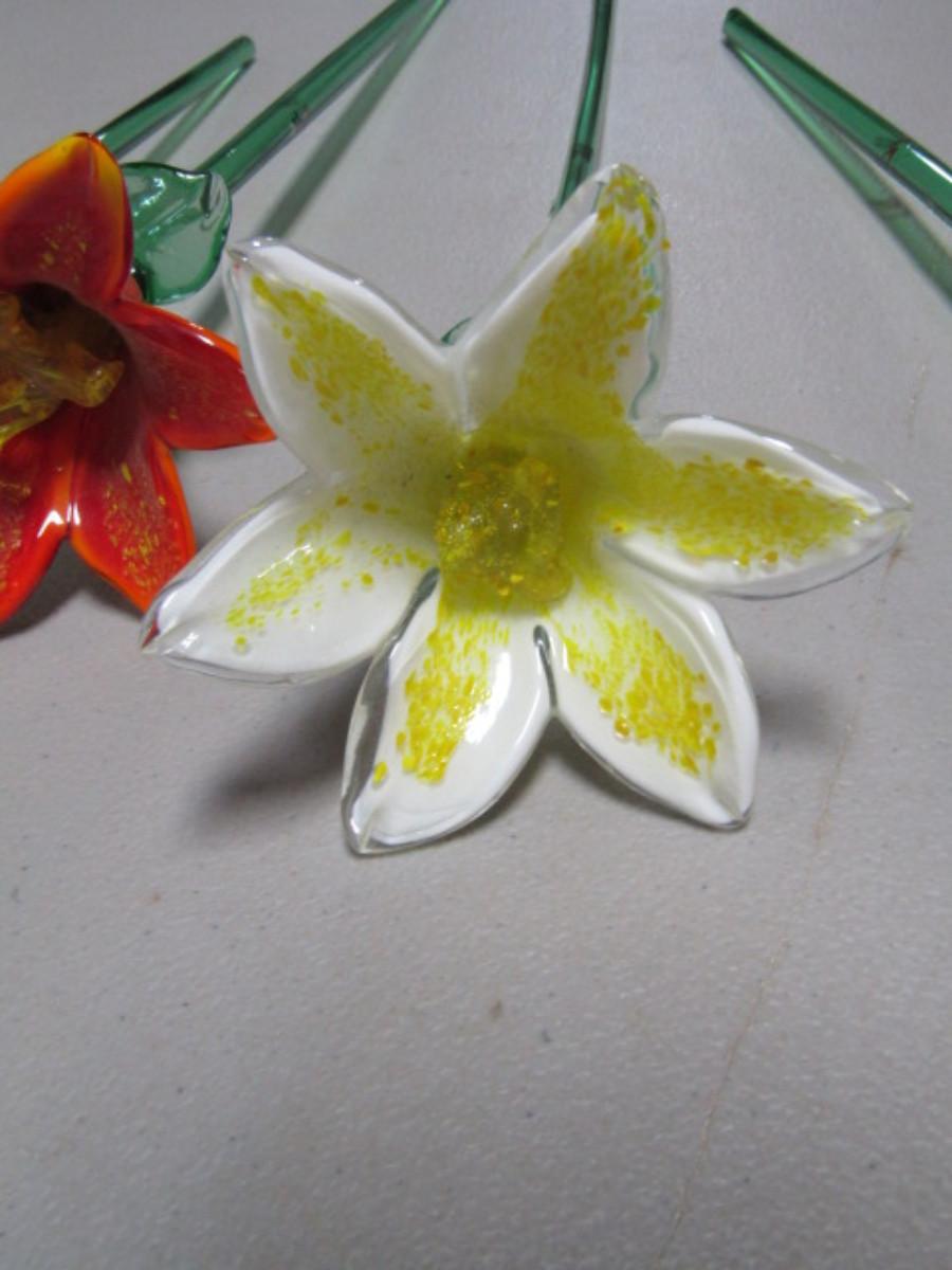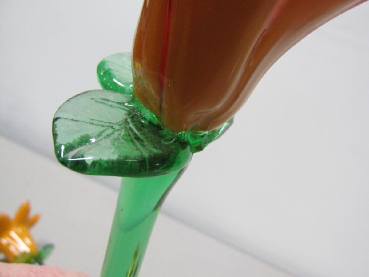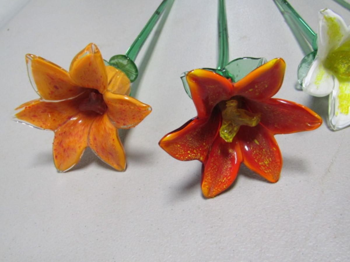Lovely, Colorful Hand Blown Art Glass Flowers. Each is approx. 19 1/2" long. One has a damaged leaf- please see pictures.