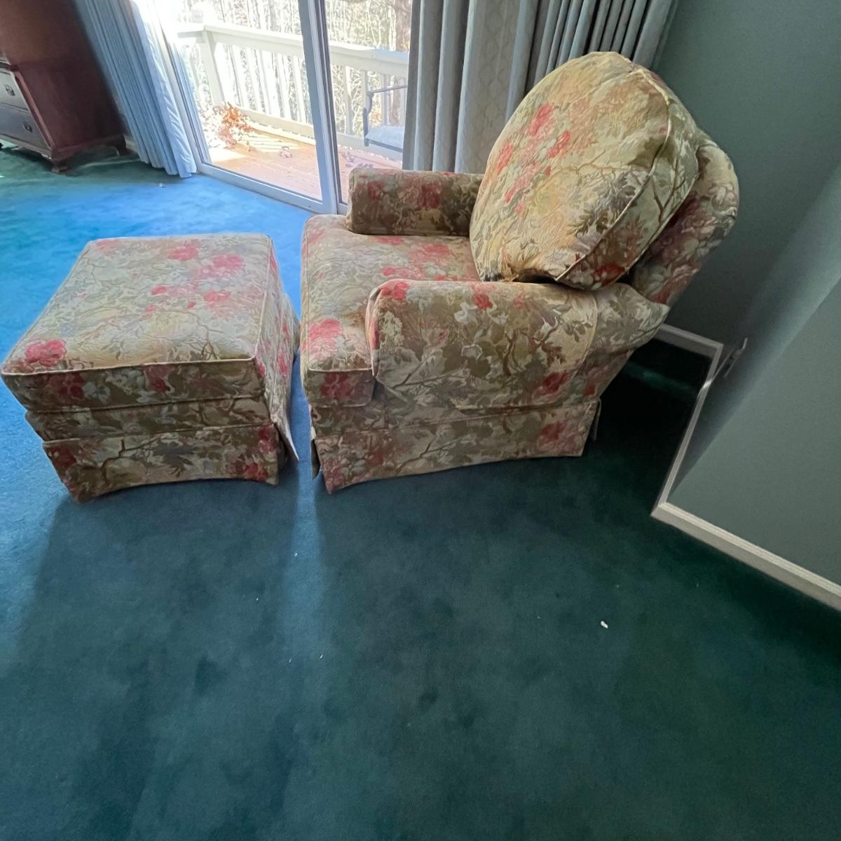 Beautiful club chair and ottoman by Massoud in a calm pastel floral pattern. The back and seat cushion are removable and reversible. The chair has removable arm protectors as well.