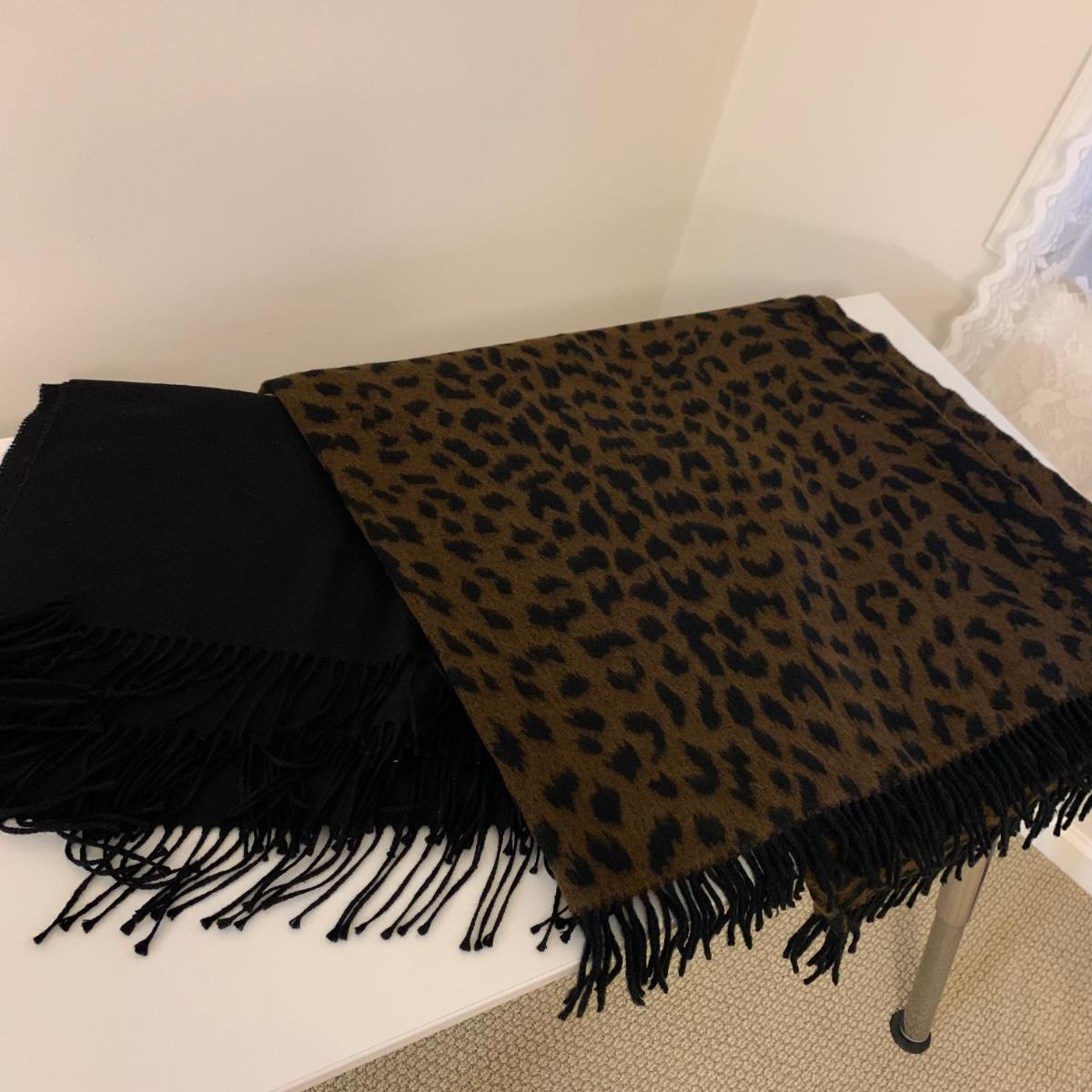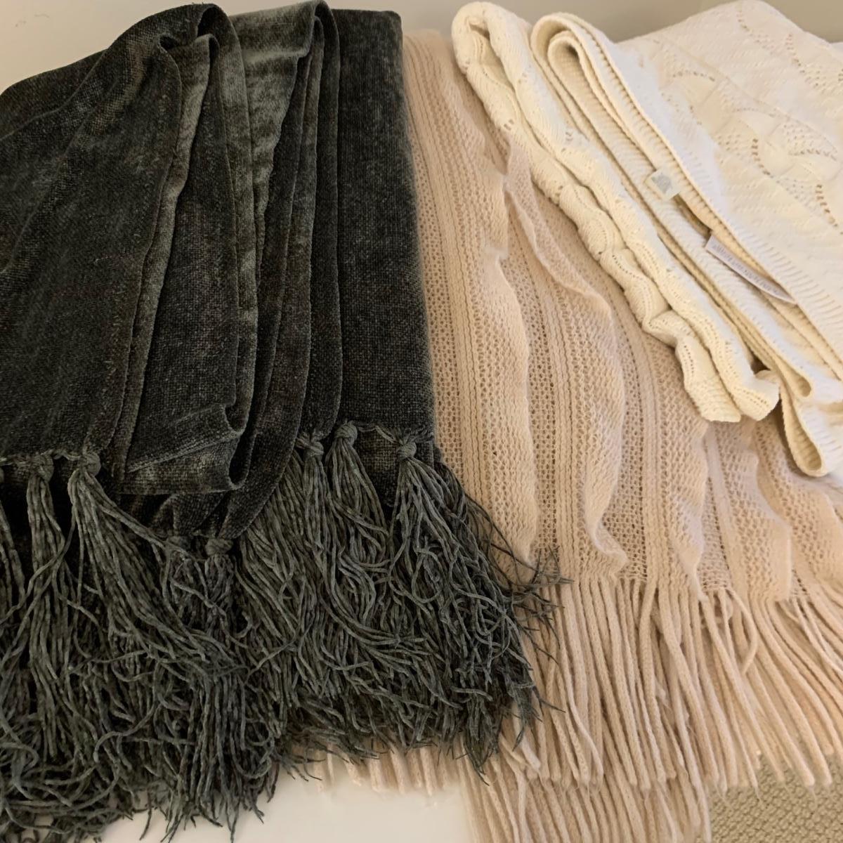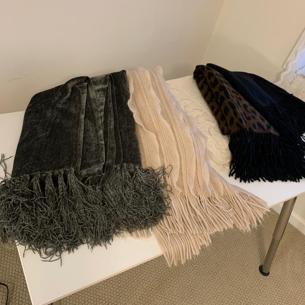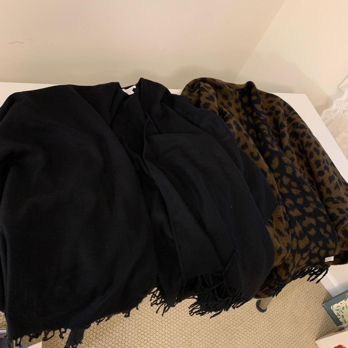A collection of three lovely throw blankets and two luxurious wraps. One throw is a dark green super soft chenille-like material that is about 45” x 60”; its tag has been removed. The light mauve ruffled blanket is by Lauren Conrad. The third blanket is LL Bean. The two large wraps/ponchos are solid black and animal print. One has a Charter Club tag.
