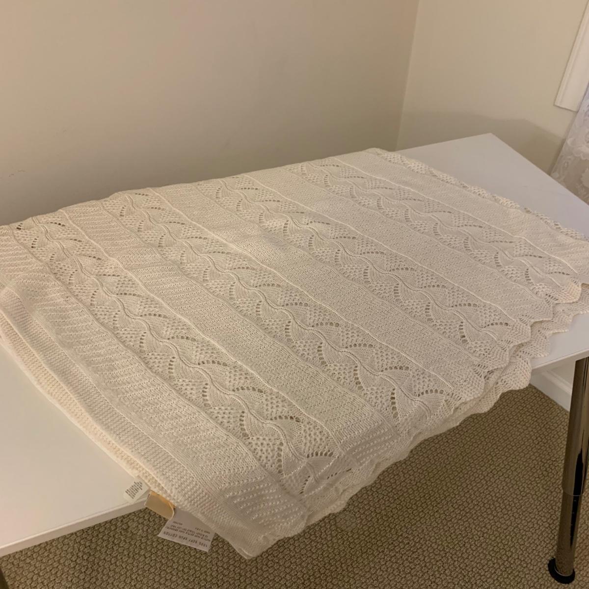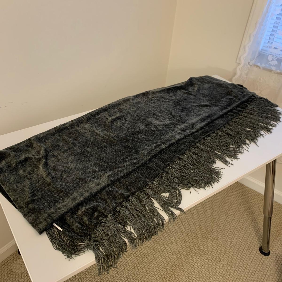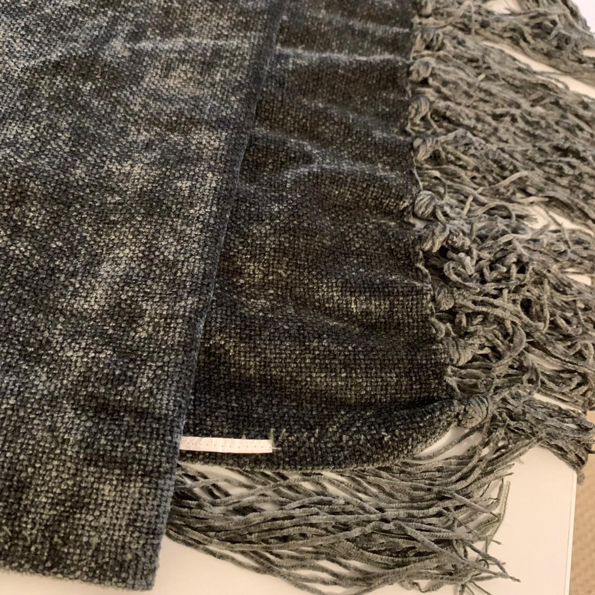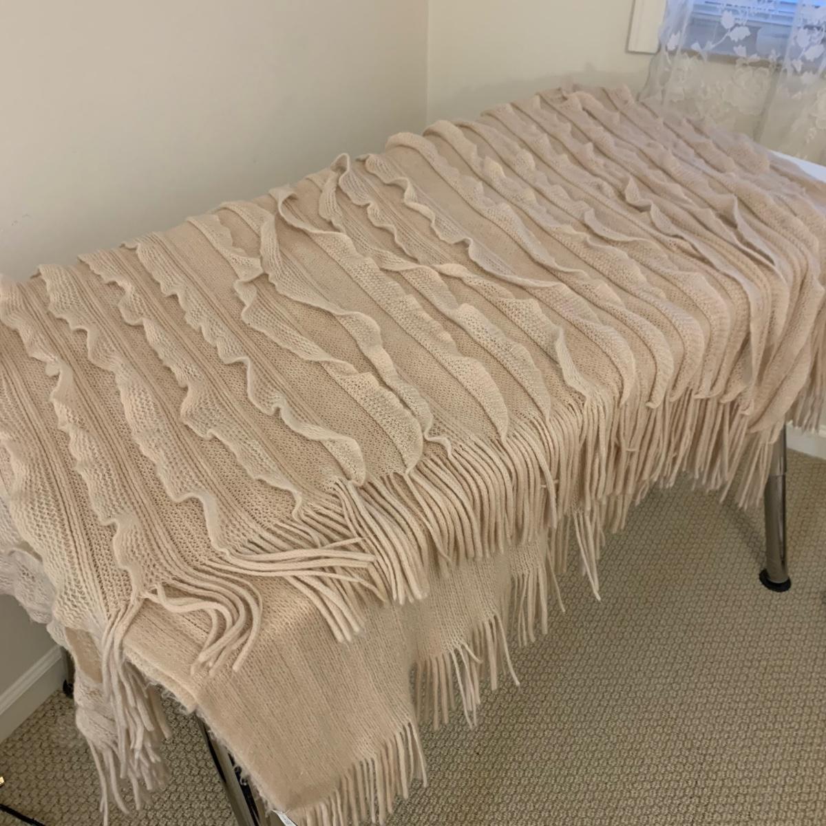 A collection of three lovely throw blankets and two luxurious wraps. One throw is a dark green super soft chenille-like material that is about 45” x 60”; its tag has been removed. The light mauve ruffled blanket is by Lauren Conrad. The third blanket is LL Bean. The two large wraps/ponchos are solid black and animal print. One has a Charter Club tag.