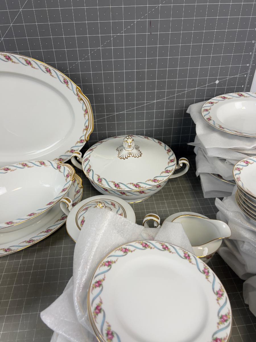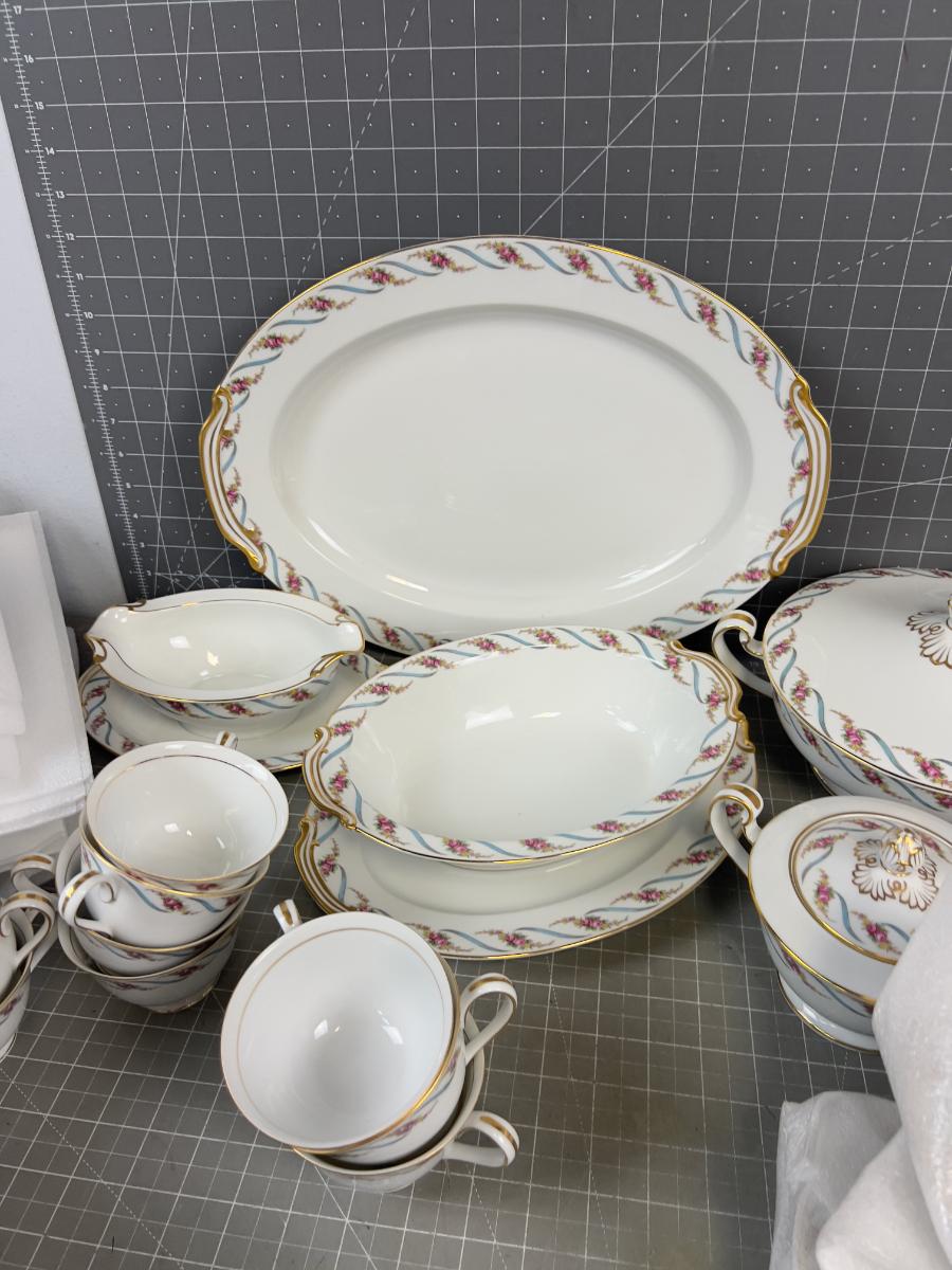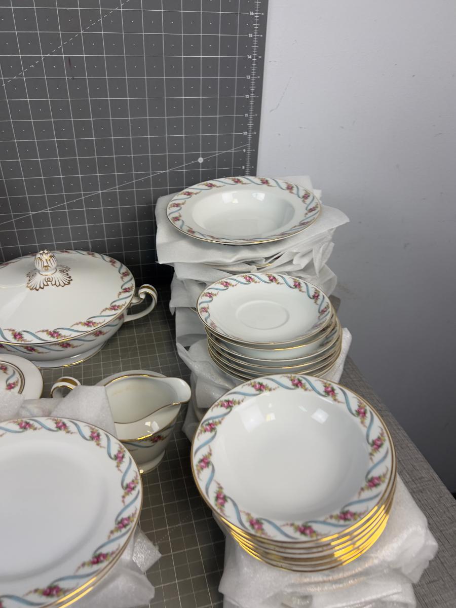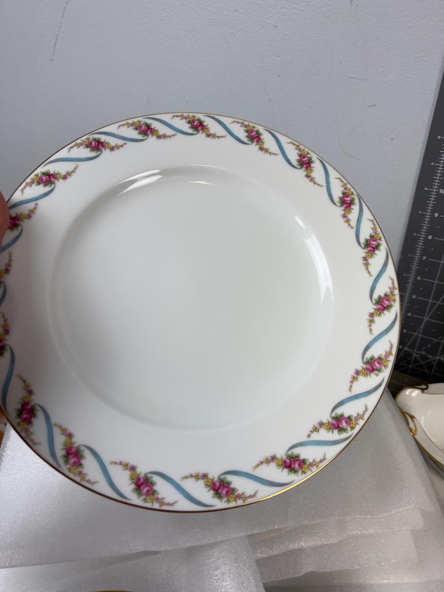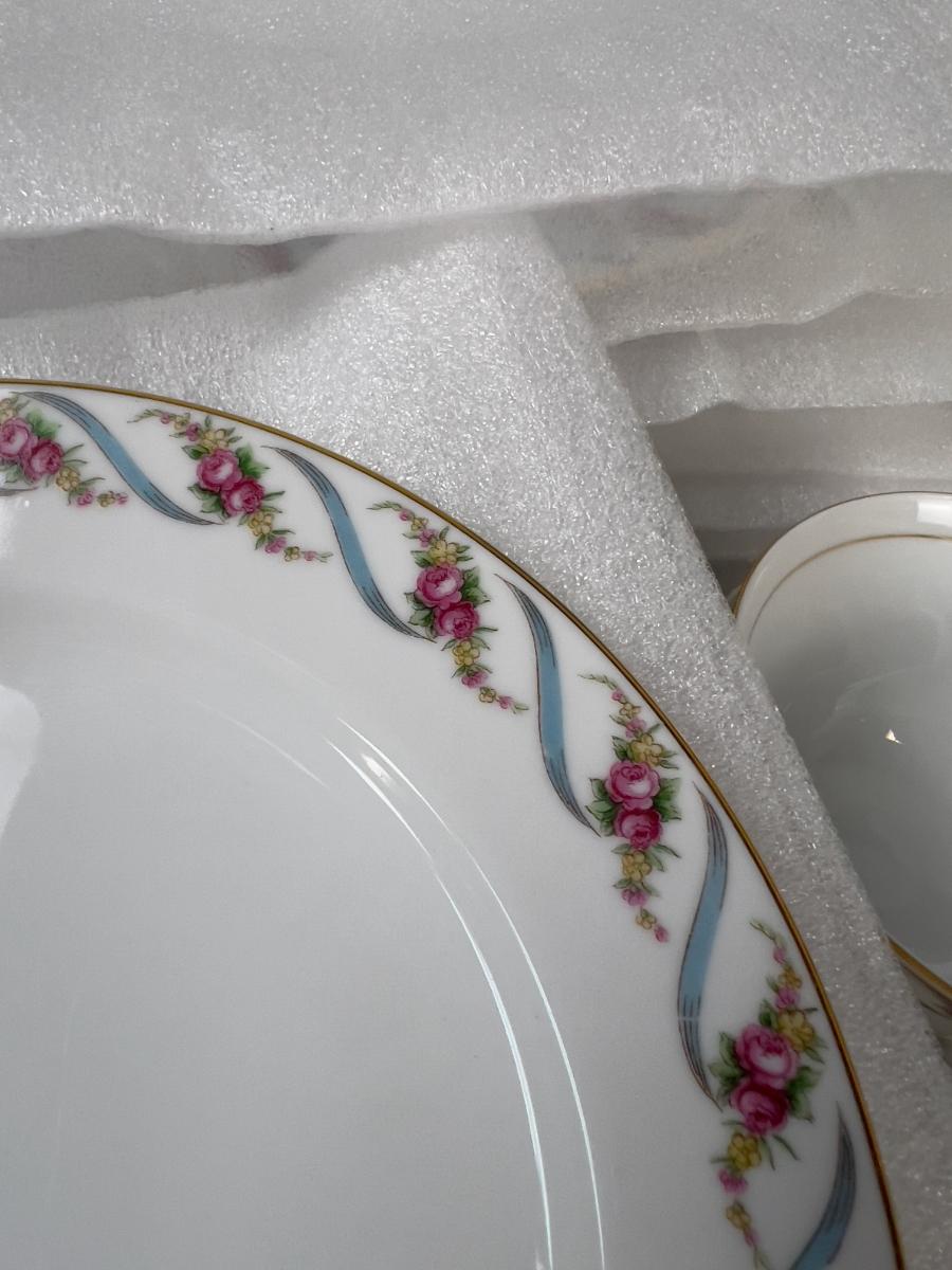 Lovely Noritake Set of China, Light Blue Ribbon and Pick Roses Service for 12 @ 7 Piece each plus 7 Serving