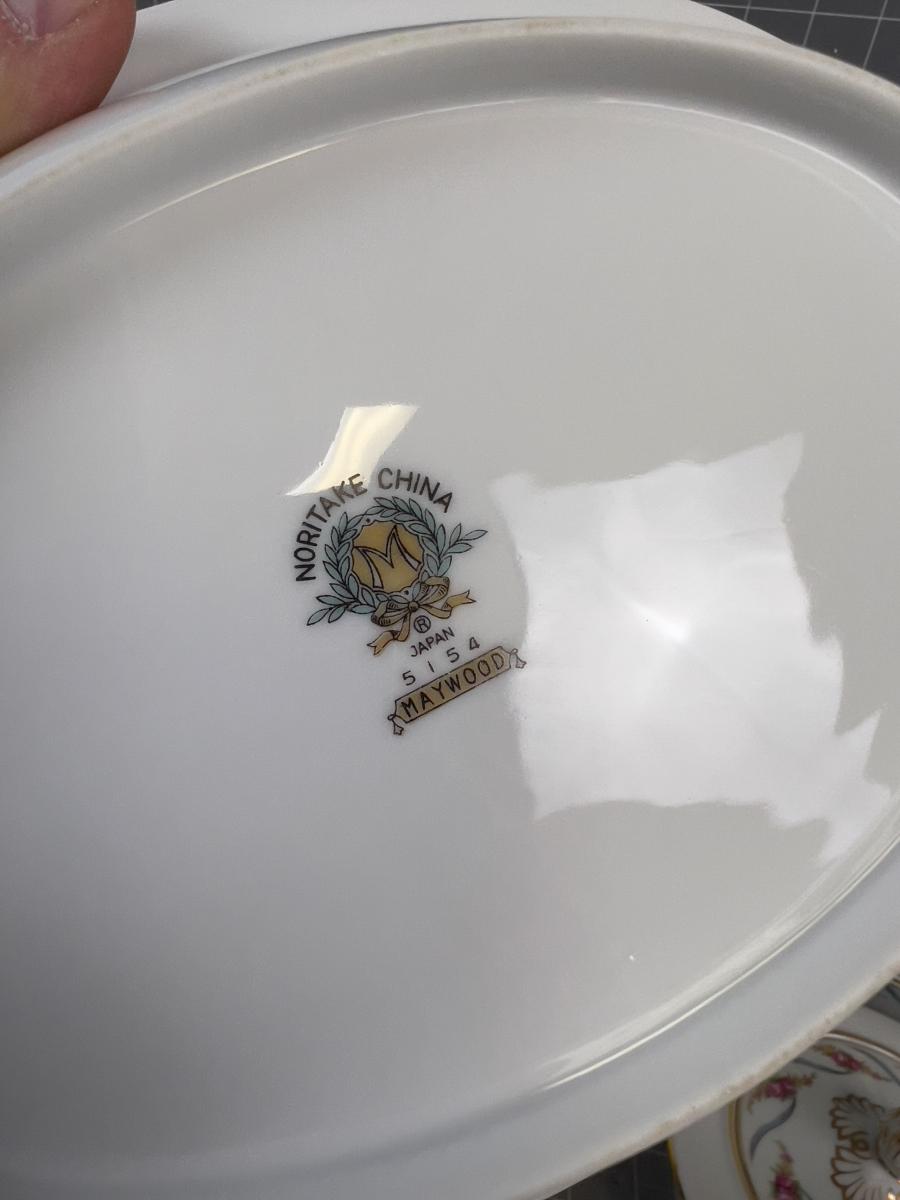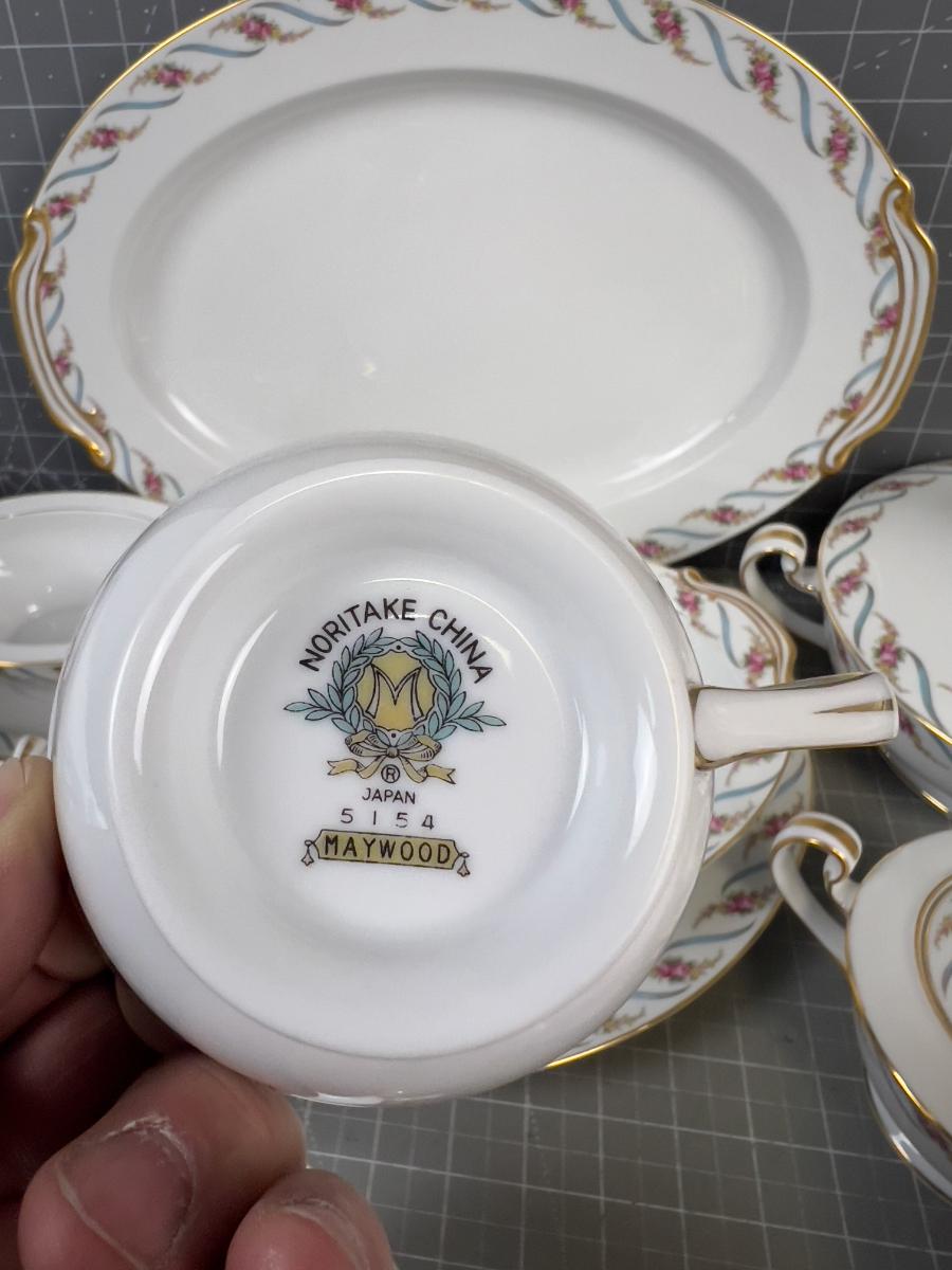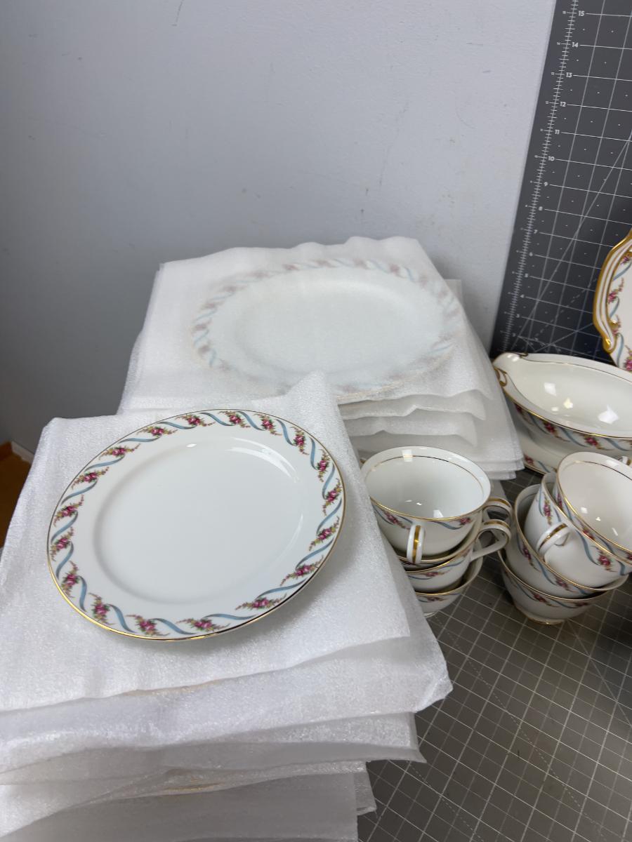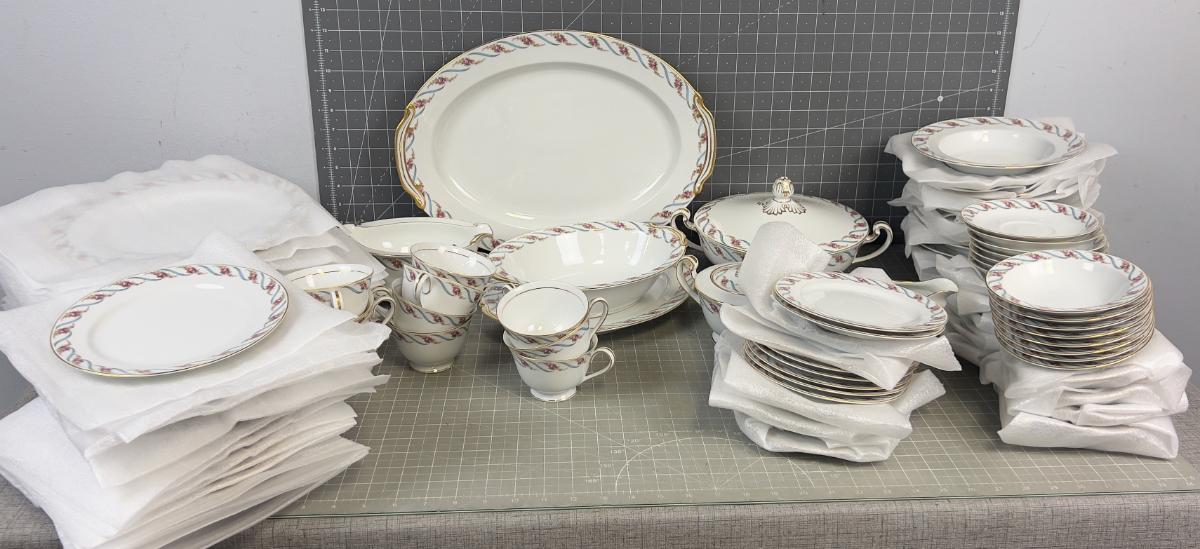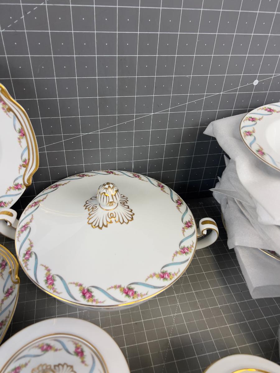 Lovely Noritake Set of China, Light Blue Ribbon and Pick Roses Service for 12 @ 7 Piece each plus 7 Serving