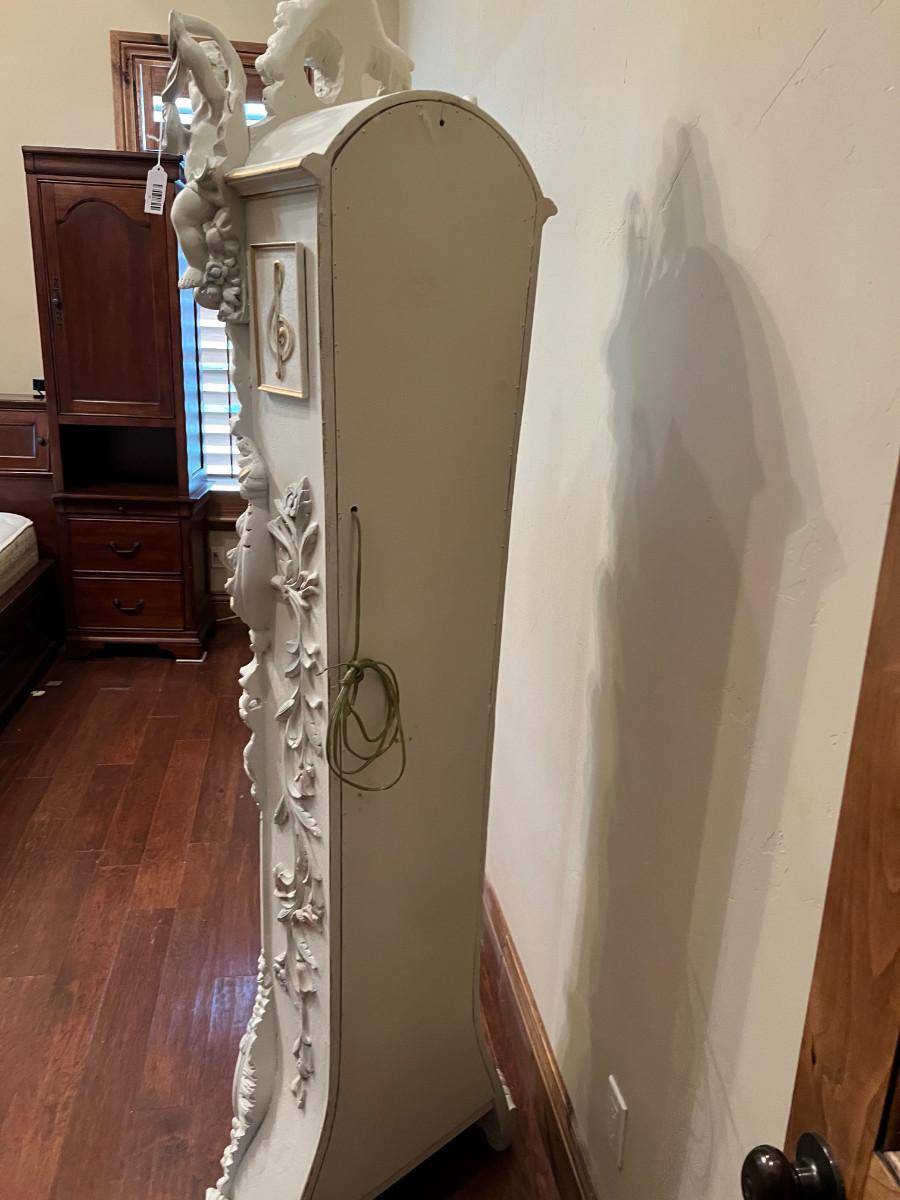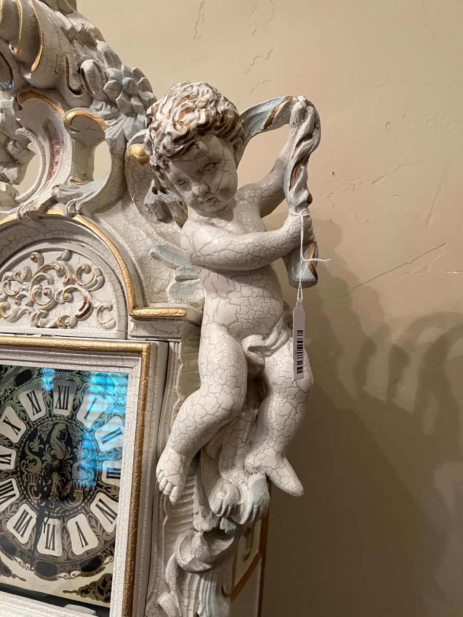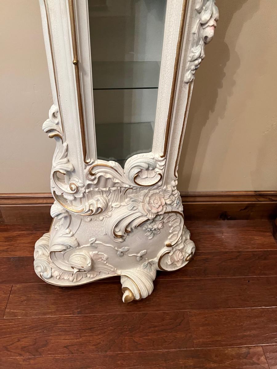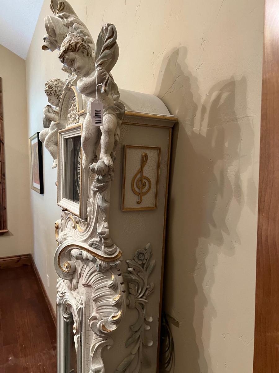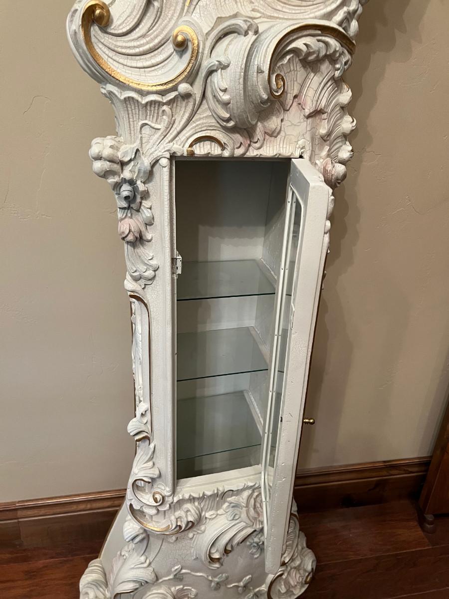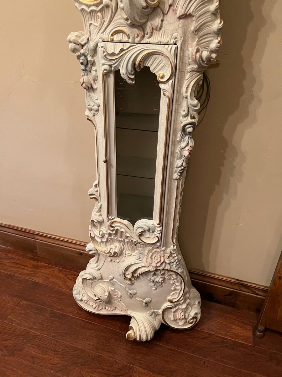 Distressed crackle paint, cherubs and scrolly accents. electric clock needs new plug. 80" tall, 20" wide 13" deep. Also has curio shelves.