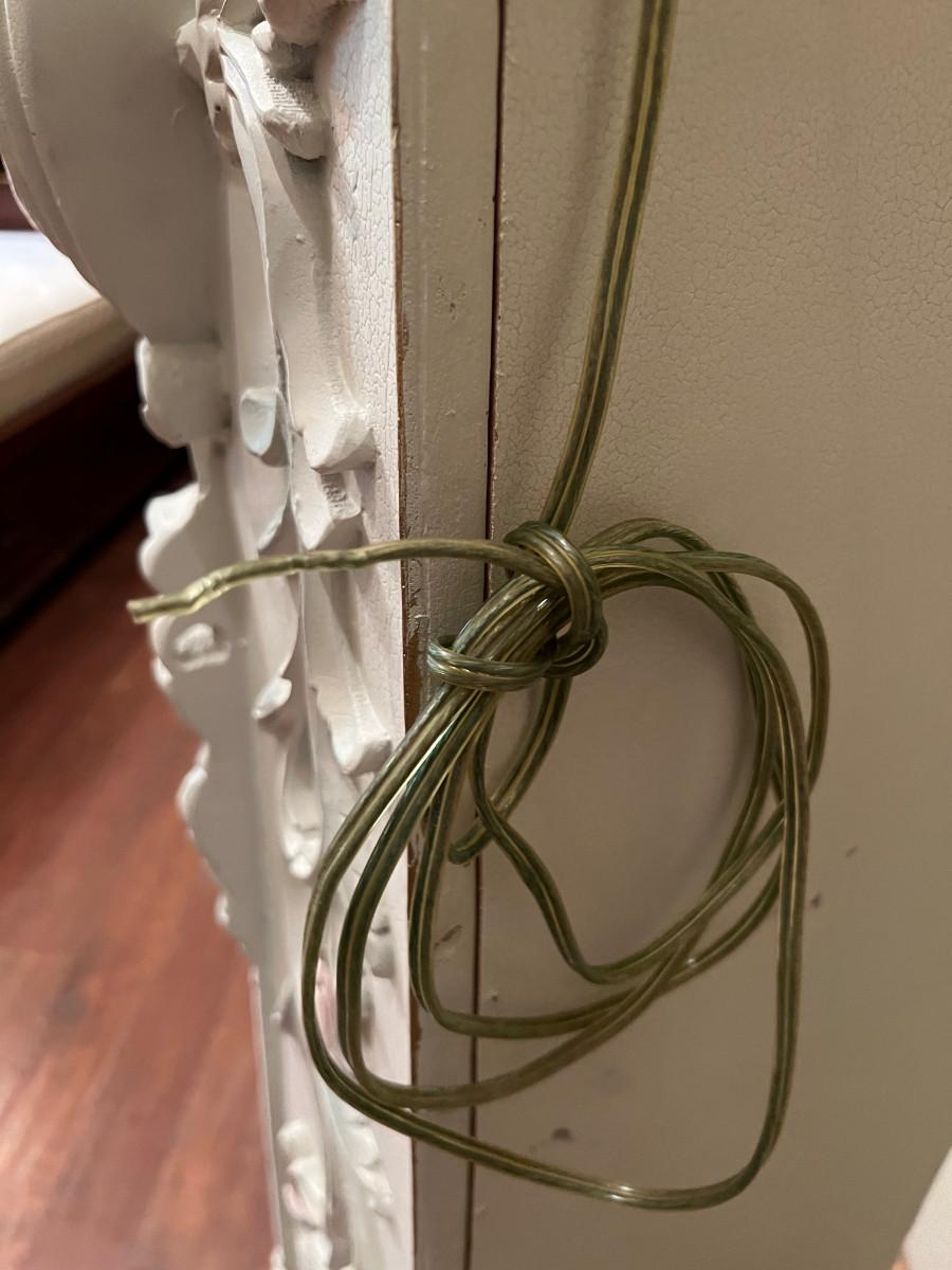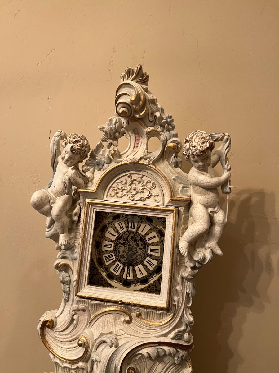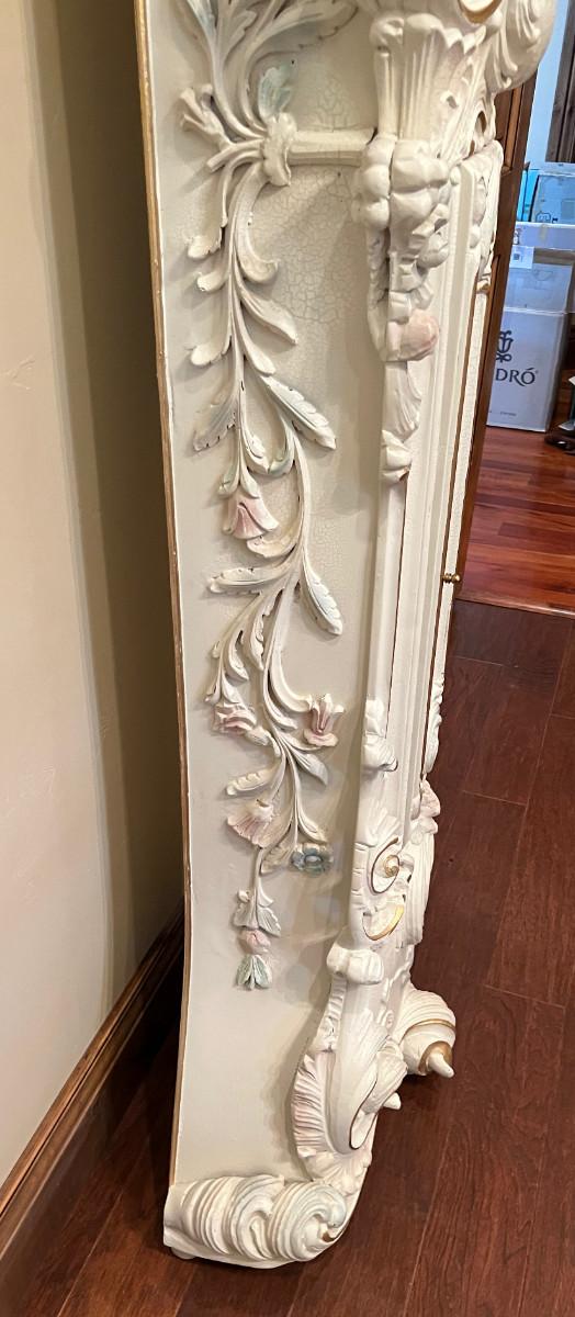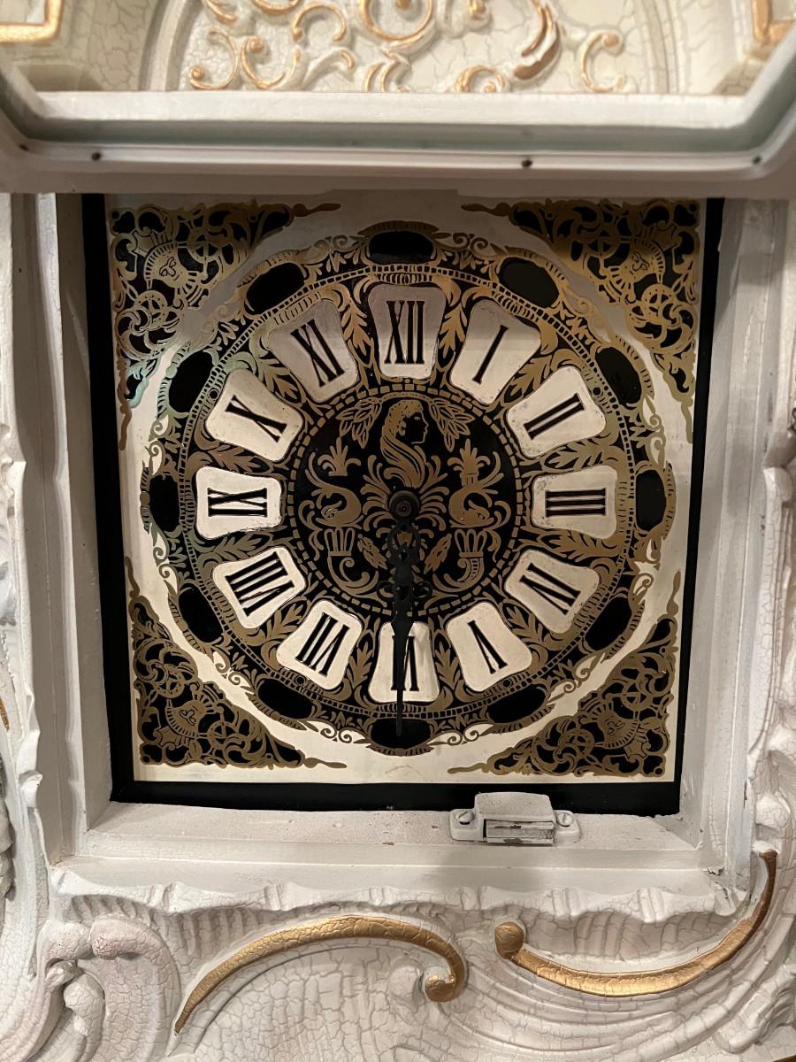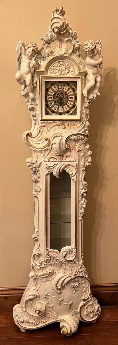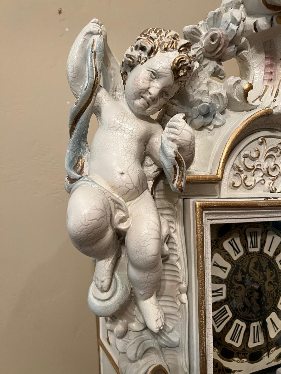 Distressed crackle paint, cherubs and scrolly accents. electric clock needs new plug. 80" tall, 20" wide 13" deep. Also has curio shelves.