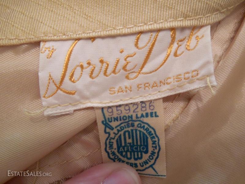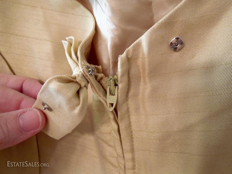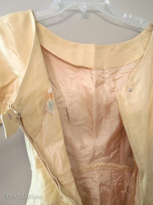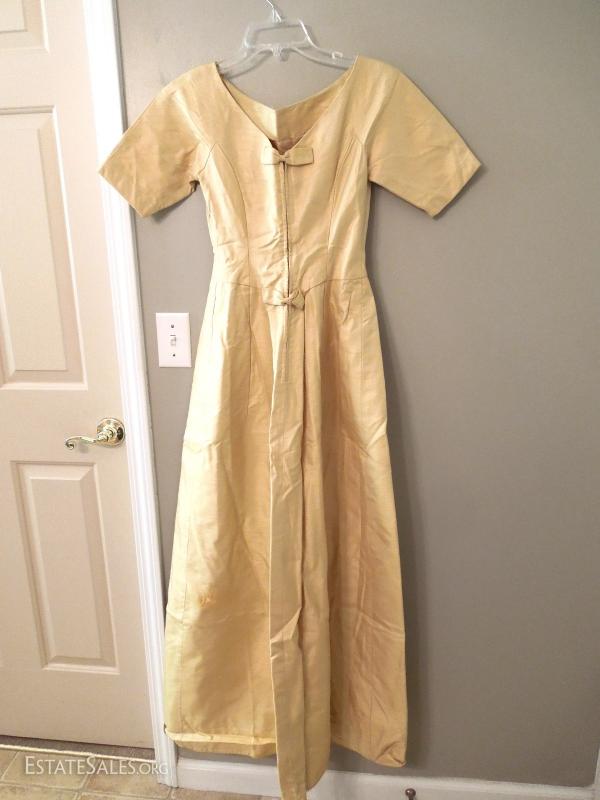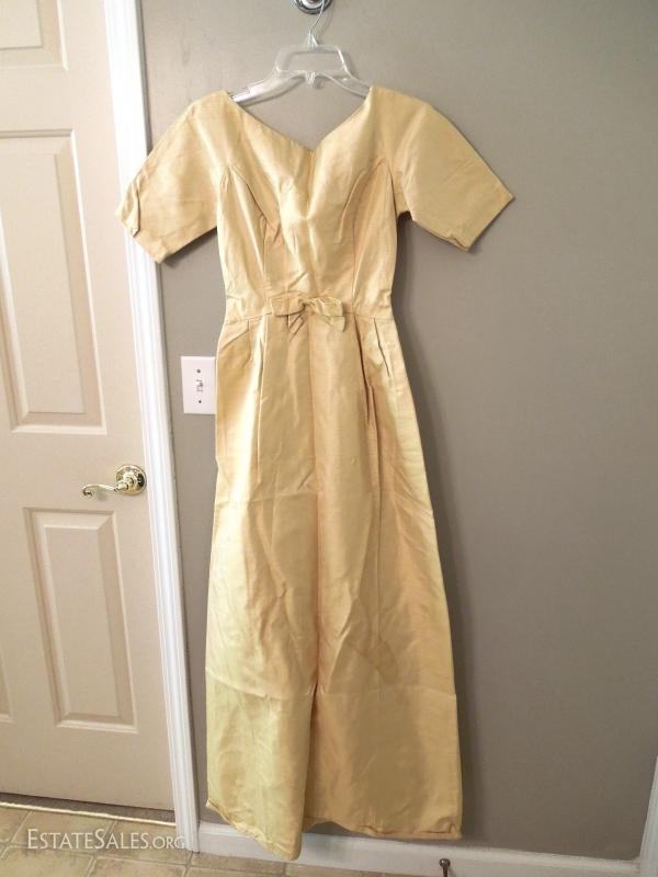 Designed by Lorie Deb. Early 50's. Hand tacked inner lining. Snug fitting vintage yellow gold raw silk lined long formal dress. Petite bow front and back. Zipper not stuck. 24" waist and 33" bust. Has two approx. 10" wide stains at knee level on front side. No odor. Needs pressing. Very wonderful and otherwise in great condition.
