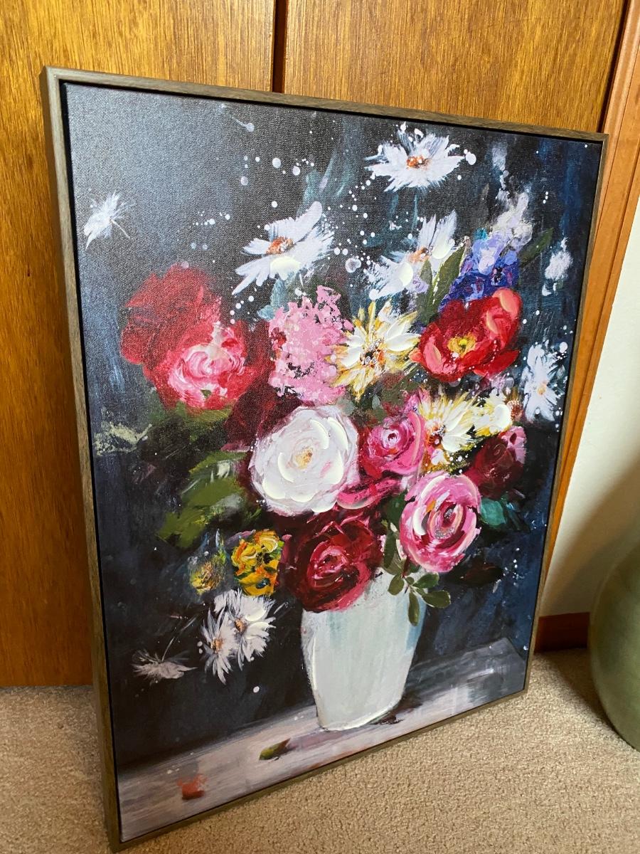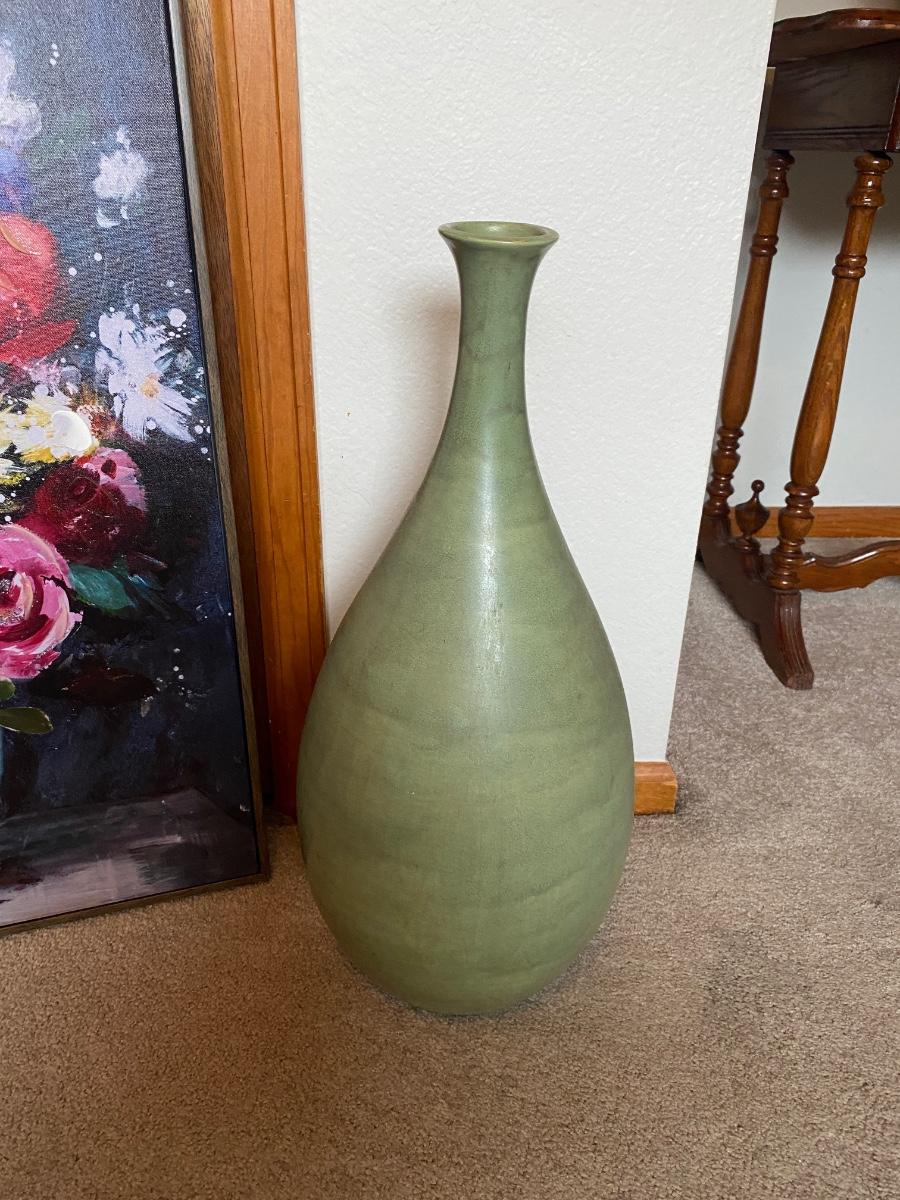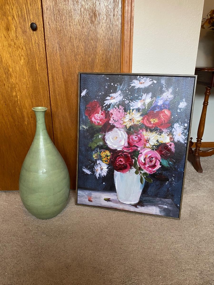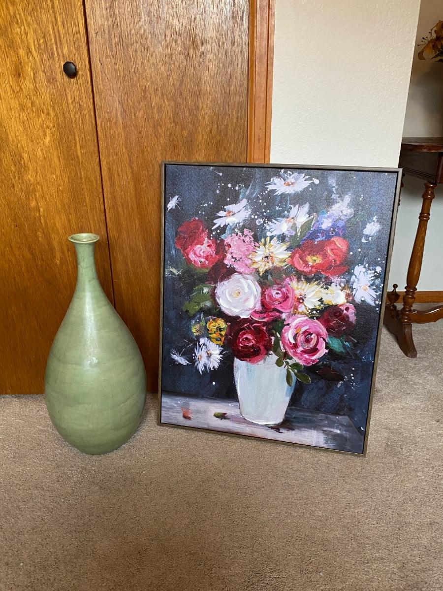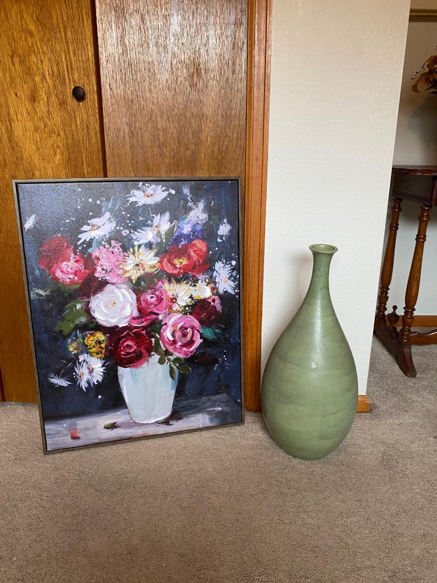 LOVELY TALL GREEN VASE AND FLORAL PAINTING