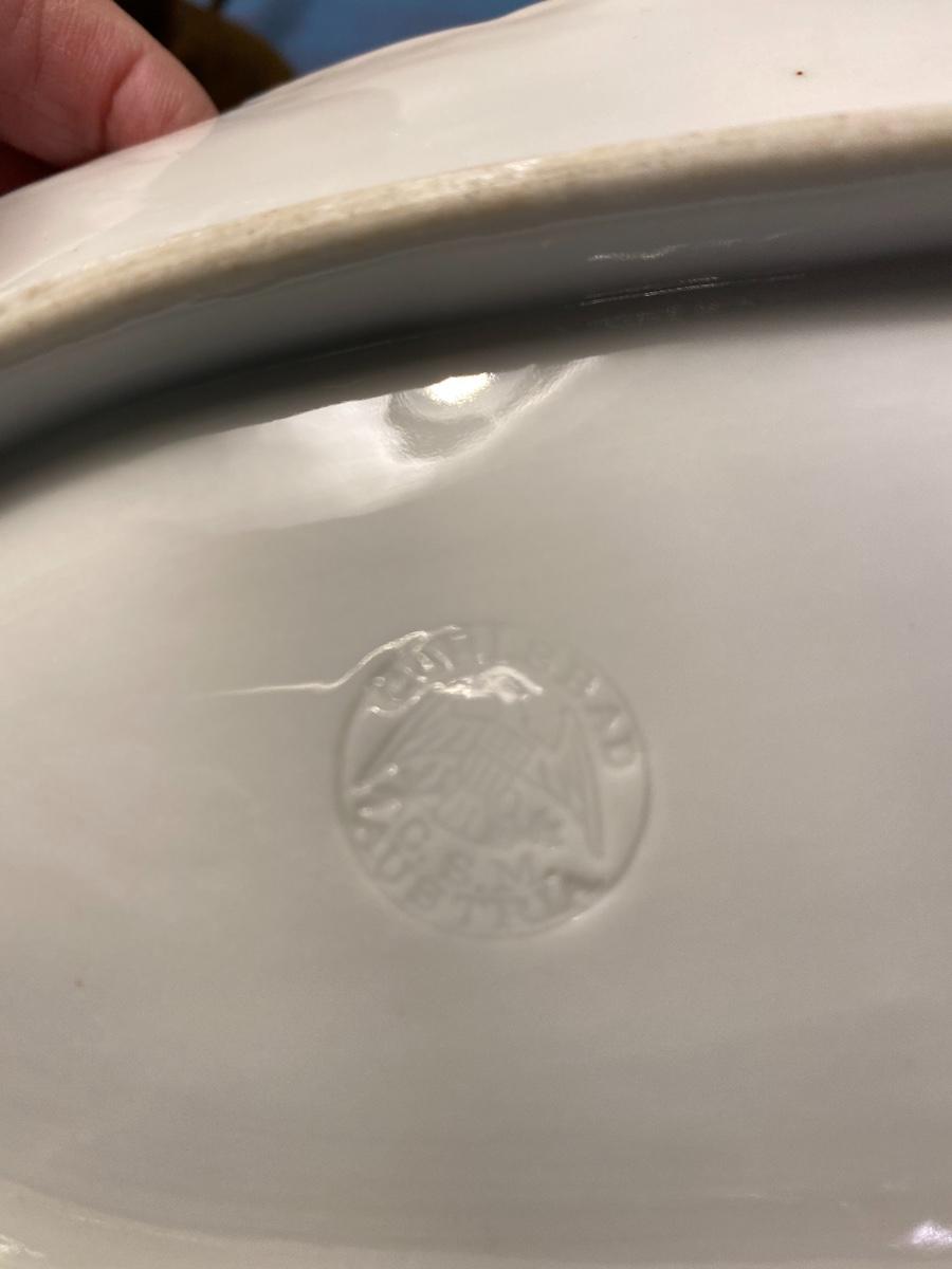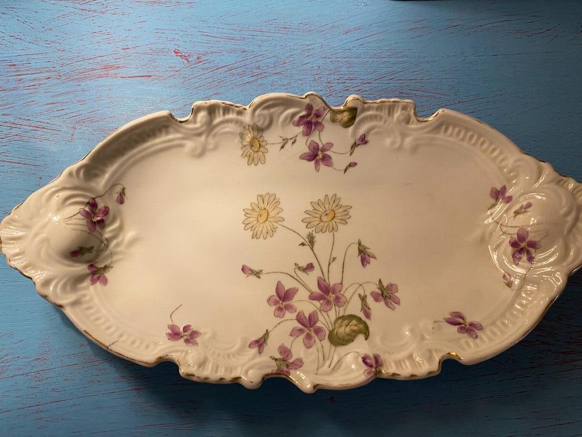 Lovely vintage porcelain dish with violets, signed Carlsbad Austria. 12” x 6” x 1 1/2”H. Great condition